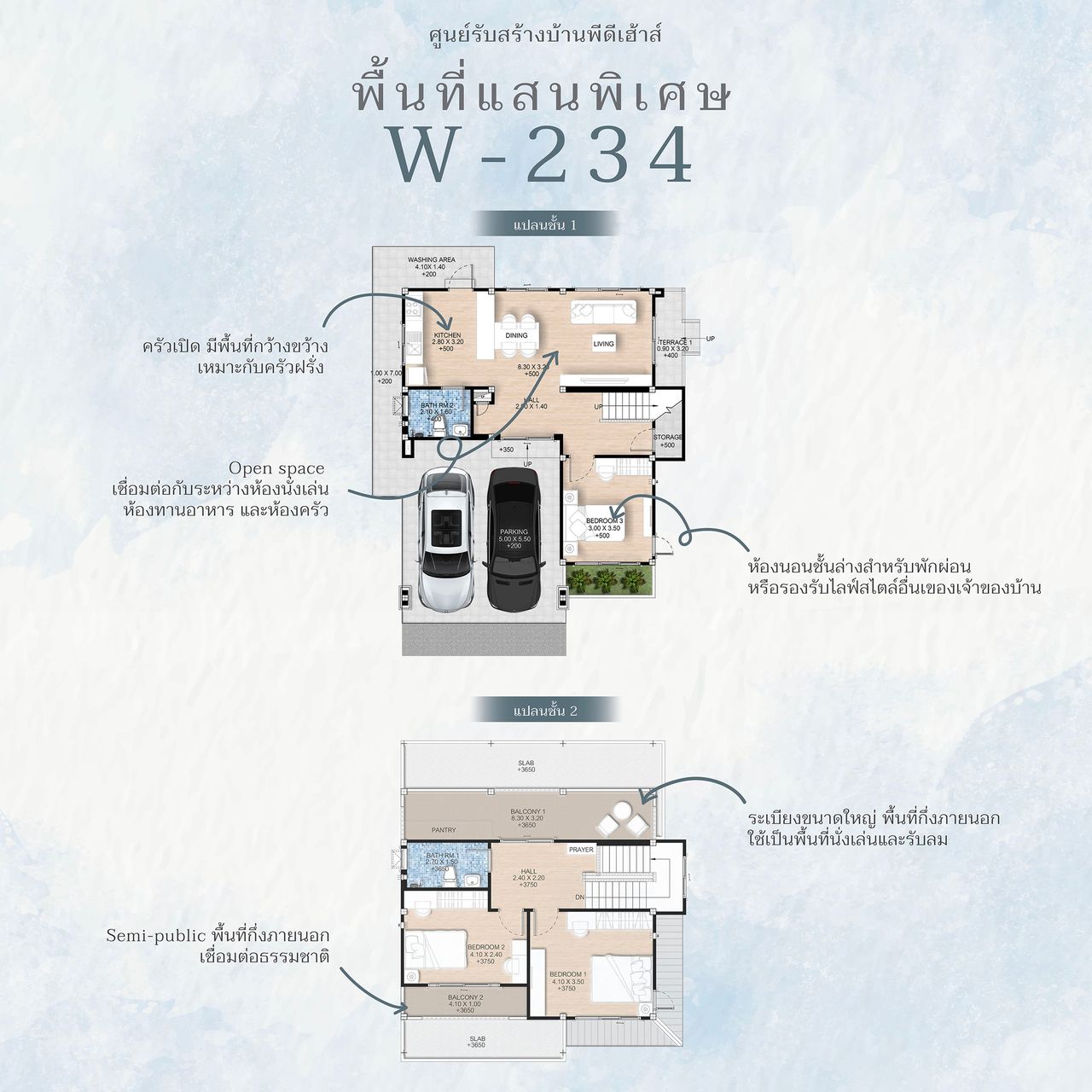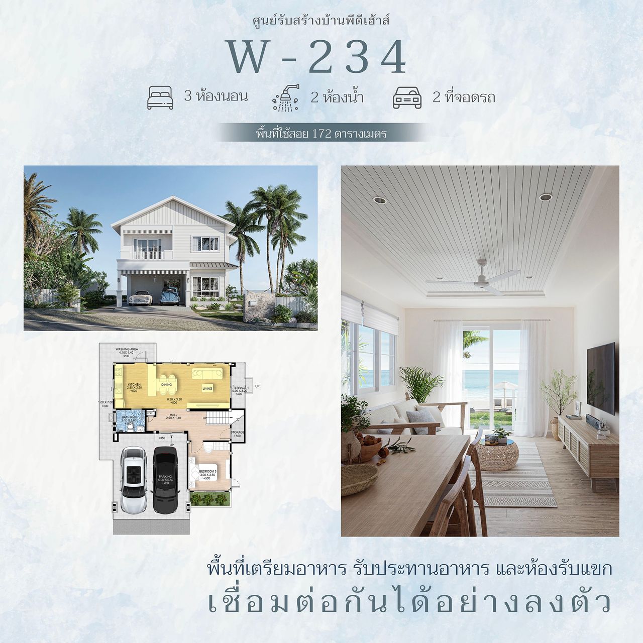 แบบบ้านที่เหมาะสำหรับที่ดินด้านเท่า ตัวบ้านโดยถูกถอดแบบมาจากบ้านพักริมทะเลที่มีกลิ่นอายความวินเทจหรือความคลาสสิกผสมผสานอยู่ ดูมีเสน่ห์ชวนหลงใหลในบรรยากาศแบบย้อนยุค ส่วนฟังก์ชันภายในถูกออกแบบให้สอดรับกับการใช้งานและพื้นที่เตรียมอาหาร, รับประทานอาหารและห้องรับแขกเชื่อมต่อกันได้อย่างลงตัว ชั้นล่างมีห้องนอนไว้สำหรับพักผ่อนหรือสำหรับรองรับผู้สูงอายุ ส่วนชั้นบนออกแบบให้มีโถงกว้างที่เชื่อมต่อห้องนอนทั้ง 2 ห้องและระเบียงขนาดใหญ่ที่สามารถจัดเป็นมุมนั่งเล่นเพื่อชมบรรยากาศภายนอกได้อย่างสะดวกสบาย