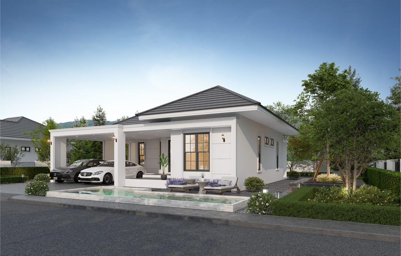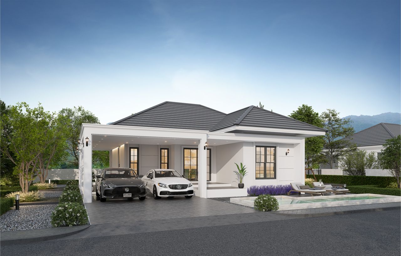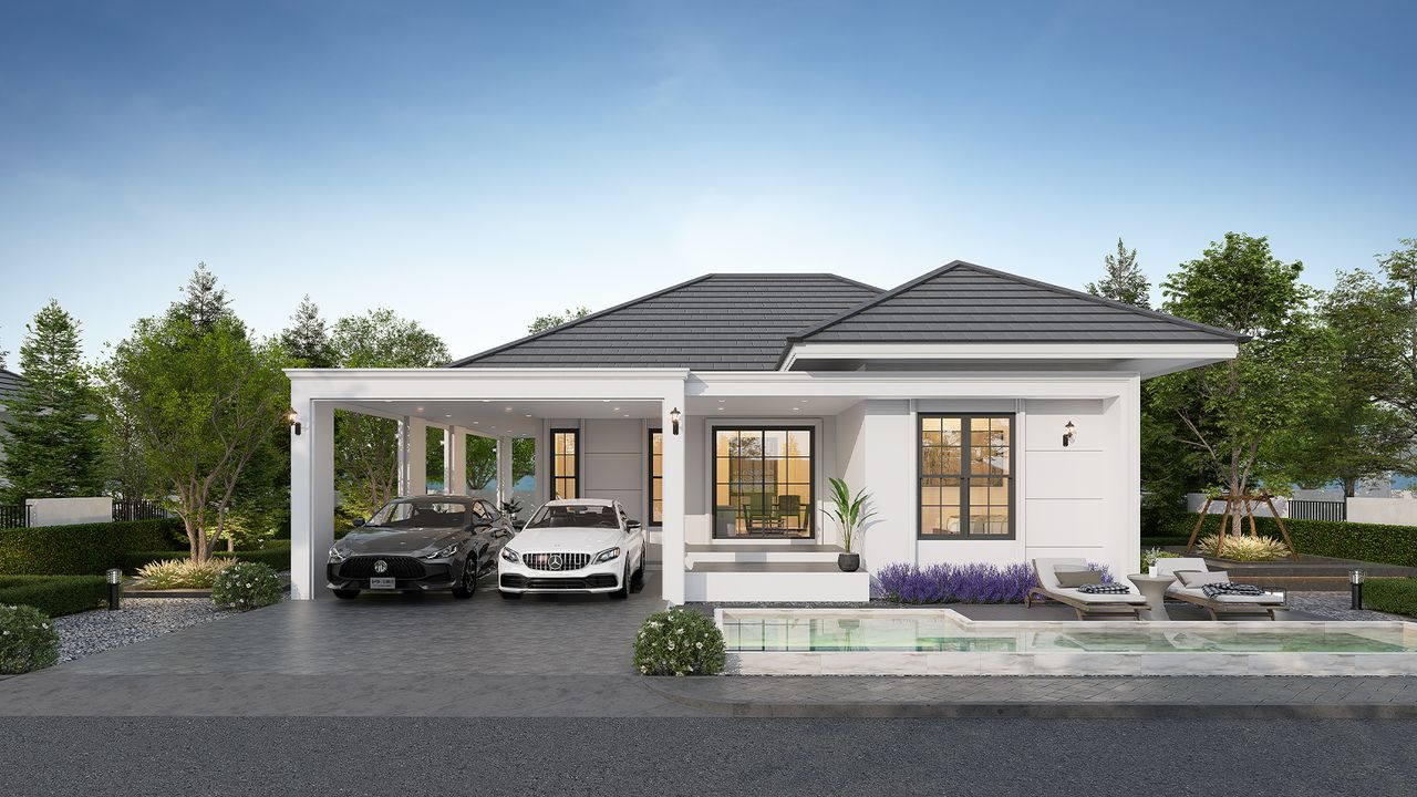 แบบบ้านชั้นเดียว 1 ชั้น 3 ห้องนอน 2 ห้องน้ำ จอดรถได้ 2 พื้นที่ใช้สอย 156 ตารางเมตร