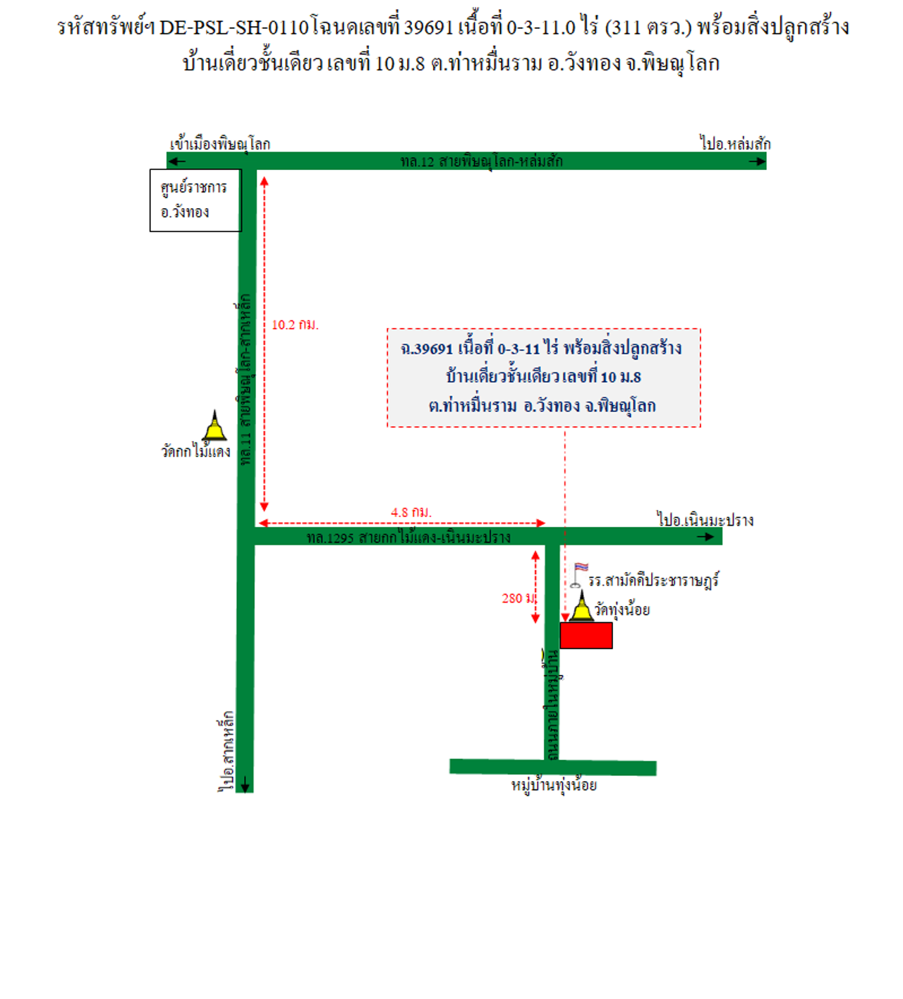 ที่ตั้ง : บ้านเดี่ยวชั้นเดียว เลขที่ 10 ม.8 ต.ท่าหมื่นราม อ.วังทอง จ.พิษณุโลก ติดถนนสาธารณะภายในหมู่บ้าน คสล.กว้าง 6 ม. แยกจากถนนสายกกไม้แดง-เนินมะปราง(ทล.1295)ประมาณ 280 ม.