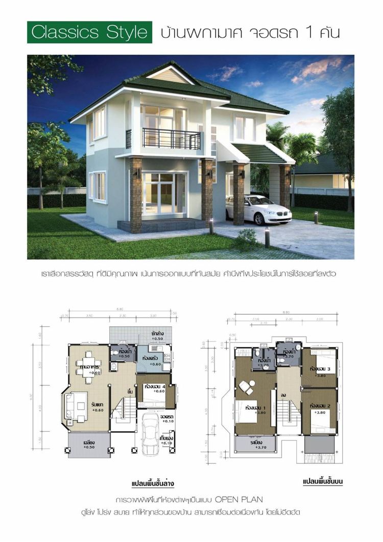 - บ้านเดี่ยว 2 ชั้น 3 ห้องนอน 3 ห้องน้ำ จอดรถ 1 คัน พื้นที่ใช้สอย 165 ตรม.