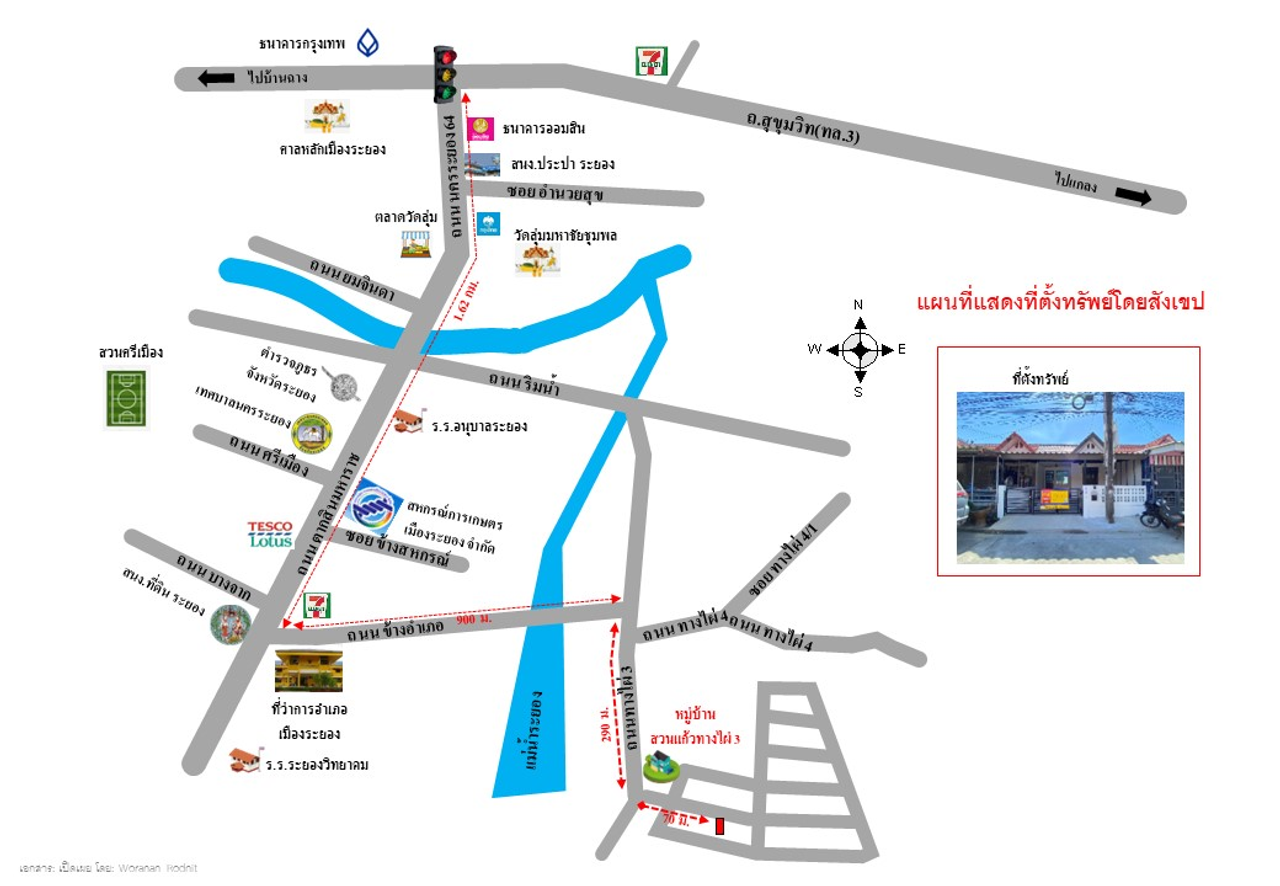 ที่ตั้ง : เลขที่ 23/166 หมู่บ้านสวนแก้วทางไผ่ 3 ถนนทางไผ่ 3 จากถนนตากสินมหาราช มุ่งหน้าสู่ถนนข้างอำเภอเมืองระยอง ตรงไปประมาณ 900 ม. เลี้ยวขวาเข้าสู่ถนนทางไผ่ 3 ตรงไปประมาณ 290 ม. เลี้ยวซ้ายเข้าสู่หมู่บ้านสวนแก้วทางไผ่ 3 ตรงไปประมาณ 70 ม. ทรัพย์อยู่ทางขวามือ