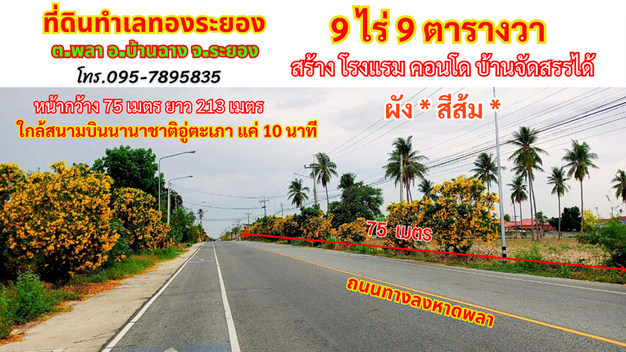 ขายที่ดินระยอง พลา บ้านฉาง 9 ไร่ 9 ตรว. ติดถนนลงหาดพลา ใกล้สนามบินนานาชาติอู่ตะเภา