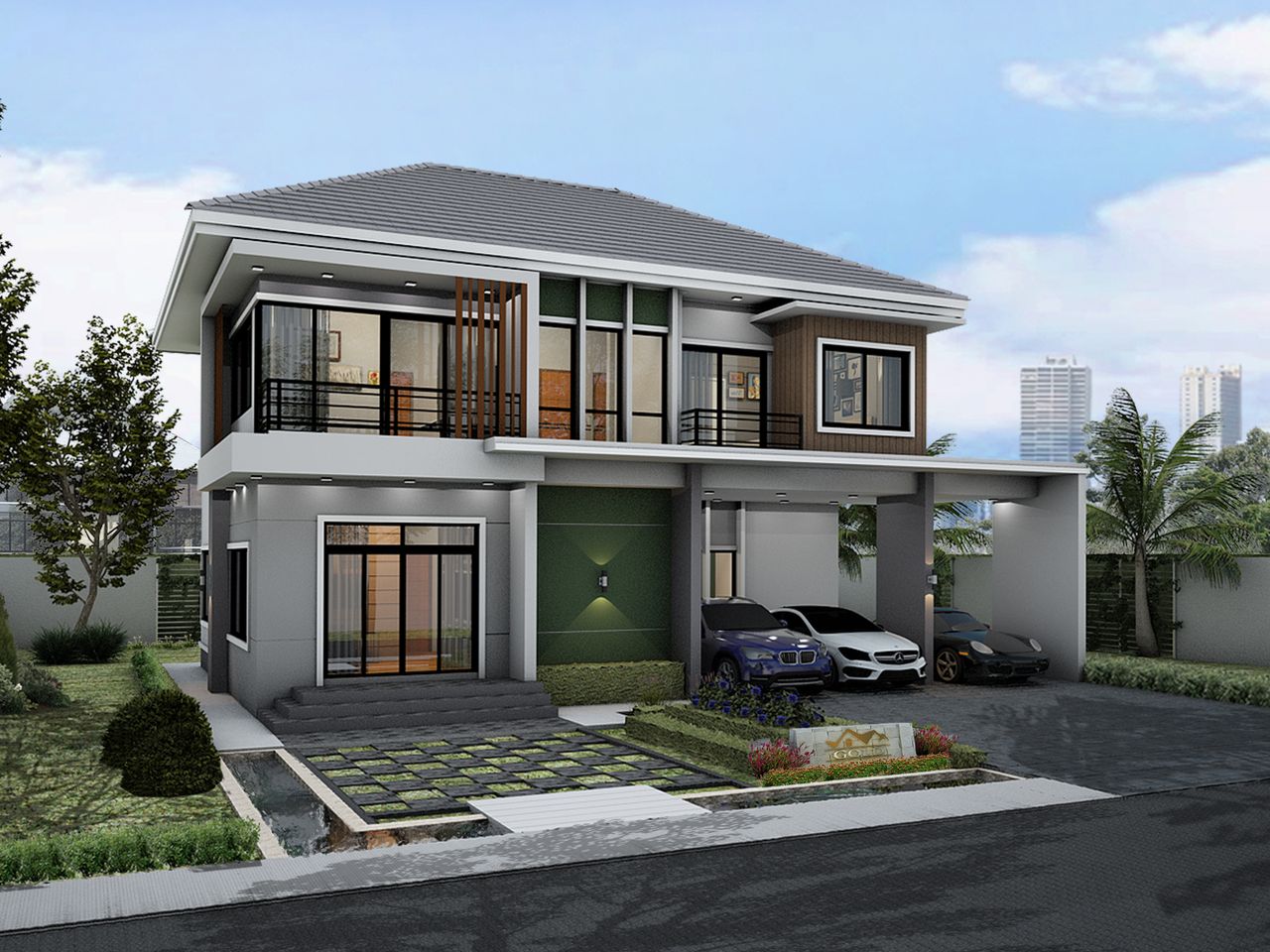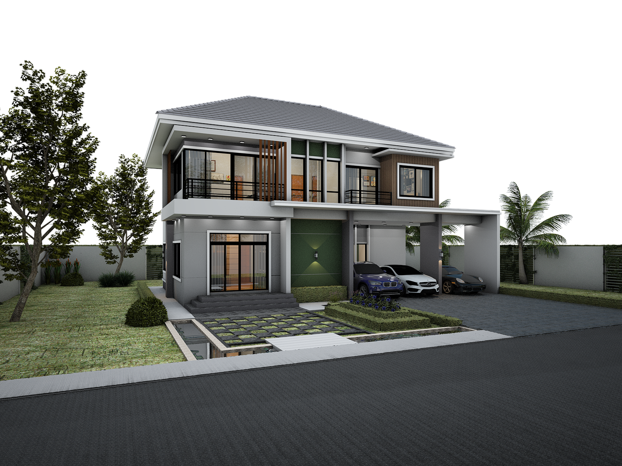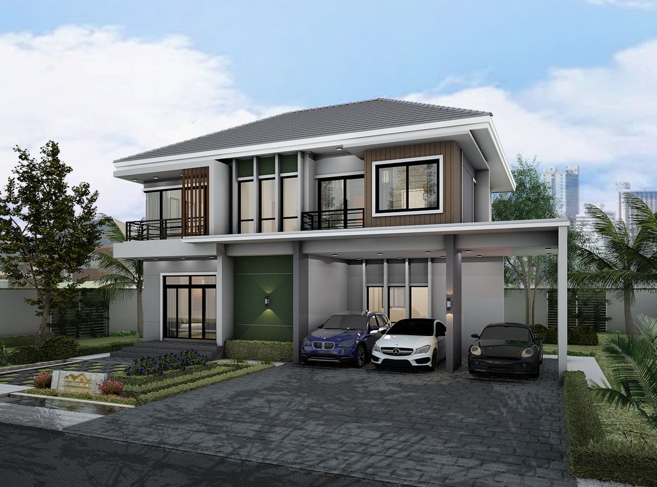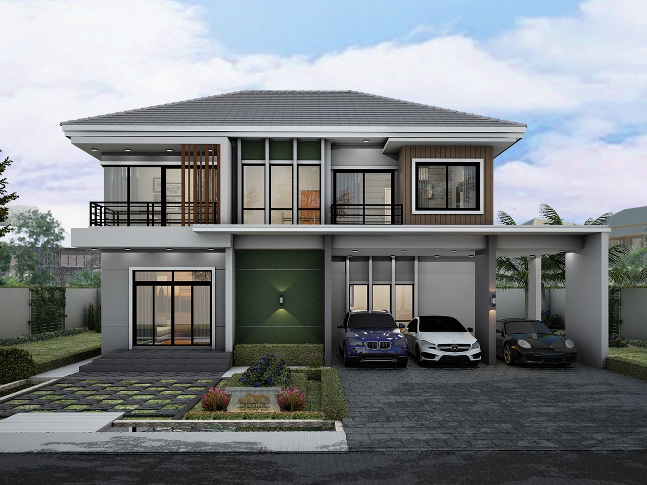 แบบบ้าน GHP328 โมเดิร์นคอนเทมโพรารี ฟังก์ชั่น : 2 ชั้น 5 ห้องนอน 4 ห้องน้ำ 1 ห้องครัว 1 ห้องรับแขก 3 ที่จอดรถ