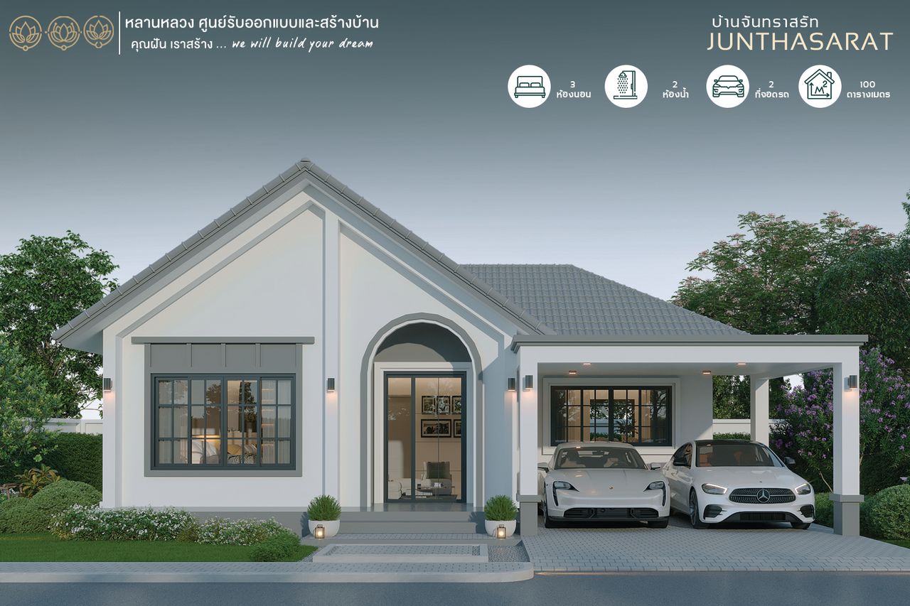 รับสร้างบ้านหลานหลวง บ้านชั้นเดียวสไตล์ โมเดิร์นคลาสสิค 3 ห้องนอน 2 ห้องน้ำ ชื่อแบบบ้านจันทราสรัท