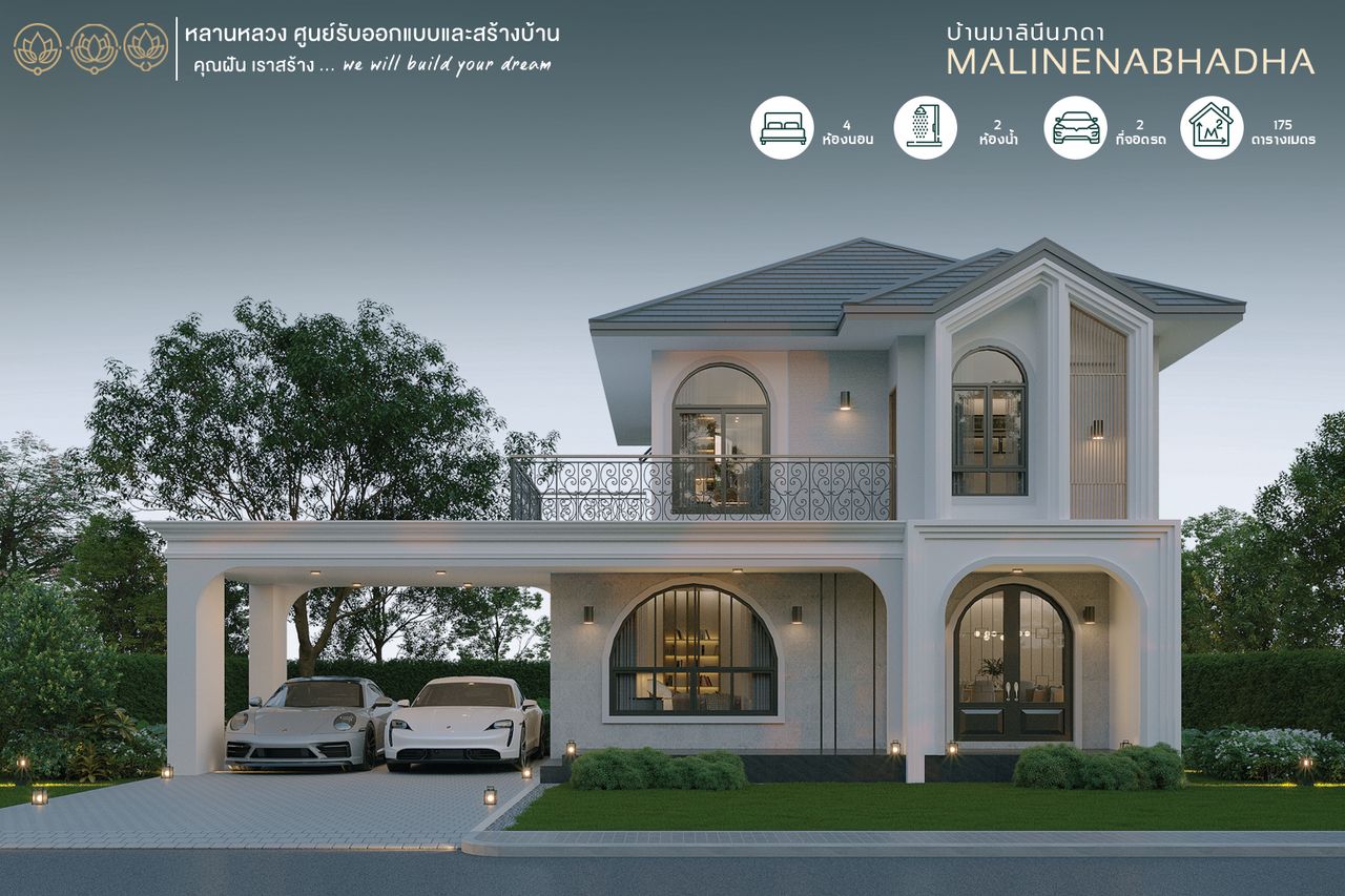 รับสร้างบ้านหลานหลวง บ้าน 2 ชั้น สไตล์โมเดิร์นคลาสสิค 3 ห้องนอน 2 ห้องน้ำ ชื่อแบบบ้านมาลินีนภดา