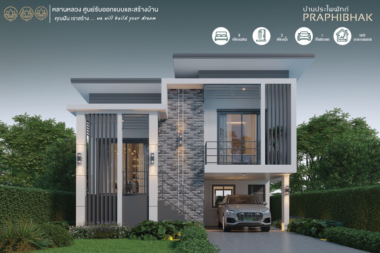 รับสร้างบ้านหลานหลวง บ้านชั้นครึ่ง สไตล์โมเดิร์น 3 ห้องนอน 3 ห้องน้ำ ชื่อแบบบ้านประไพพักต์