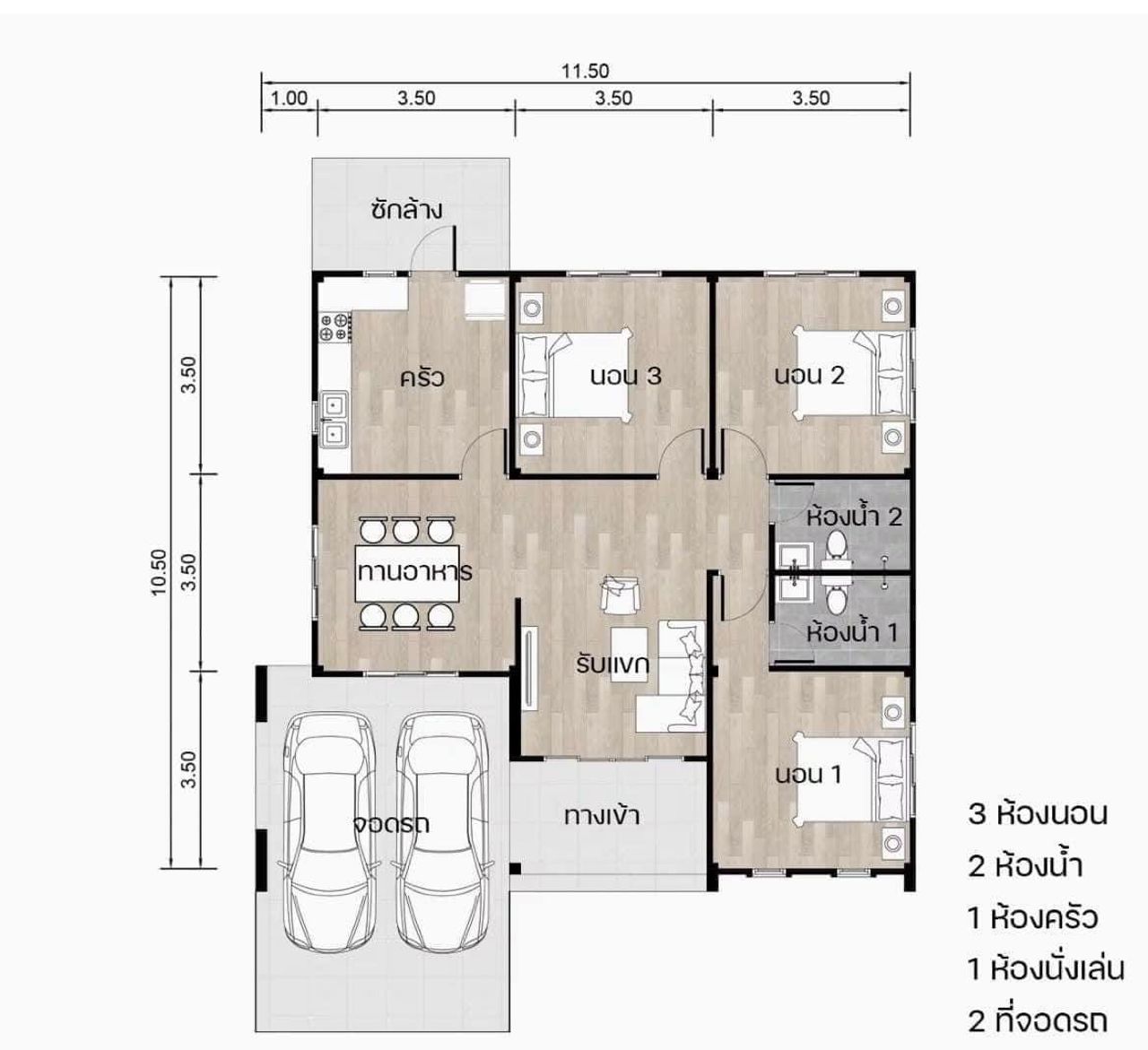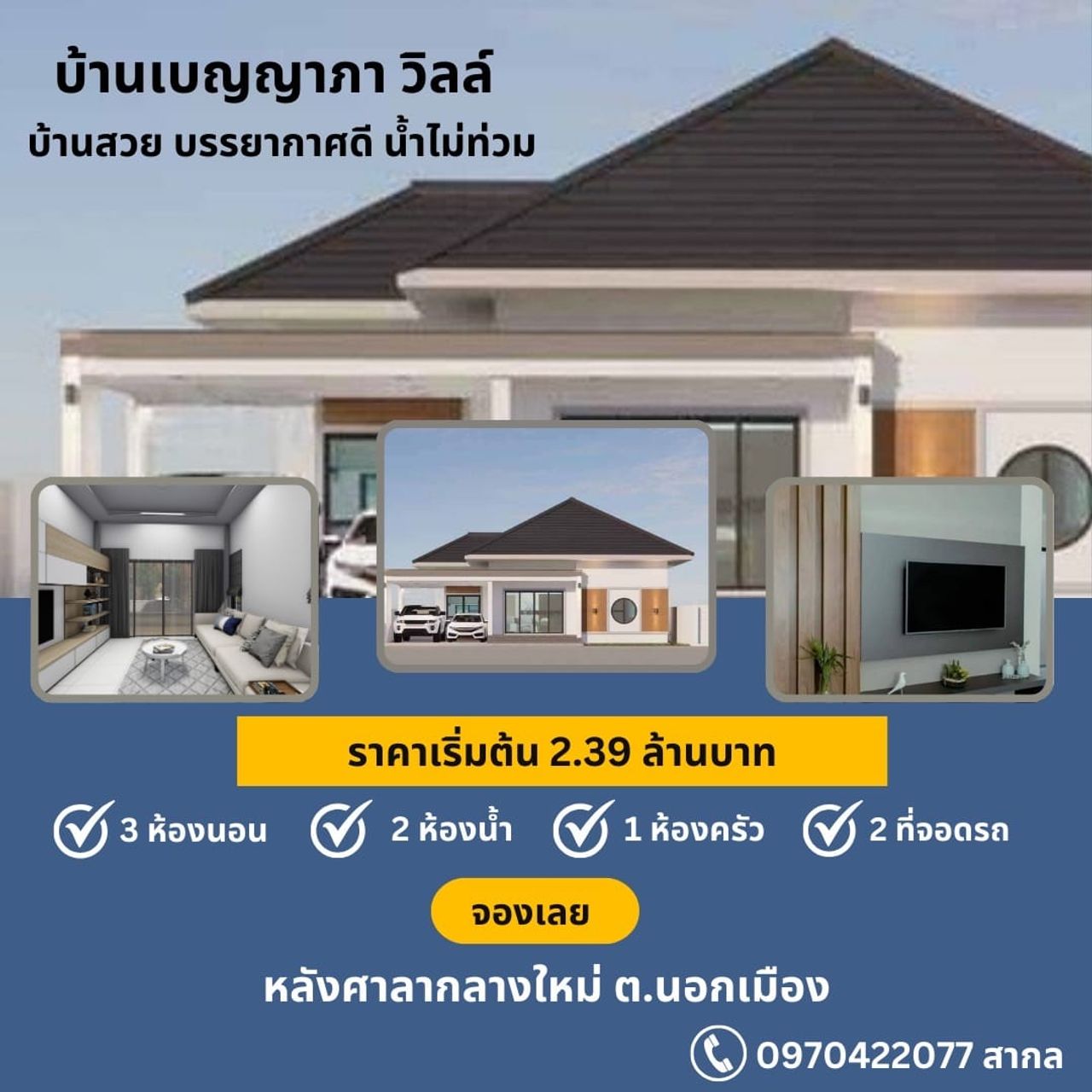 บ้านเดี่ยวชั้นเดียว 3 ห้องนอน 2 ห้องน้ำ จอดรถ 2 คัน