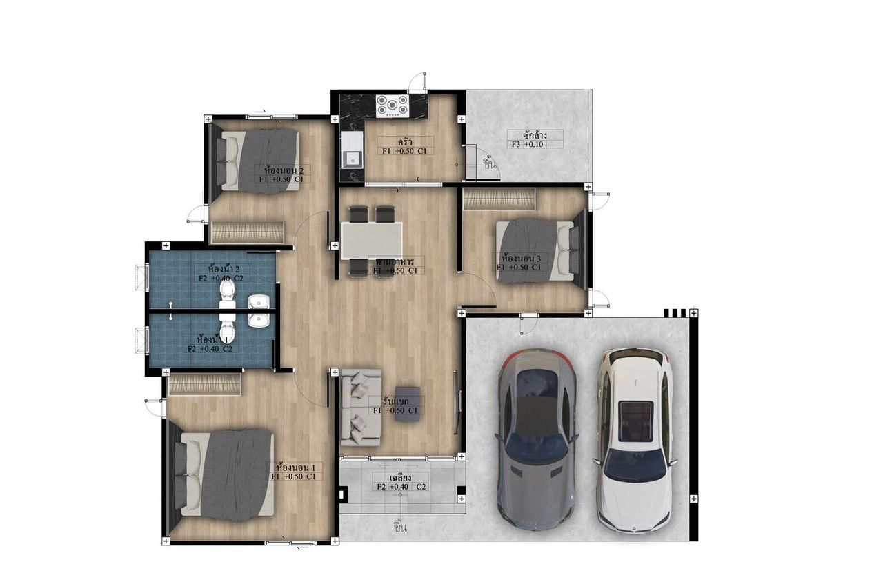 3 ห้องนอน 2ห้องน้ำ 1ห้องโถง 1ห้องครัว 2ที่จอดรถ
