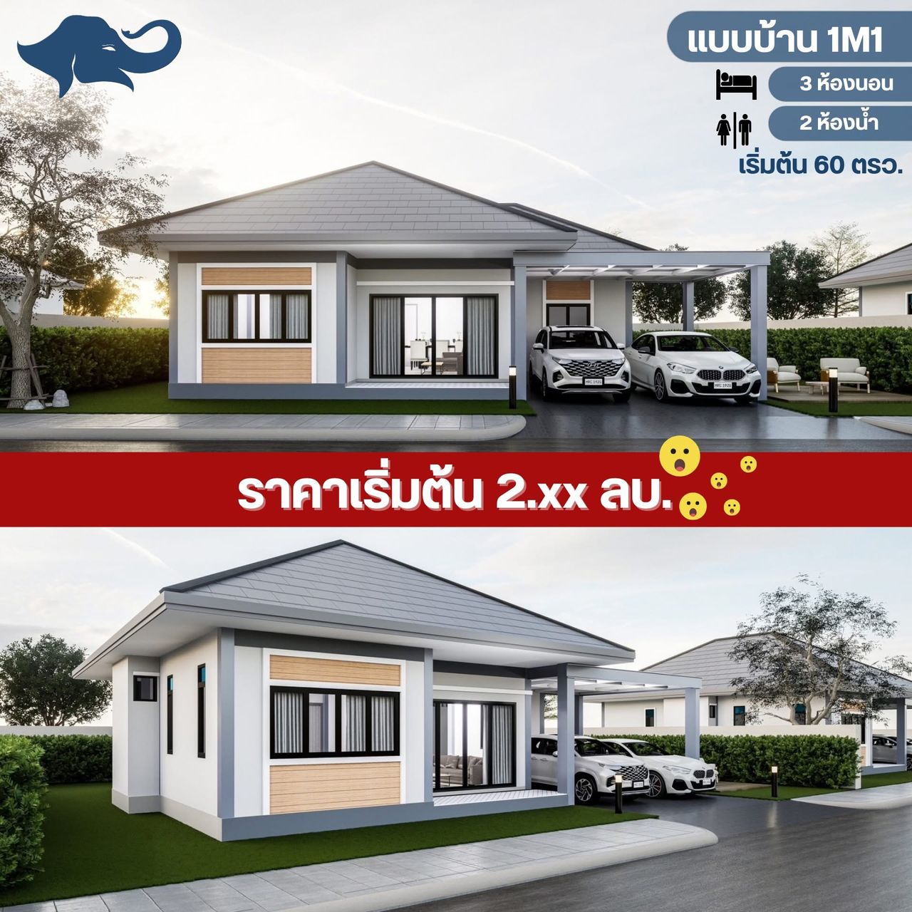 3 นอน 2 น้ำ นั่งเล่น ครัว จอดรถ 2 คัน
