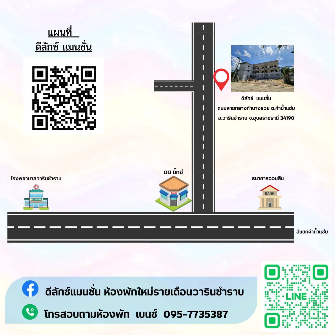 พิกัด : ดีลักซ์แมนชั่น ถนนสายกลางบ้านคำนางรวย ต.คำน้ำแซ่บ อ.วารินชำราบ จ.อุบลราชธานี