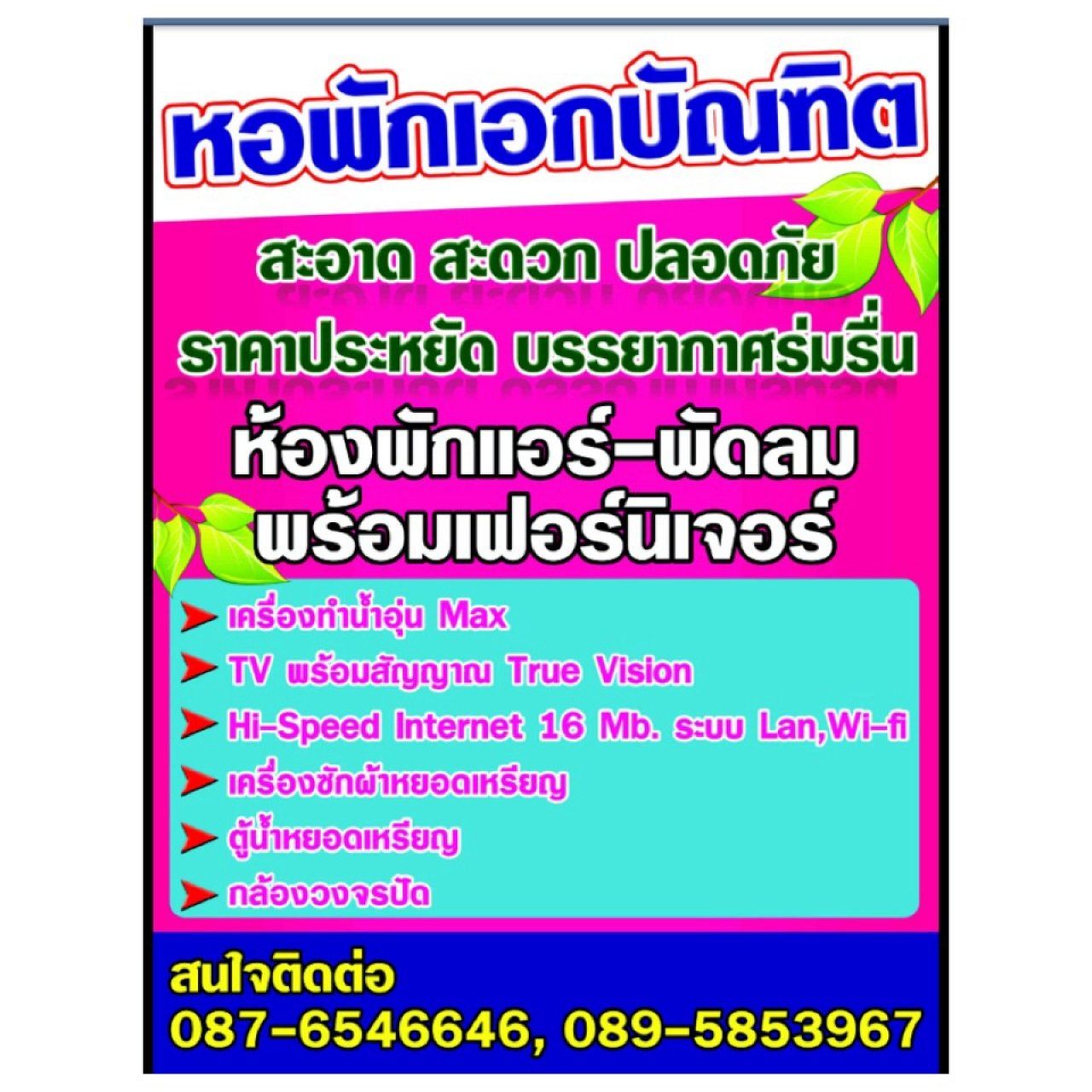 ห้องพักแอร์-พัดลม พร้อมเฟอร์นิเจอร์ครบครัน ห้องพักสะอาด บรรยากาศร่มรื่น อินเตอร์เน็ตWifi