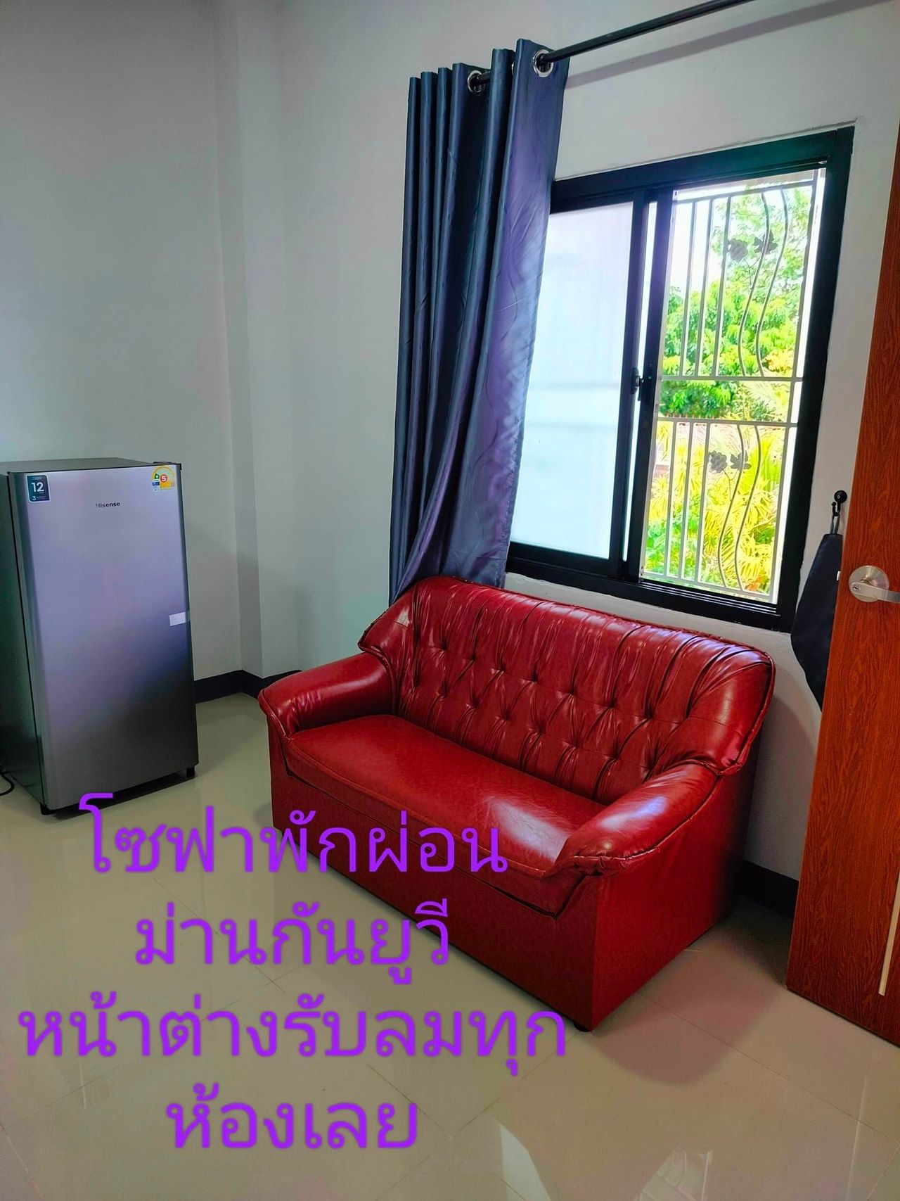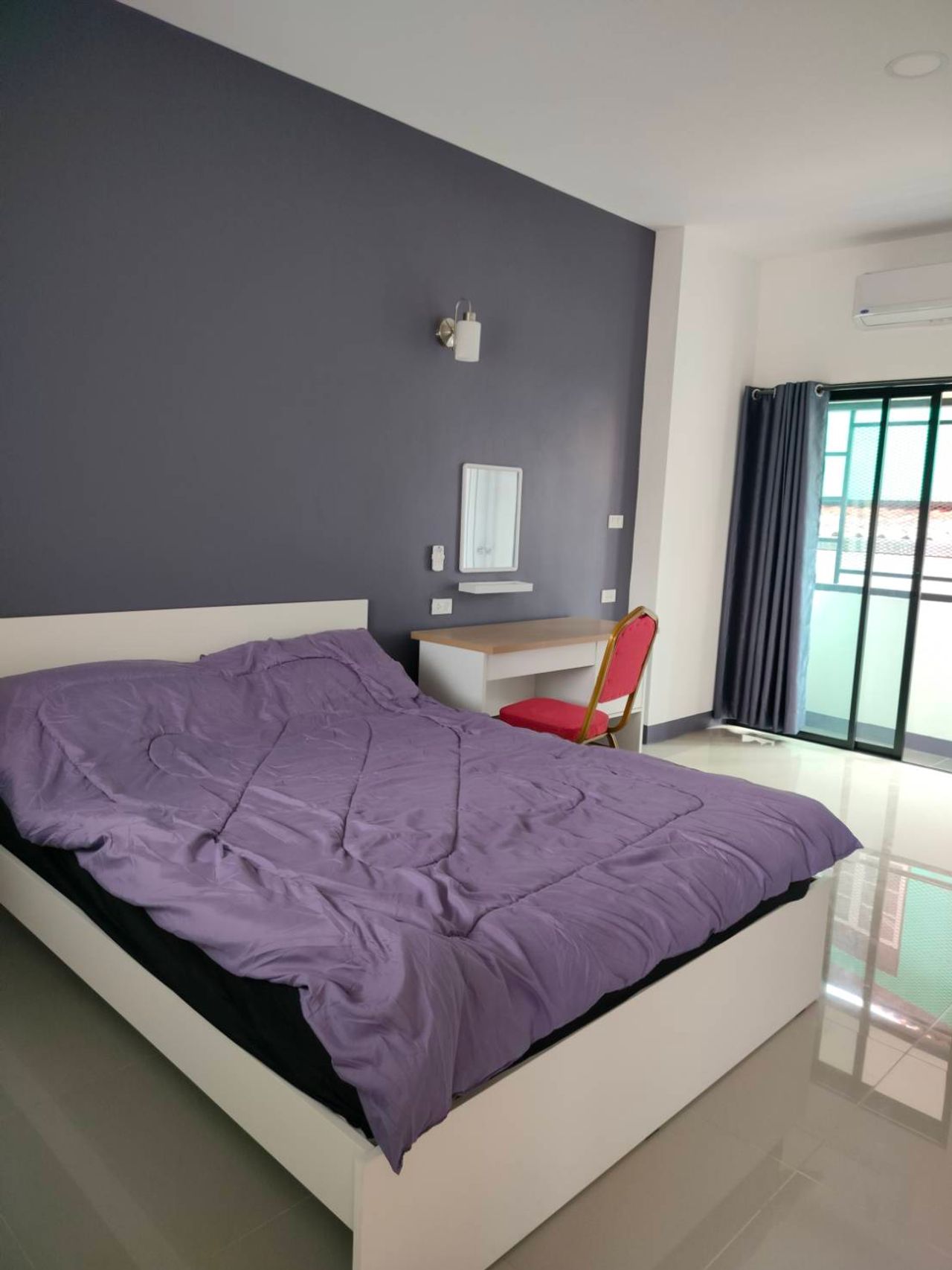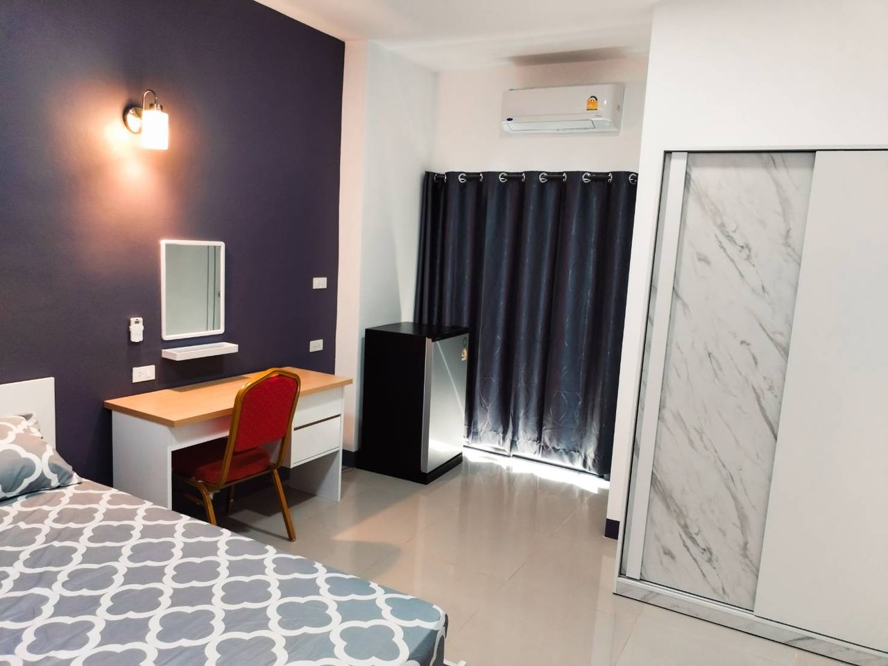 ผ้าปูที่นอนมีให้ทุกห้อง พัดลมติดผนังมีทุกห้อง