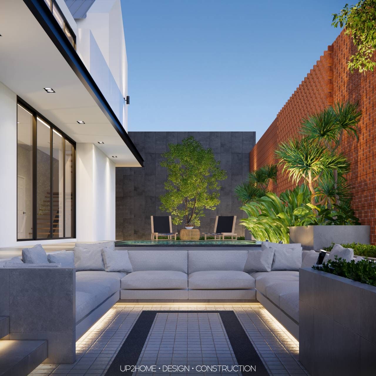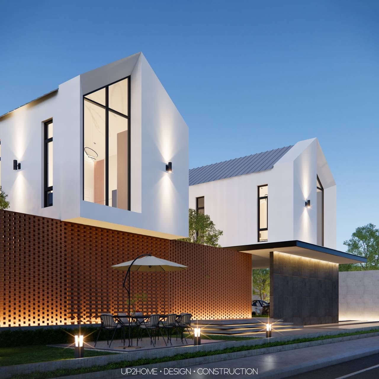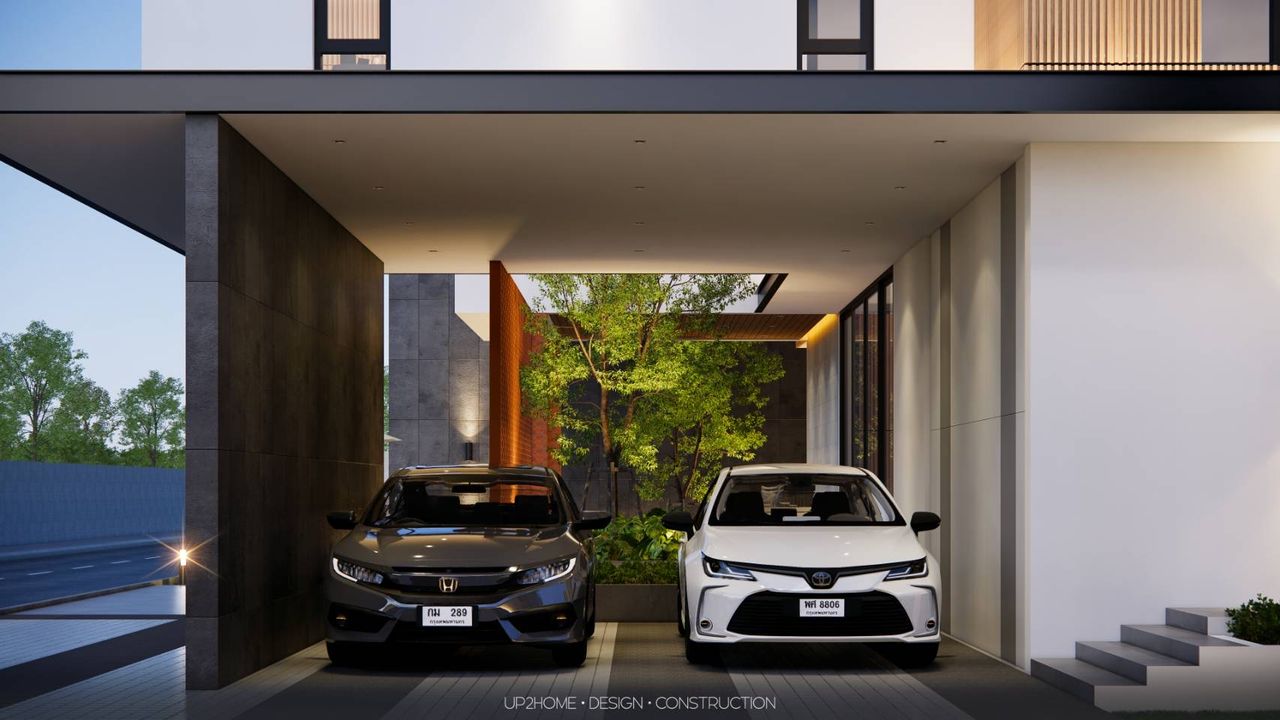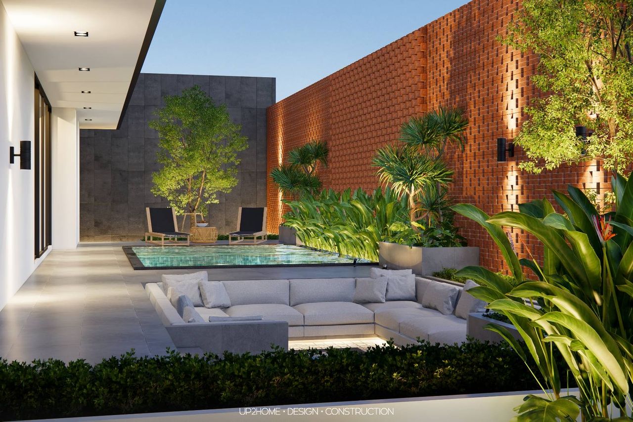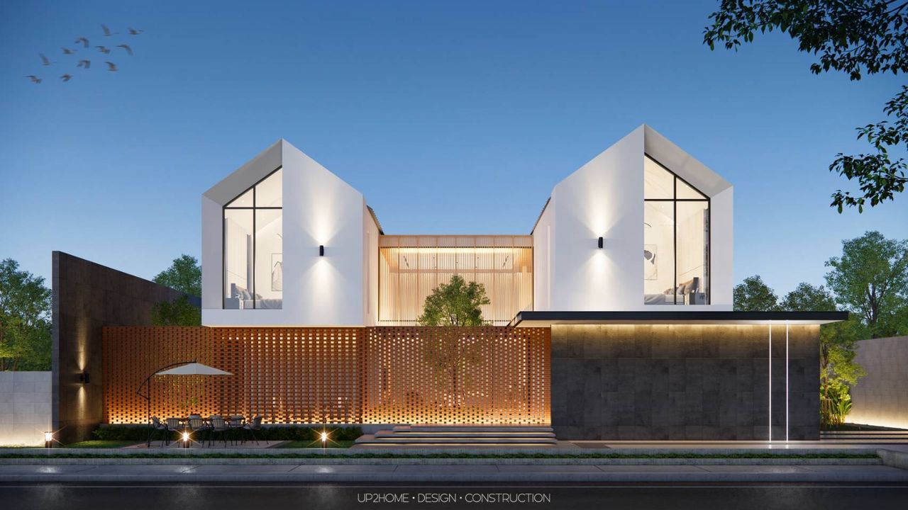 บ้าน 2 ชั้นสไตล์โมเดิร์นผสมผสานกับสไตล์นอร์ดิก ออกแบบให้บ้านมีความเป็นส่วนตัวจากส่วนทางเข้าหลัก โดยใช้เพลนของผนังทึบและการก่ออิฐมอญเว้นช่องลมเพื่อบังสายตาจากภายนอก Public Space จะอยู่ในส่วนหน้า ตรงกลางไหลไปถึงส่วนหลังของอาคาร มีพื้นที่สระว่ายน้ำและ Sunken สำหรับใช้พักผ่อนและทำกิจกรรมร่วมกัน