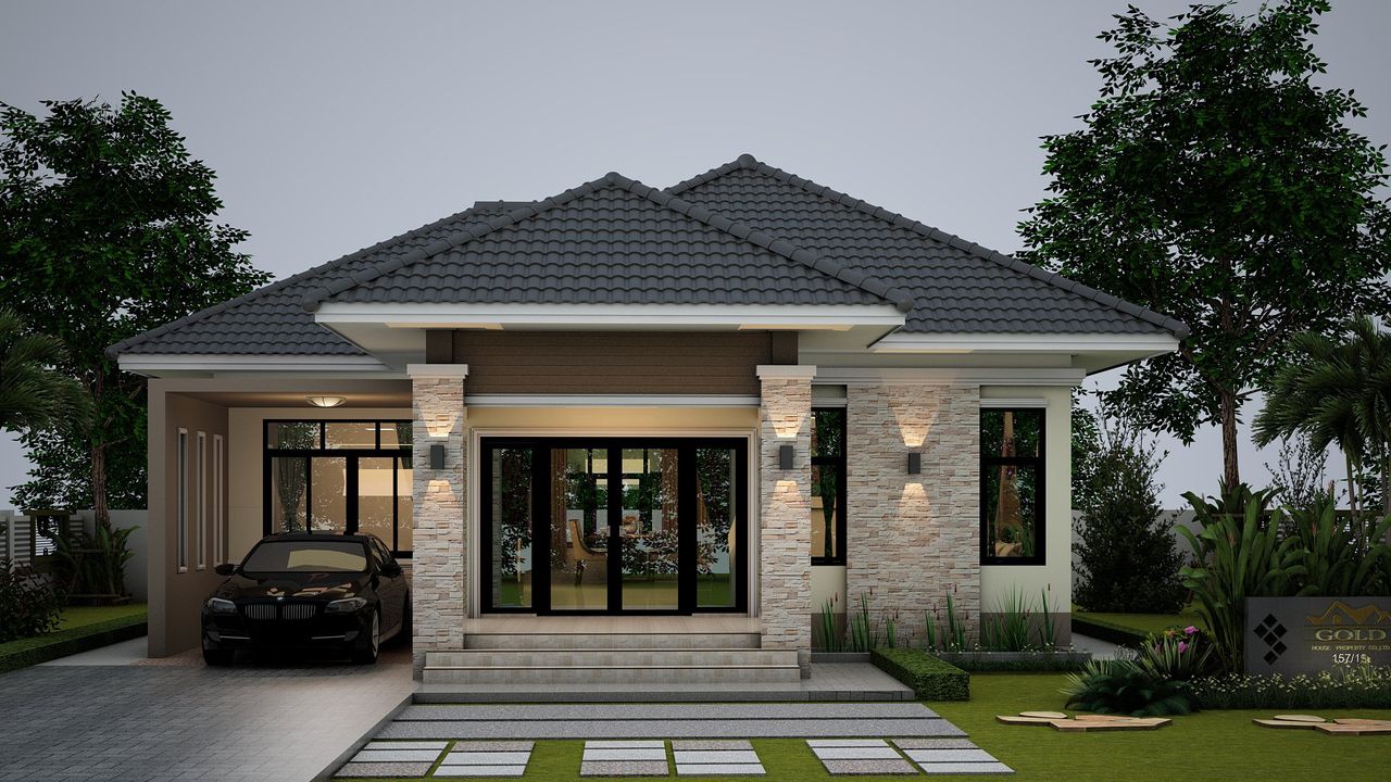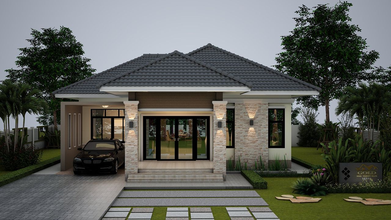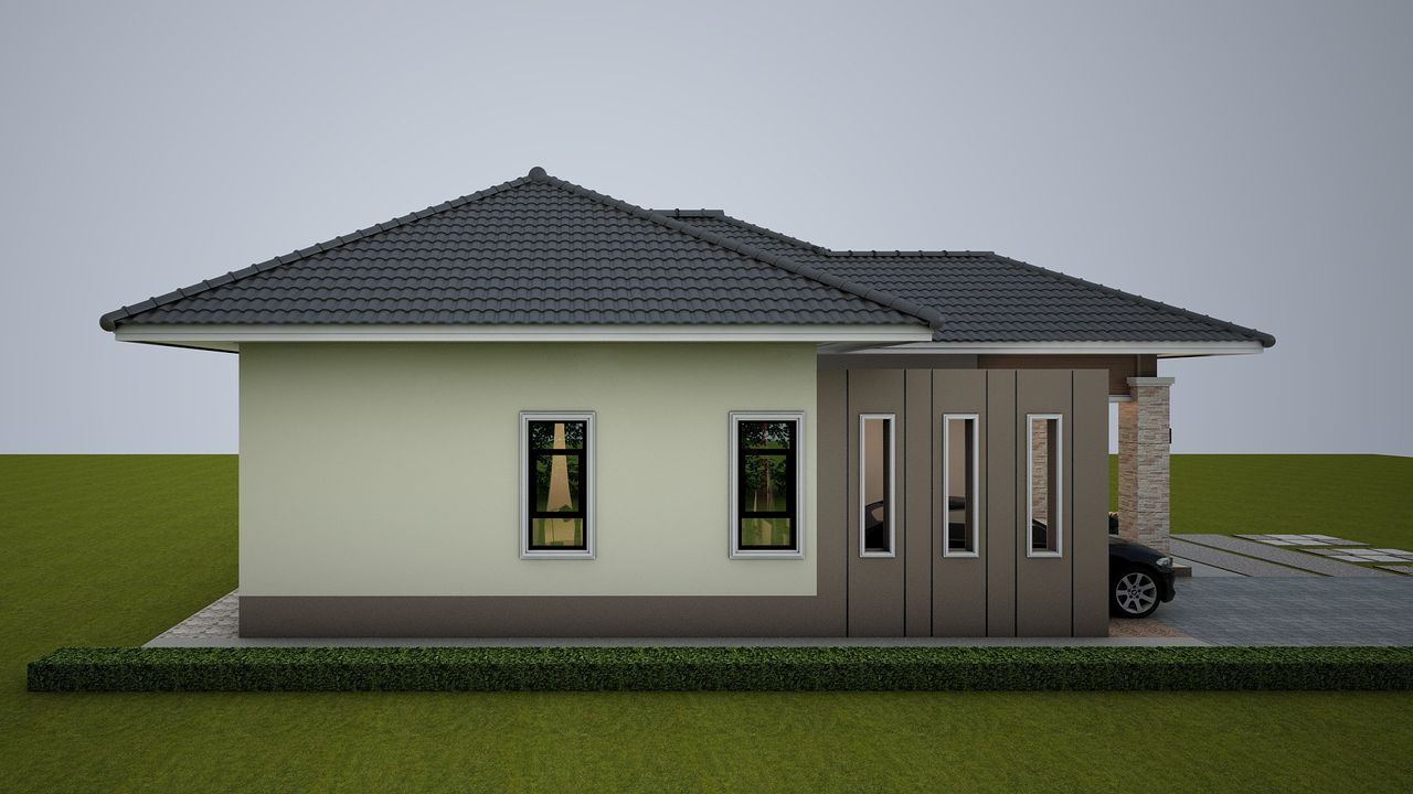 แบบบ้าน GHP371 คอนเทมโพรารี ฟังก์ชั่น : 1 ชั้น 3 ห้องนอน 2 ห้องน้ำ 1 ห้องครัว 1 ห้องรับแขก 1 ที่จอดรถ