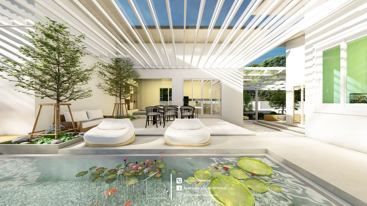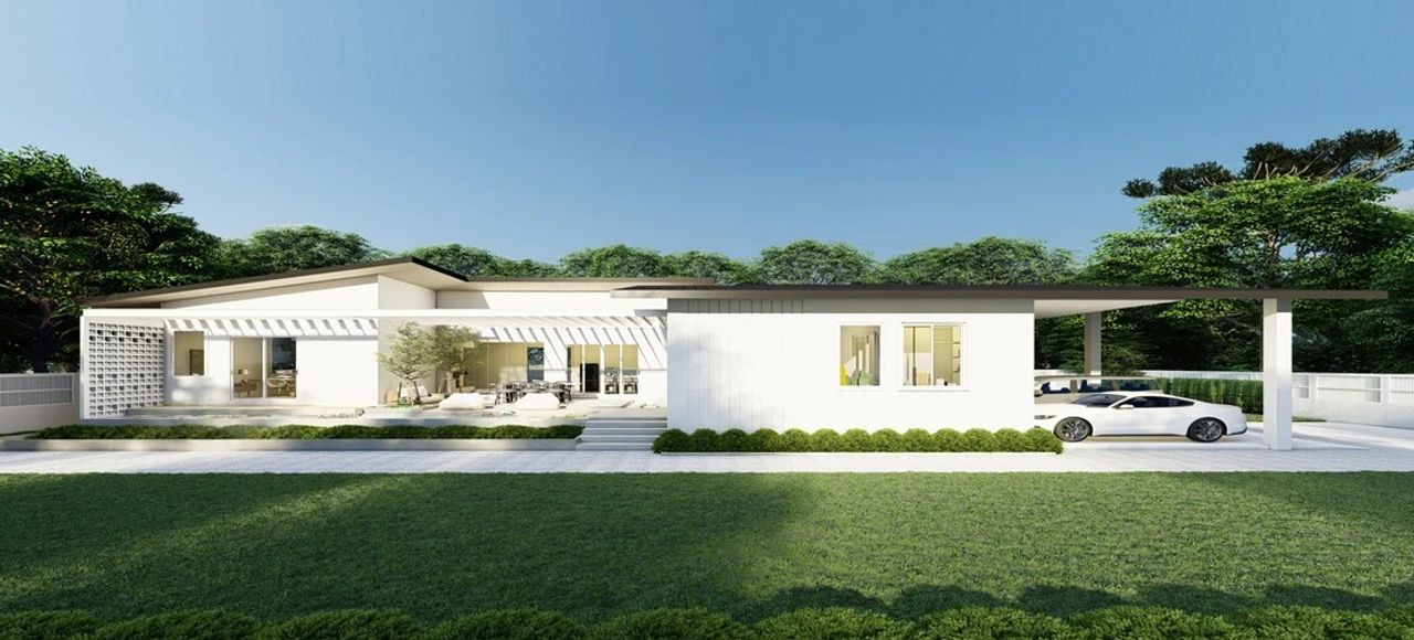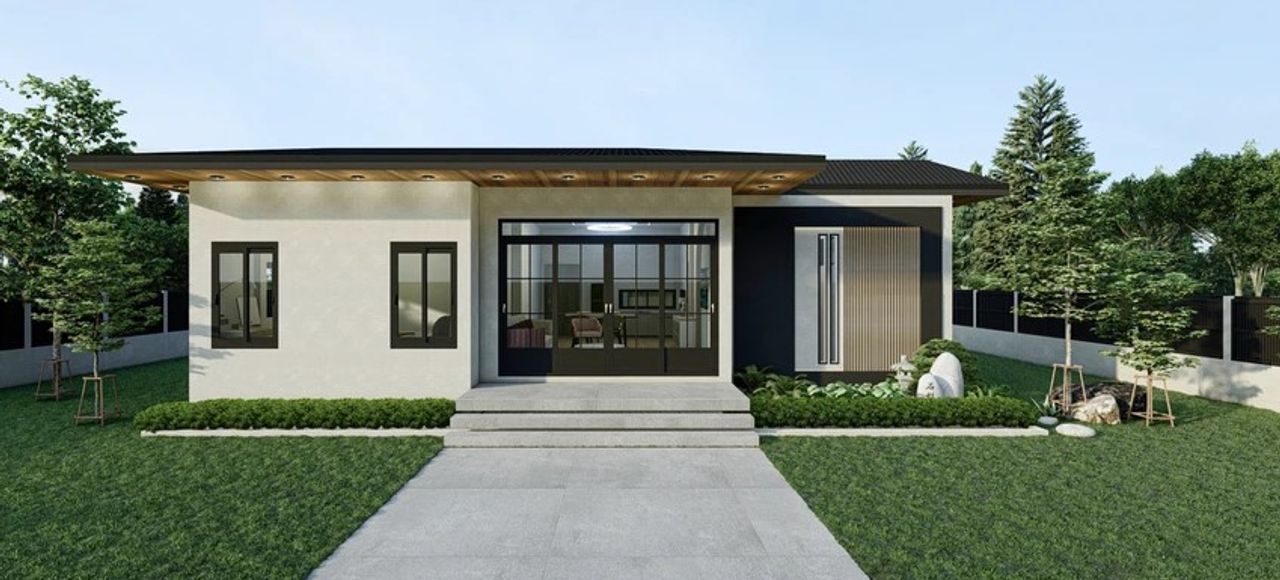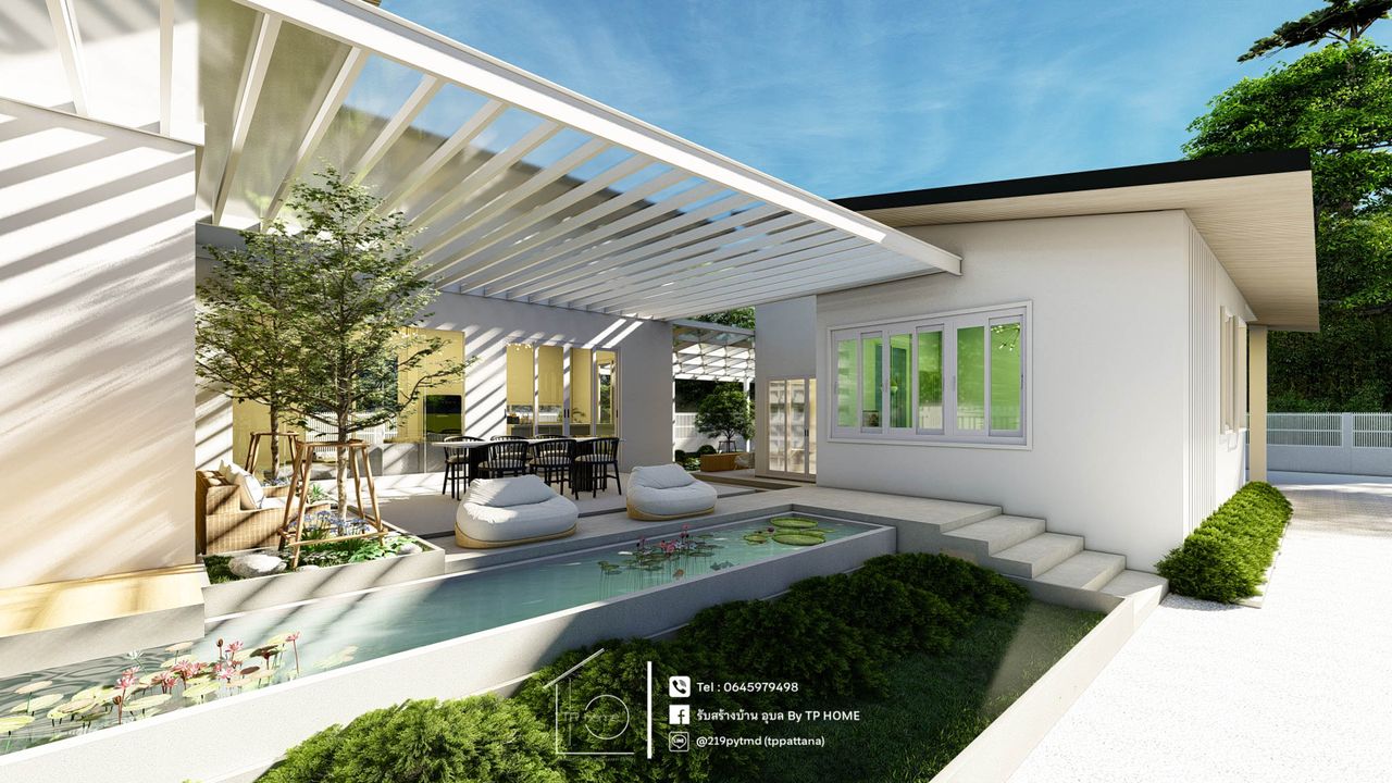 บ้านชั้นเดียว สไตล์โมเดิร์น ร่วมสมัย ตัวบ้านถูกออกแบบให้มีพื้นที่ใช้สอยกว้างขวาง เน้นความเป็นส่วนตัว ด้วยพื้นที่ 280 ตร.ม.
