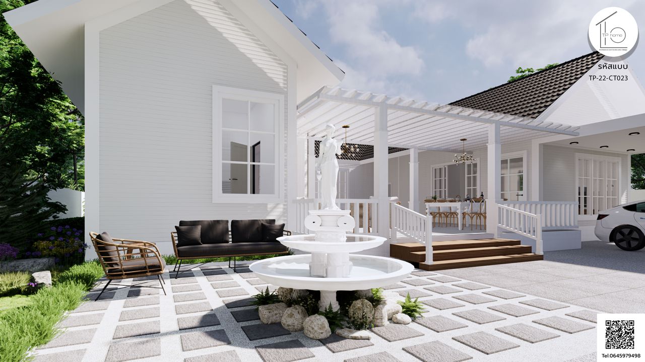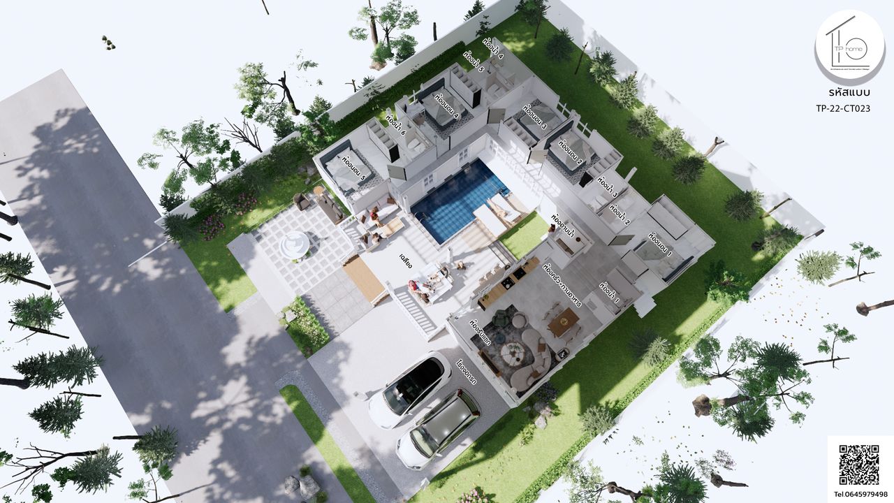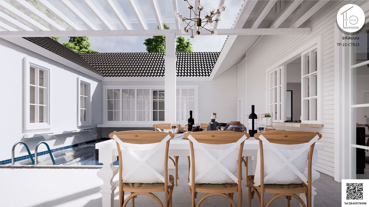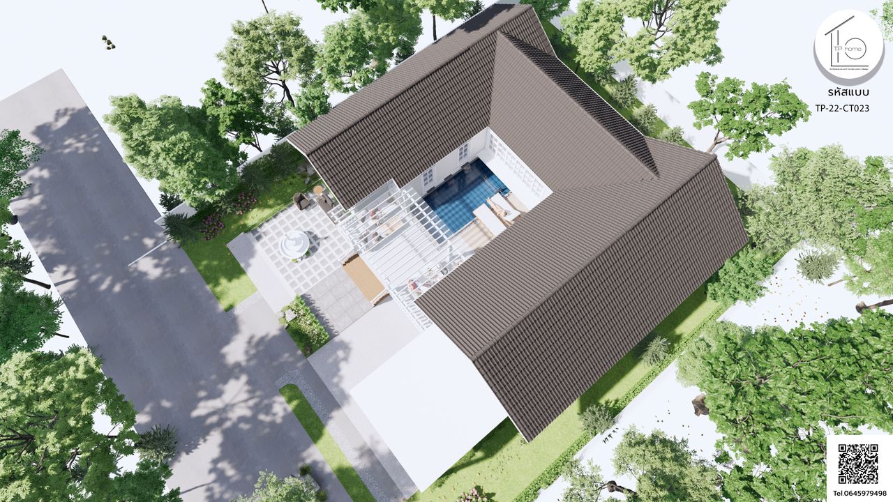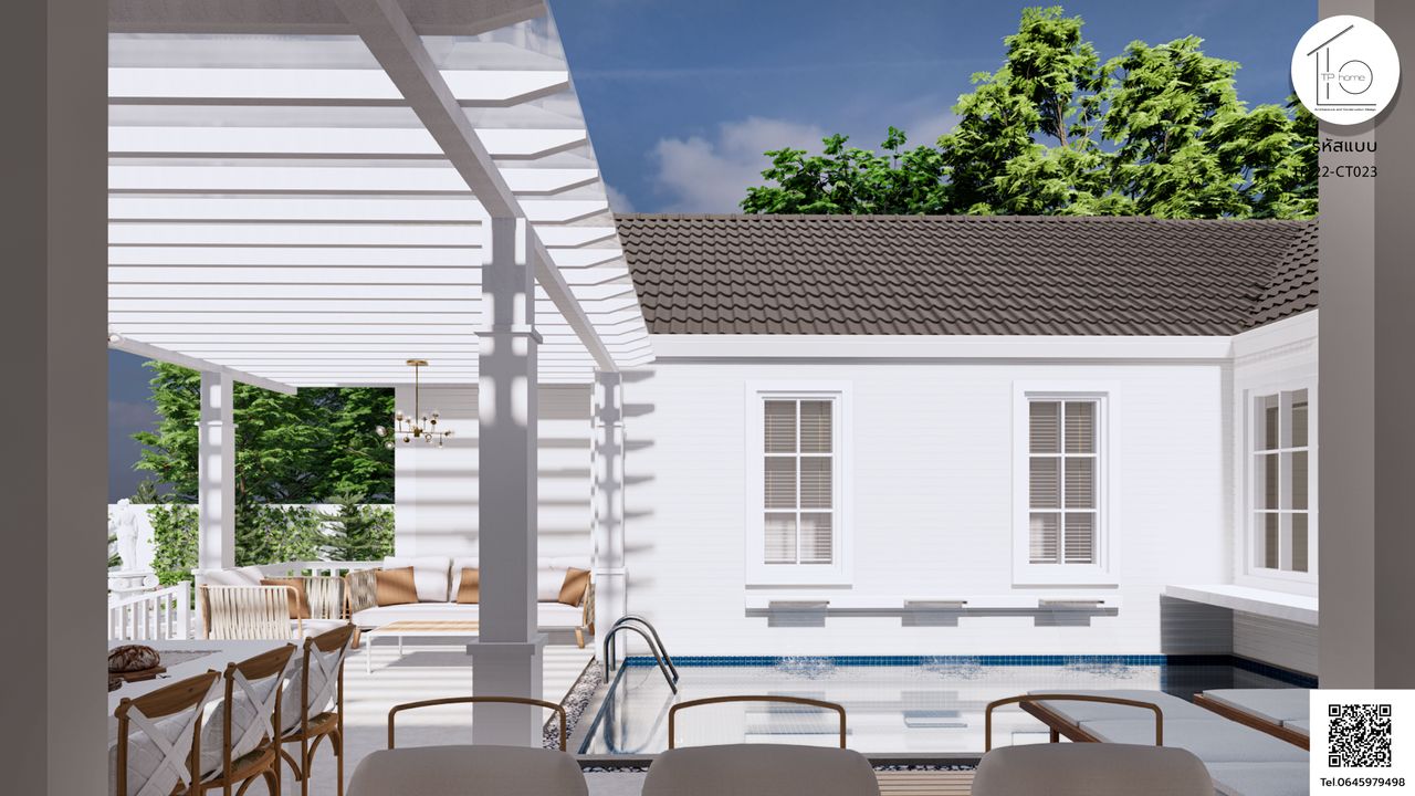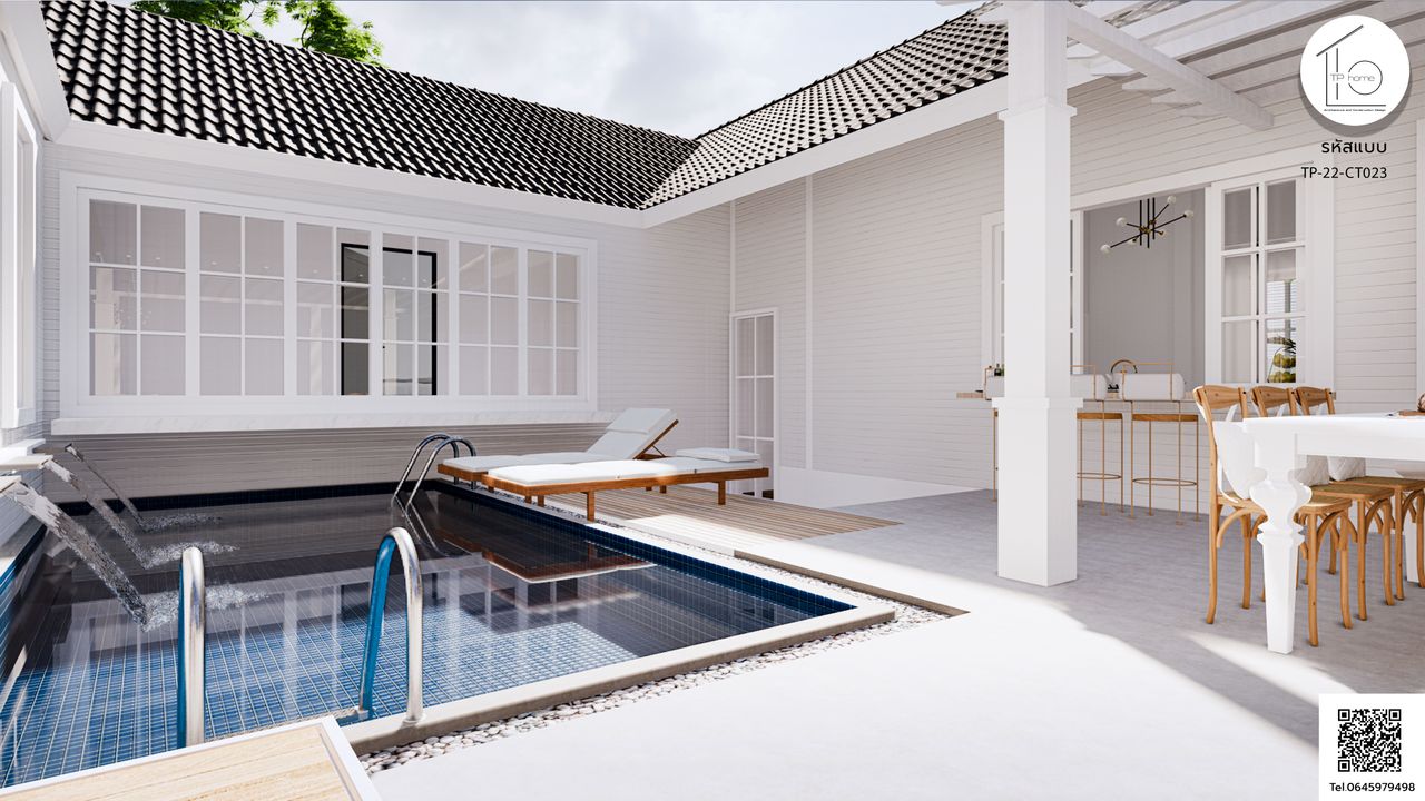 บ้านรหัส CT023 ออกแบบมาในสไตล์ Contemporary และ Minimal ที่เน้นความเรียบง่ายและทันสมัย โดยมีการผสมผสานกับแนวคิดของพลูวิลล่า มีสระว่ายน้ำที่ตั้งอยู่ตรงศูนย์กลางของบ้าน เพื่อสร้างบรรยากาศที่สดชื่นและผ่อนคลาย