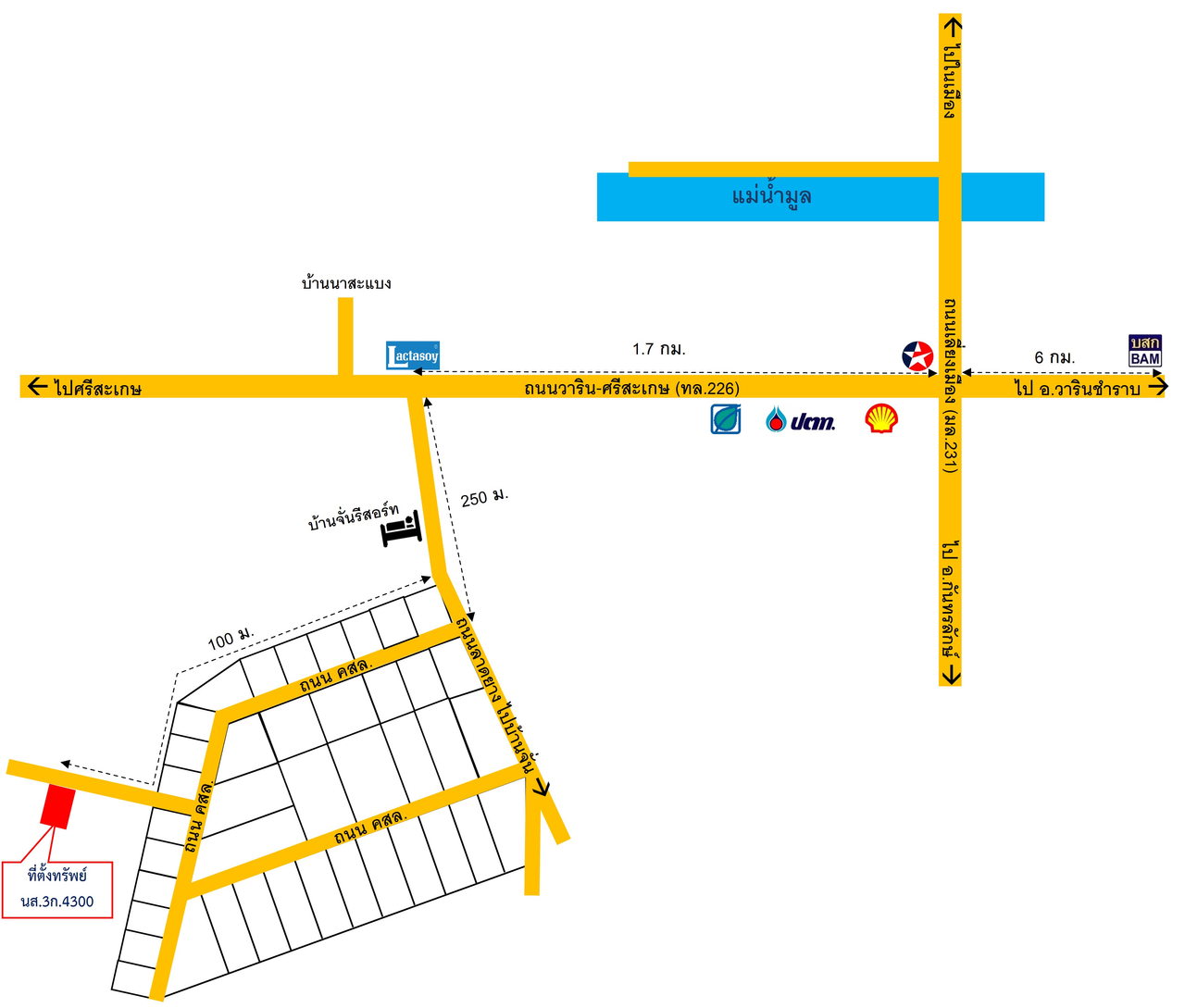 ที่ตั้ง : จากถนนวารินชำราบ-ศรีสะเกษ เลี้ยวเข้าซอยทางไปชุมชนบ้านจั่นประมาณ 250 ม. จากนั้นเลี้ยวขวาเข้าดครงการหมู่บ้านปิยณัฐไปประมาณ 100 ม. ถึงทรัพย์ ด้านซ้ายมือ