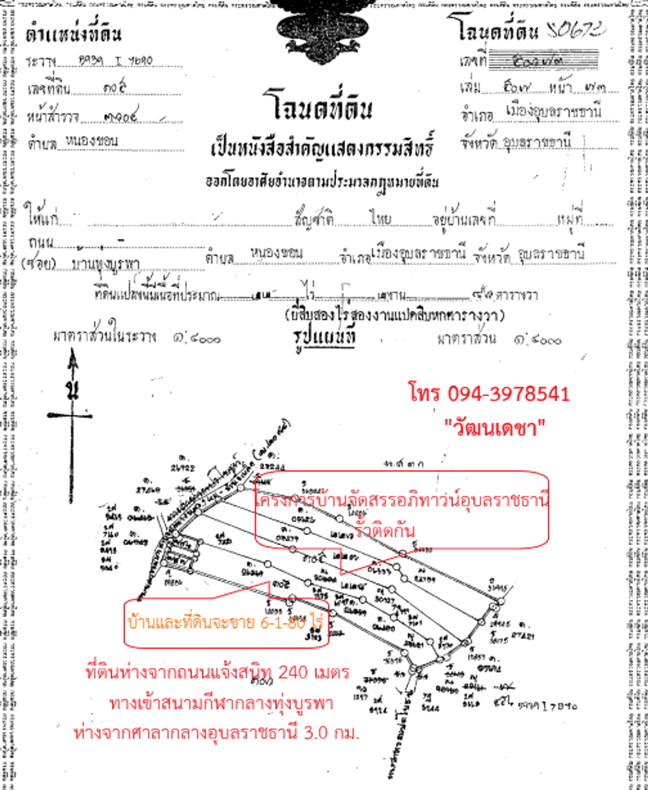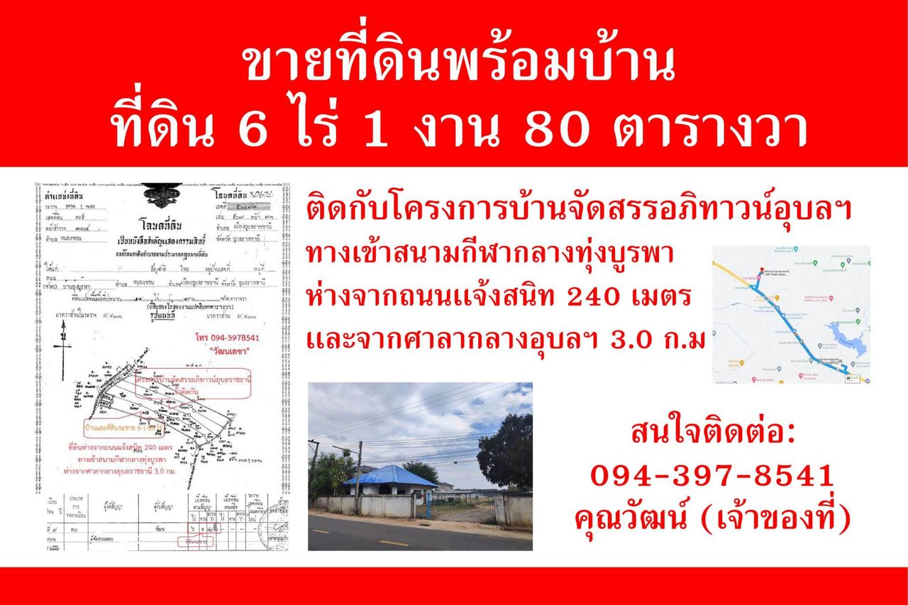 ขายที่ดินพร้อมบ้าน โซนแจ้งสนิท ศาลากลางจังหวัดอุบลราชธานี ราคาต่อรองกับเจ้าของทรัพย์ได้โดยตรง หลักทรัพย์หน้ากว้าง 36 เมตร ยาว 320 เมตร รั้วติดกับโครงการบ้านจัดสรรอภิทาวน์อุบล ทางเข้าสนามกีฬากลางทุ่งบูรพา ห่างจากศาลากลางอุบล 3 กม. ห่างจากถนนแจ้งสนิท 240 เมตร เหมาะสำหรับทำจัดสรร ทำที่พักหรือรัานอาหาร