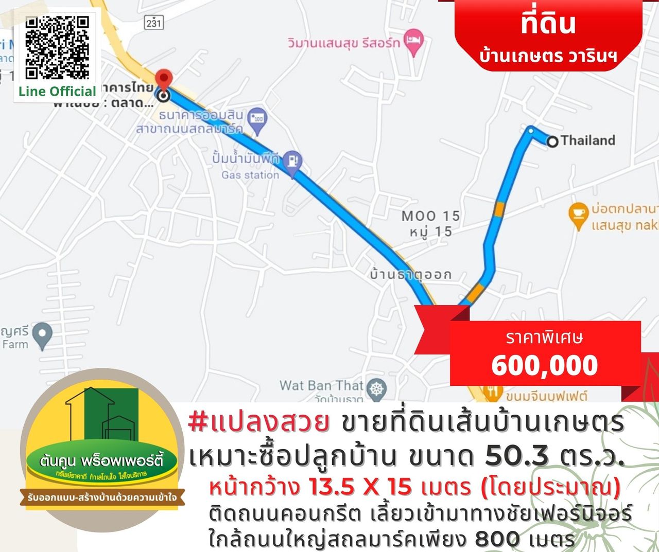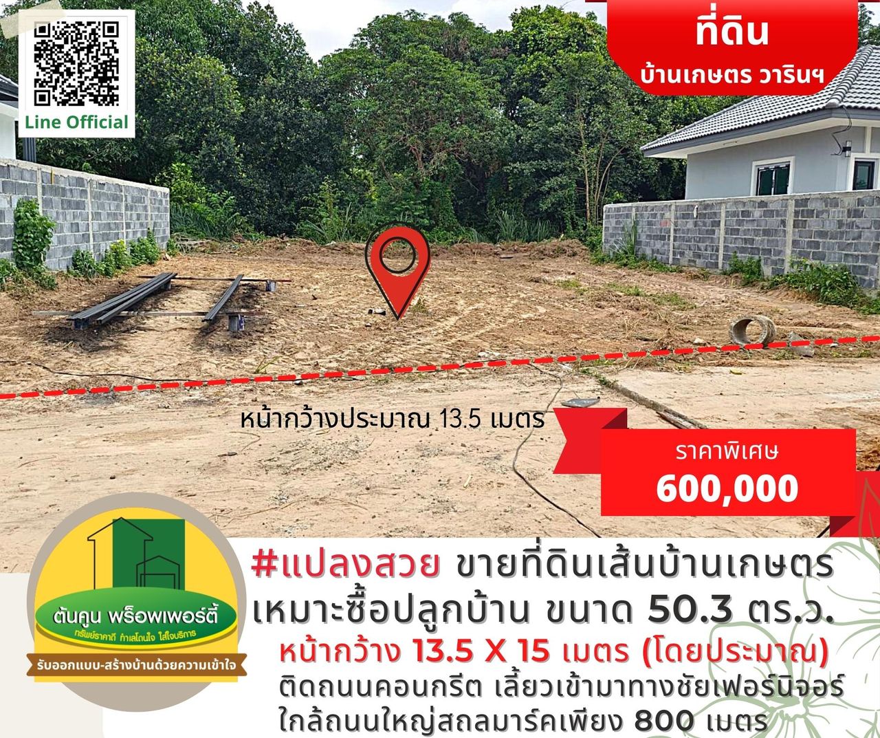 ✅ ที่ดินสวยขนาด 50.3 ตร.ว. หน้ากว้าง 13.5 X 15.2 เมตร (โดยประมาณ)
