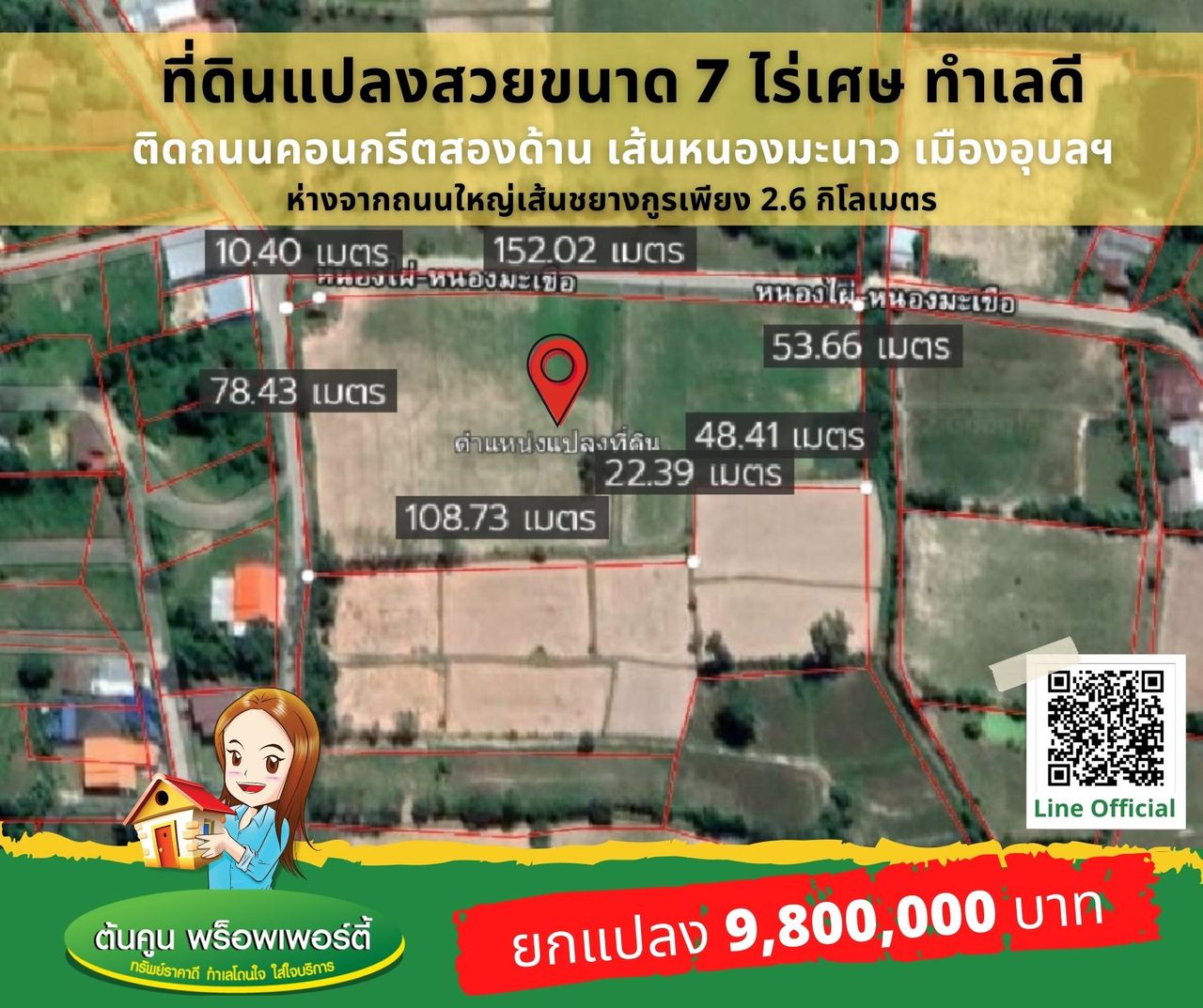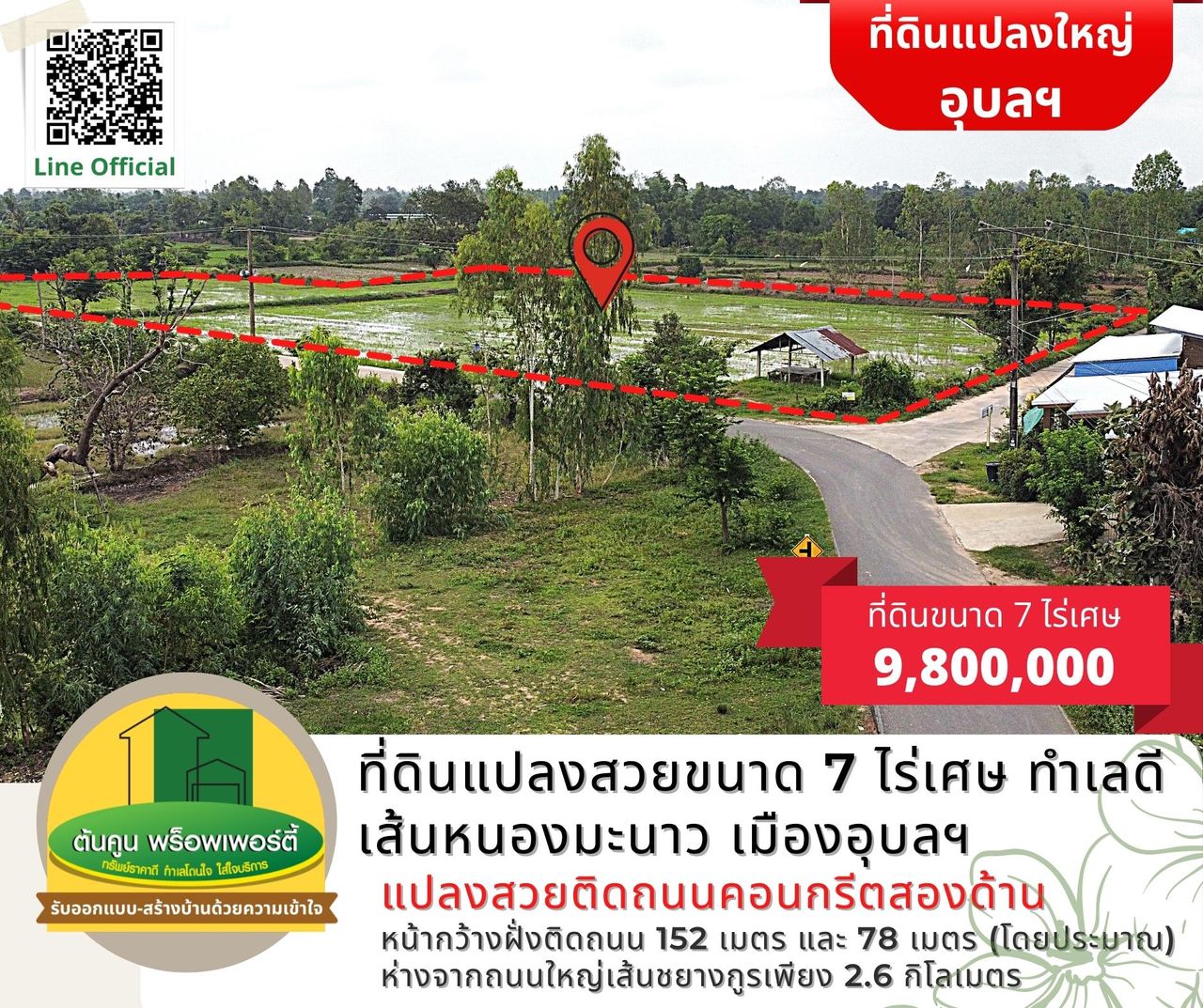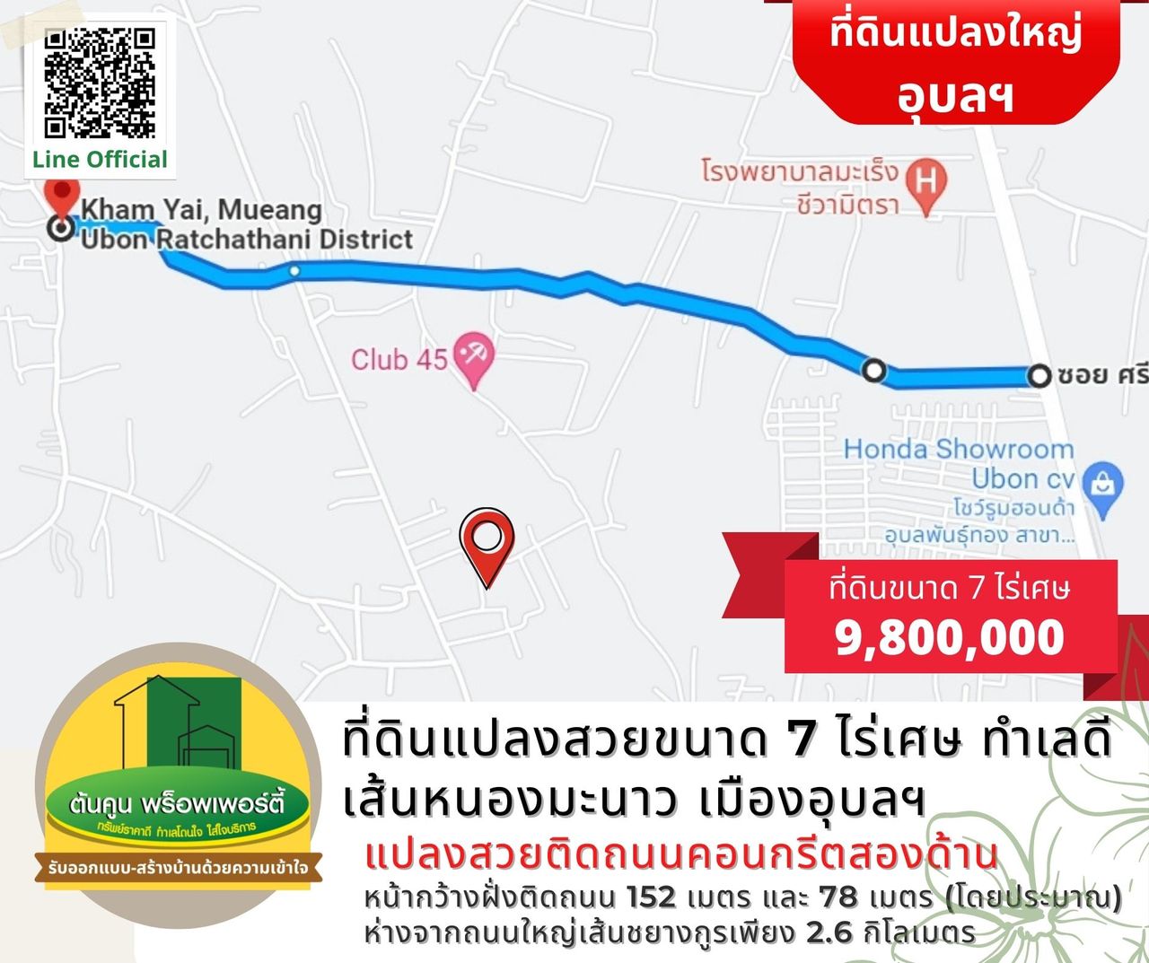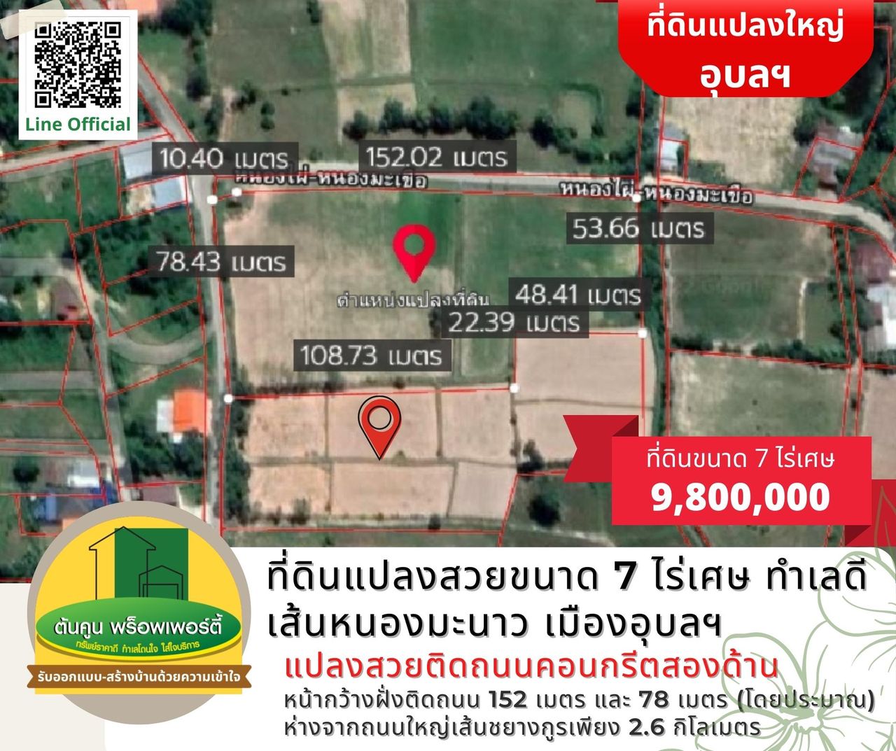 ✅ หน้ากว้างฝั่งติดถนน 152 เมตร และ 78 เมตร (โดยประมาณ)