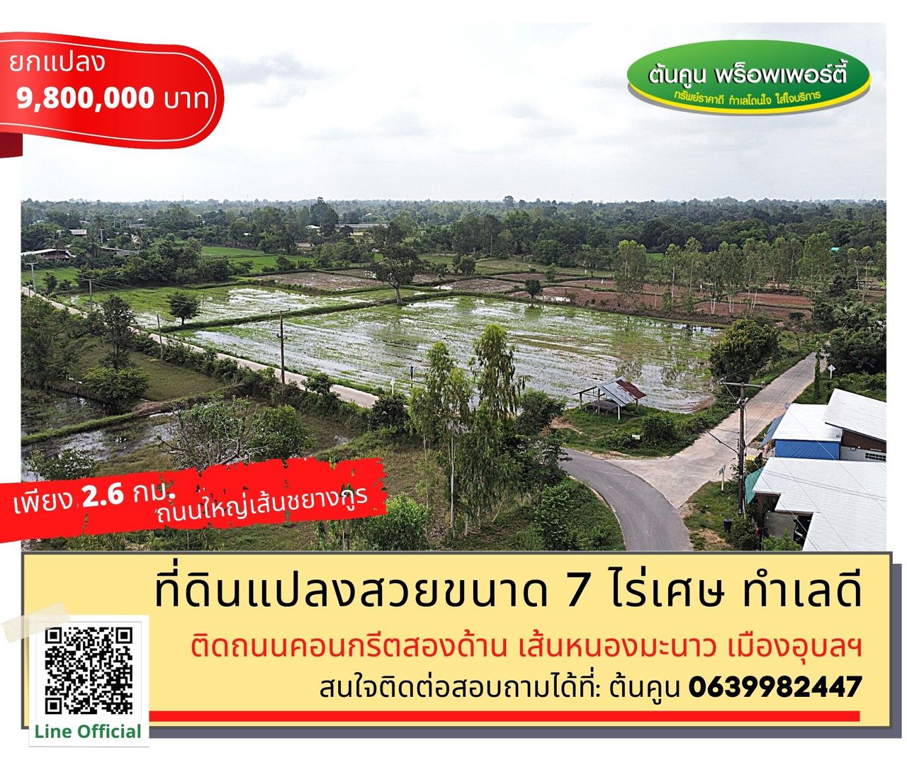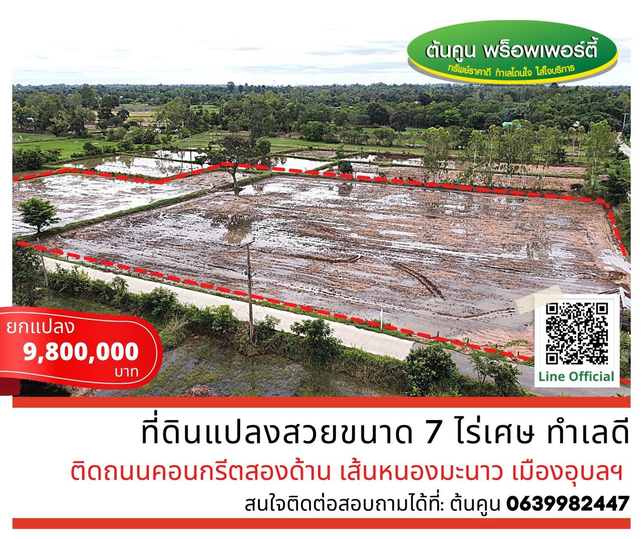 ขายที่ดินแปลงสวยขนาด 7 ไร่เศษ ทำเลดี ติดถนนตอนกรีตสองฝั่ง เส้นหนองมะนาว เมืองอุบลฯ