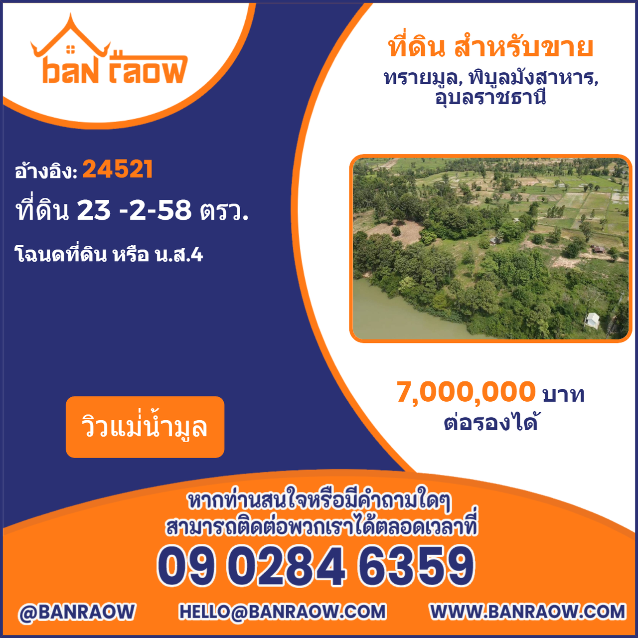 ที่ดิน 23 -2-58 ตรว. ติดแม่น้ำมูล ห่างจาก อ.พิบูลมังสาหารเพียง 8 กม.//ห่างจากถนนสายหลัก 500 เมตร(สาย2222) น้ำไม่ท่วม 100 เปอเช็น เหมาะทำที่พักอาศัยหรือรีสร์อทพร้อมทั้งทำการเกษตรกรรม ควบคู่กันไปด้วย หากต้องการข้อมูลเพิ่มเตืม ติดต่อ บ.บ้านเราตัวแทนอสังหาริมทรัพย์ จำกัด