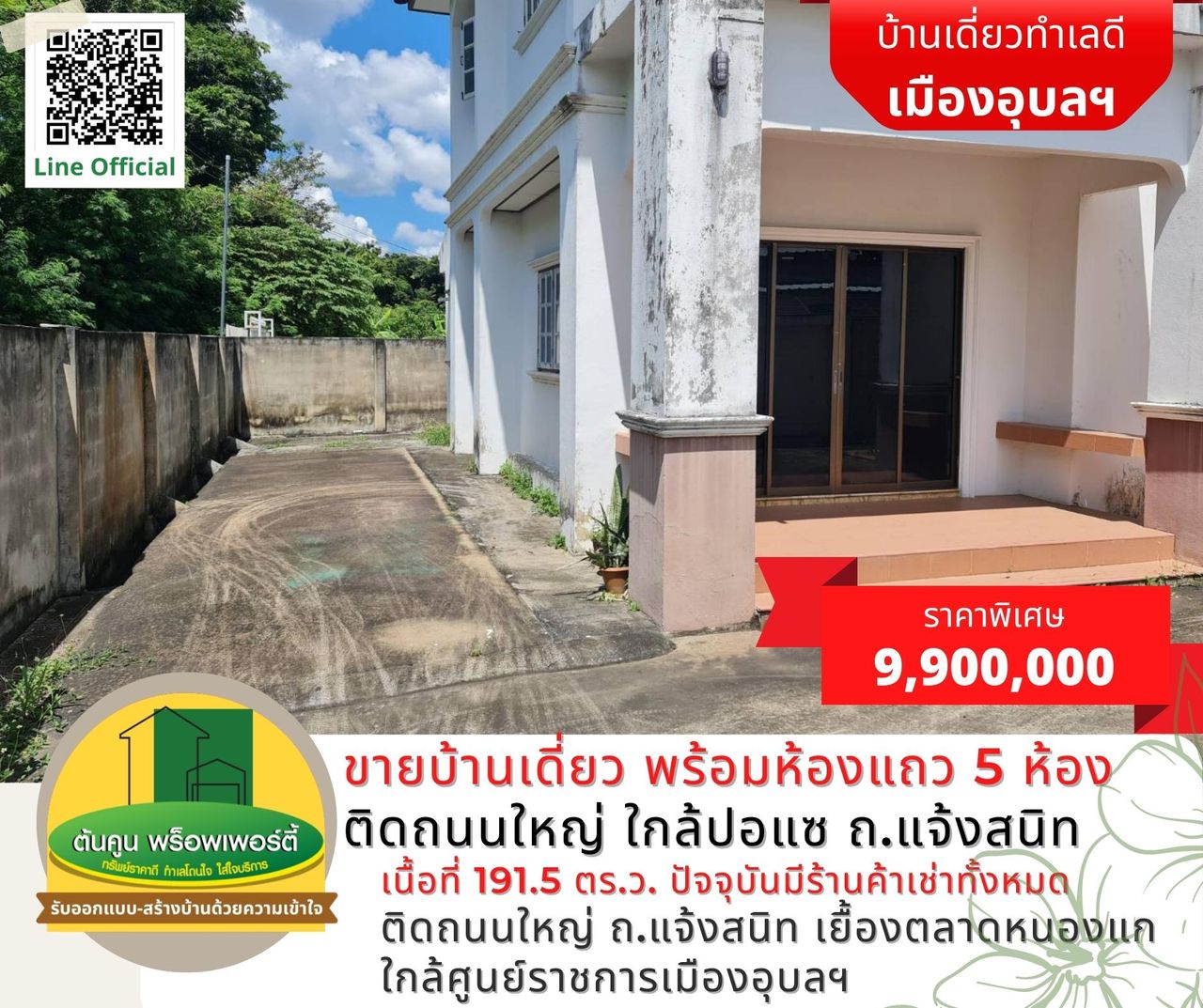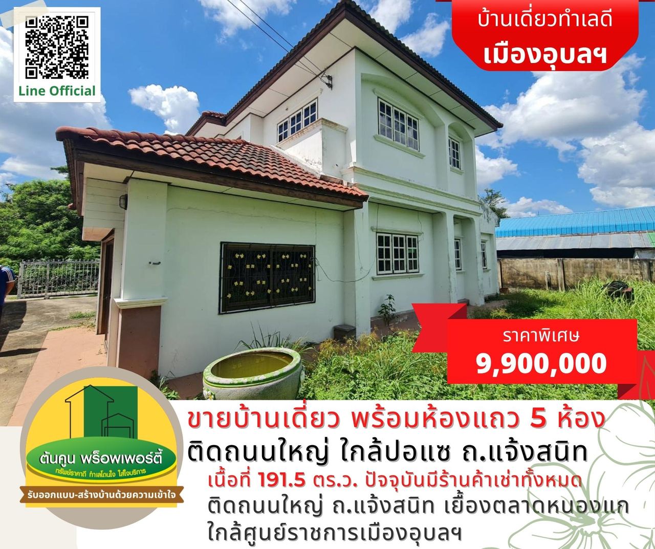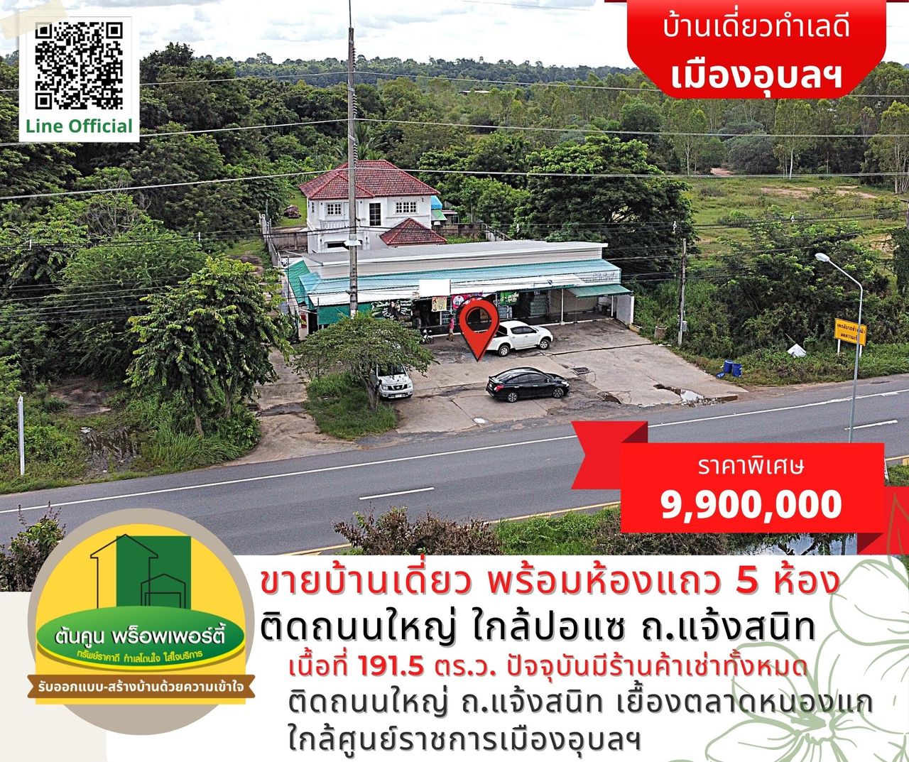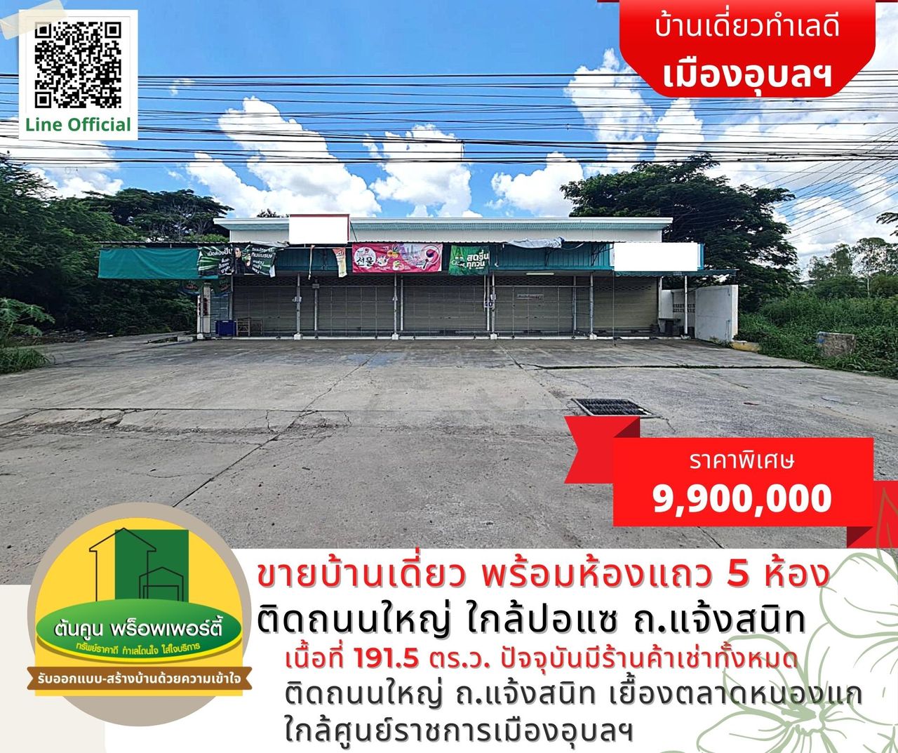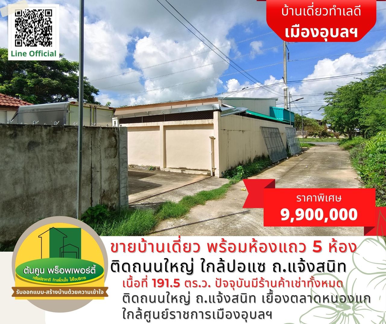 ขายบ้านเดี่ยว พร้อมห้องแถวจำนวน 5 ห้อง ติดถนนใหญ่ฝั่งเข้าเมือง ใกล้ปอแซ ถ.แจ้งสนิท เมืองอุบลฯ เนื้อที่รวม 191.5 ตร.ว.