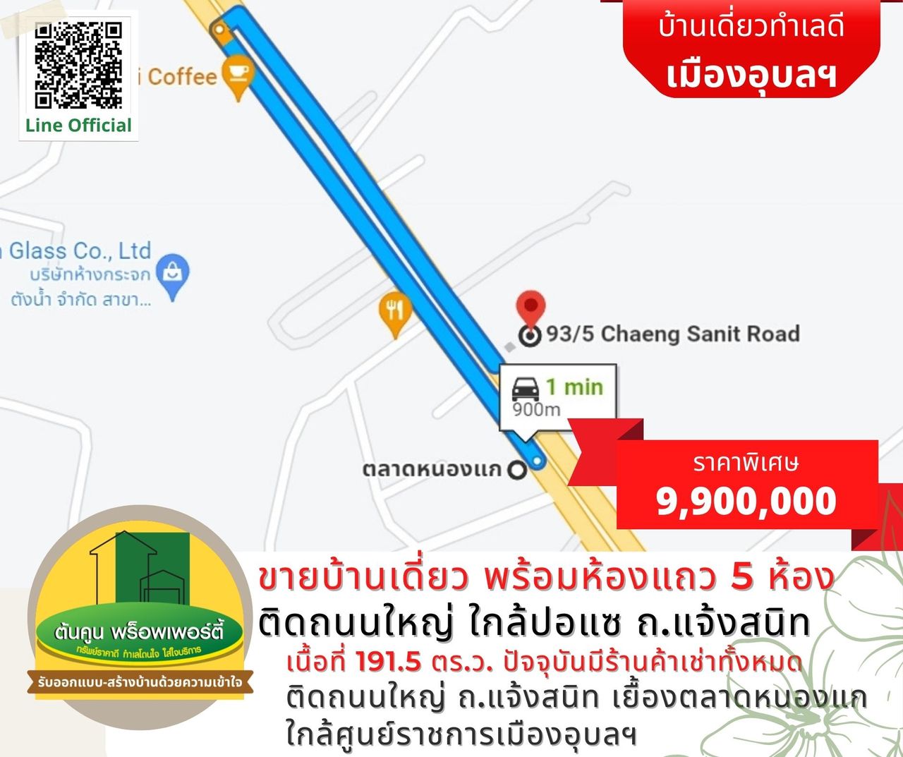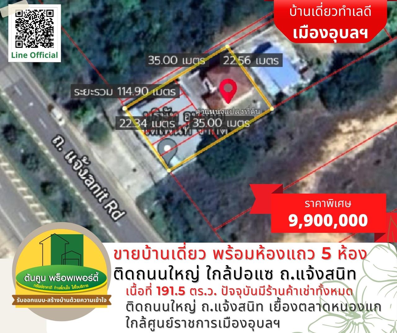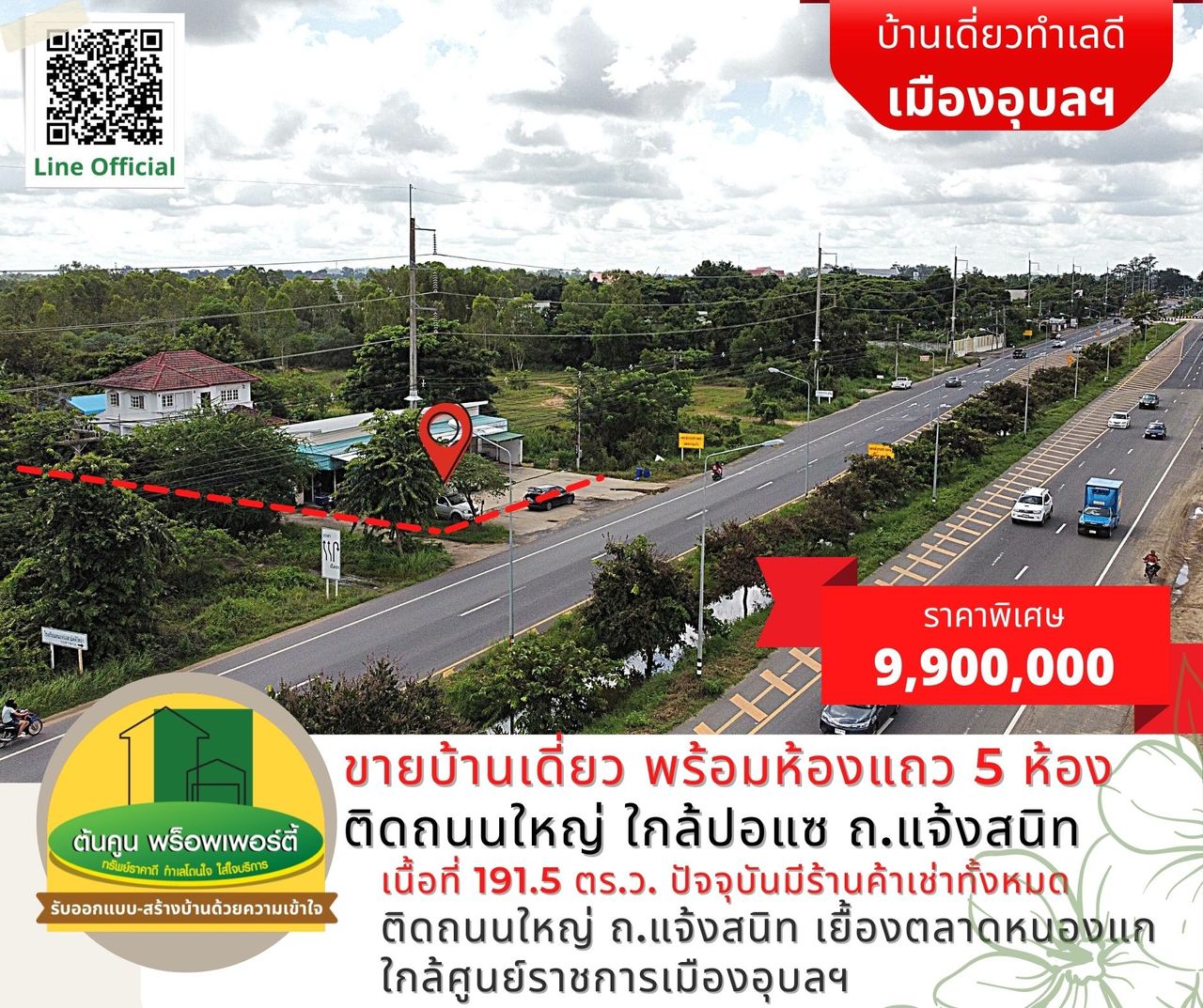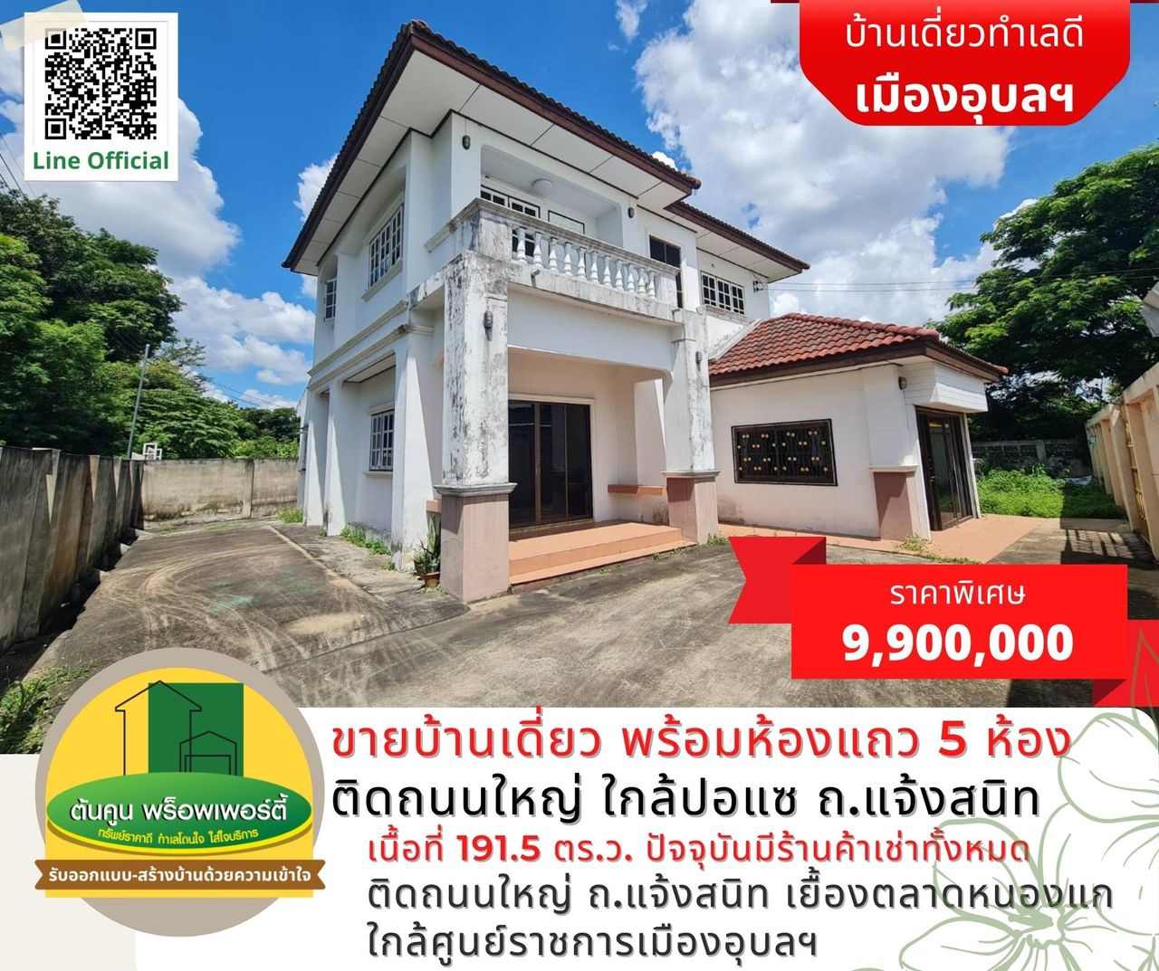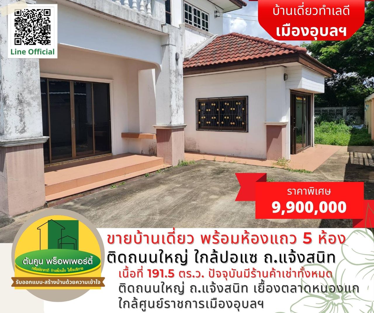 ขายบ้านเดี่ยว พร้อมห้องแถวจำนวน 5 ห้อง ติดถนนใหญ่ฝั่งเข้าเมือง ใกล้ปอแซ ถ.แจ้งสนิท เมืองอุบลฯ เนื้อที่รวม 191.5 ตร.ว.