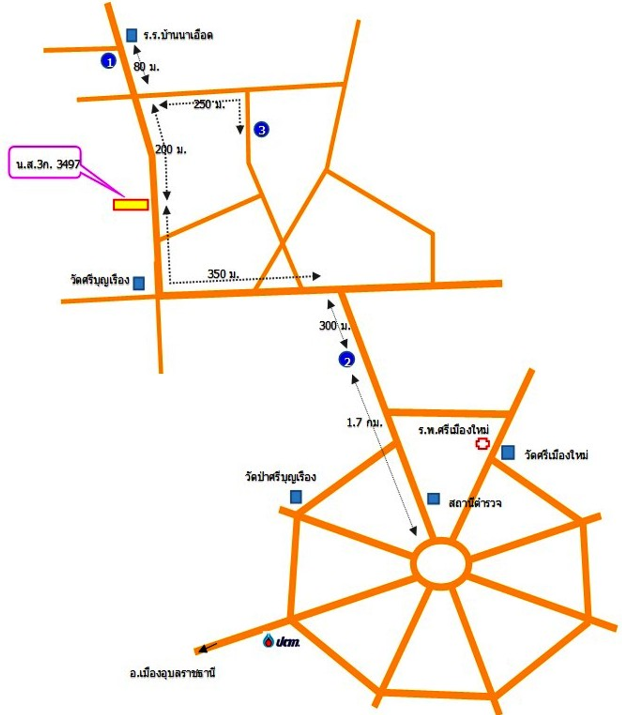 ที่ตั้ง : แยกจากถนนวงกลมศรีไตรสาร ต.นาคำ อ.ศรีเมืองใหม่ จ.อุบลราชธานี