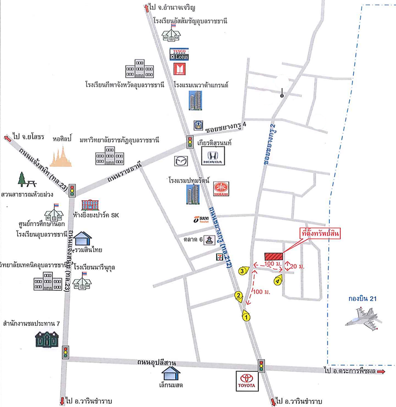ที่ตั้ง : ห่างจากถนนชยางกูรประมาณ 220 ม. ถึงทรัพย์