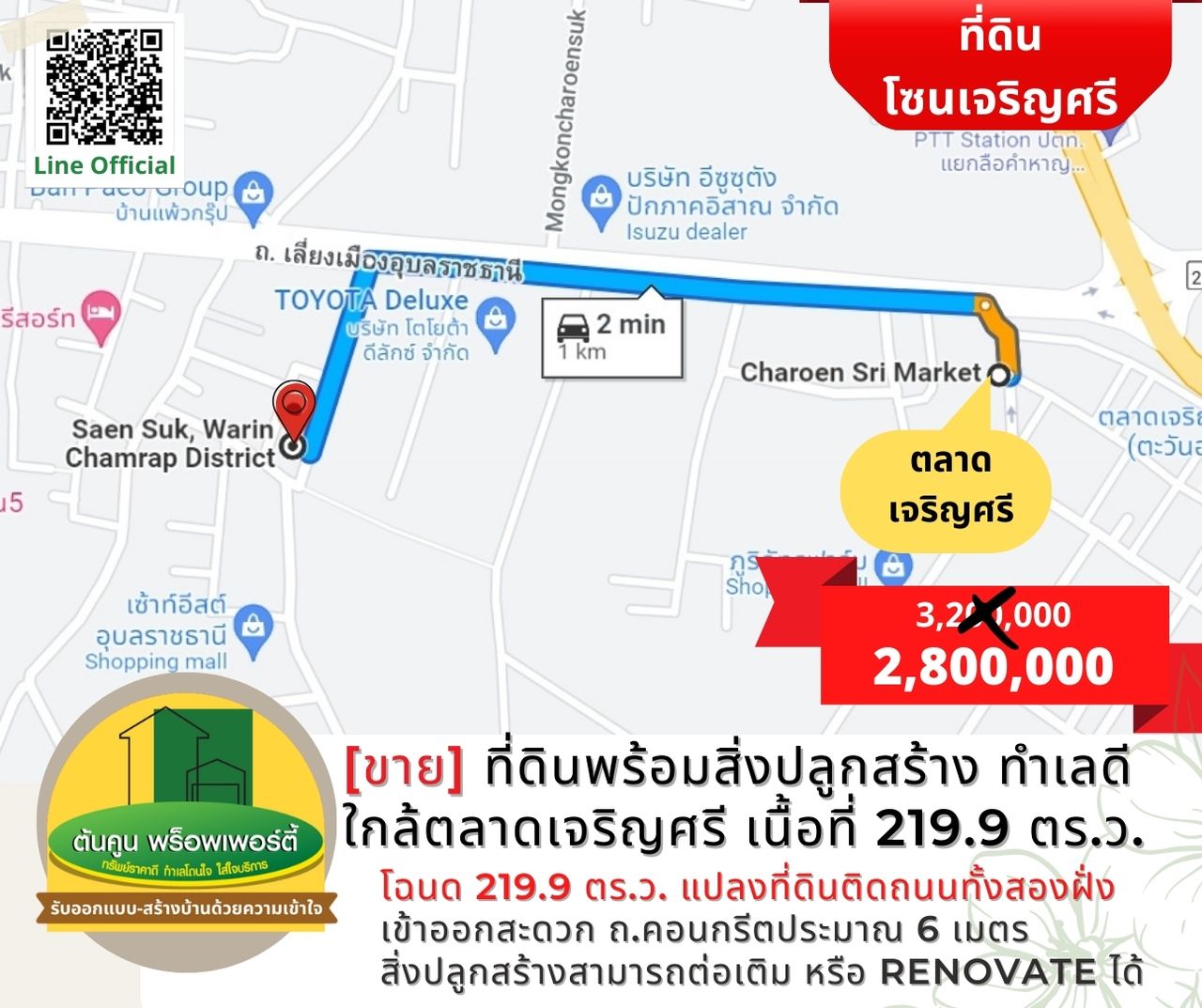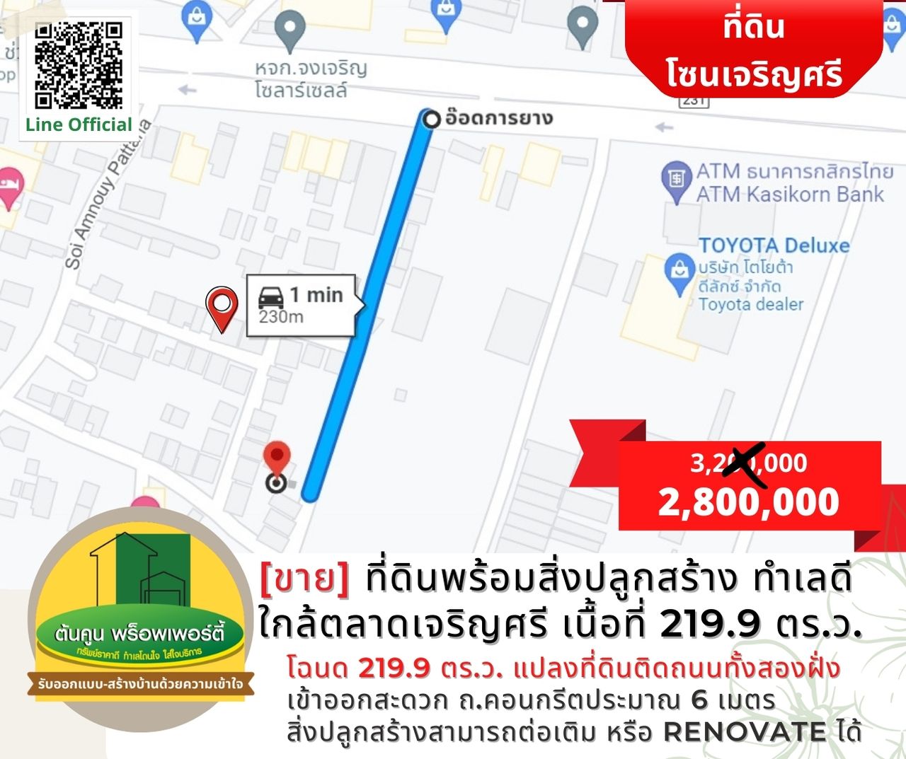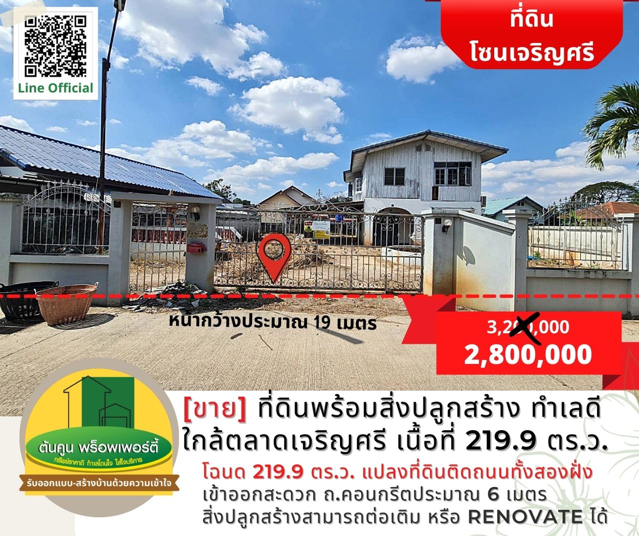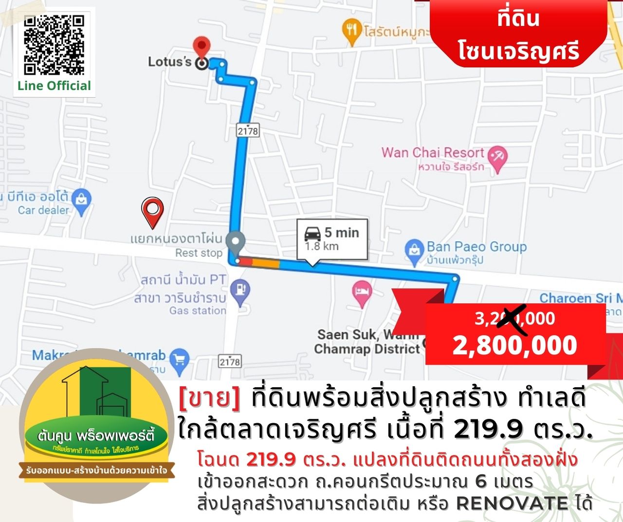 ราคาพิเศษ! ขายที่ดินพร้อมสิ่งปลูกสร้าง ทำเลดี ใกล้ตลาดเจริญศรี เนื้อที่ 219.9 ตร.ว.