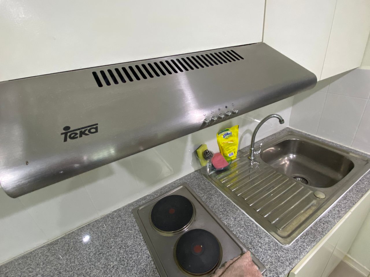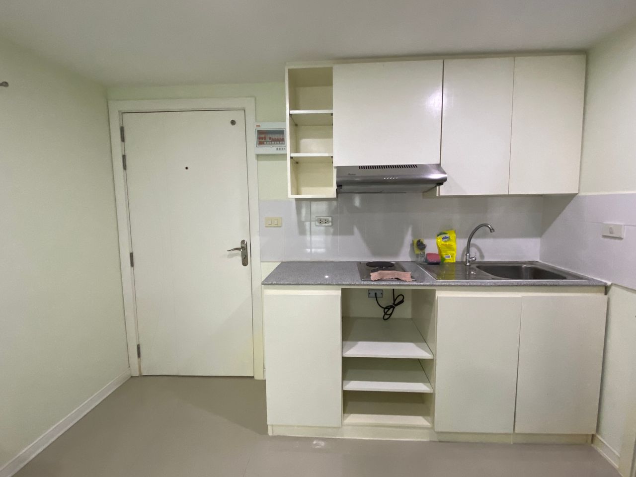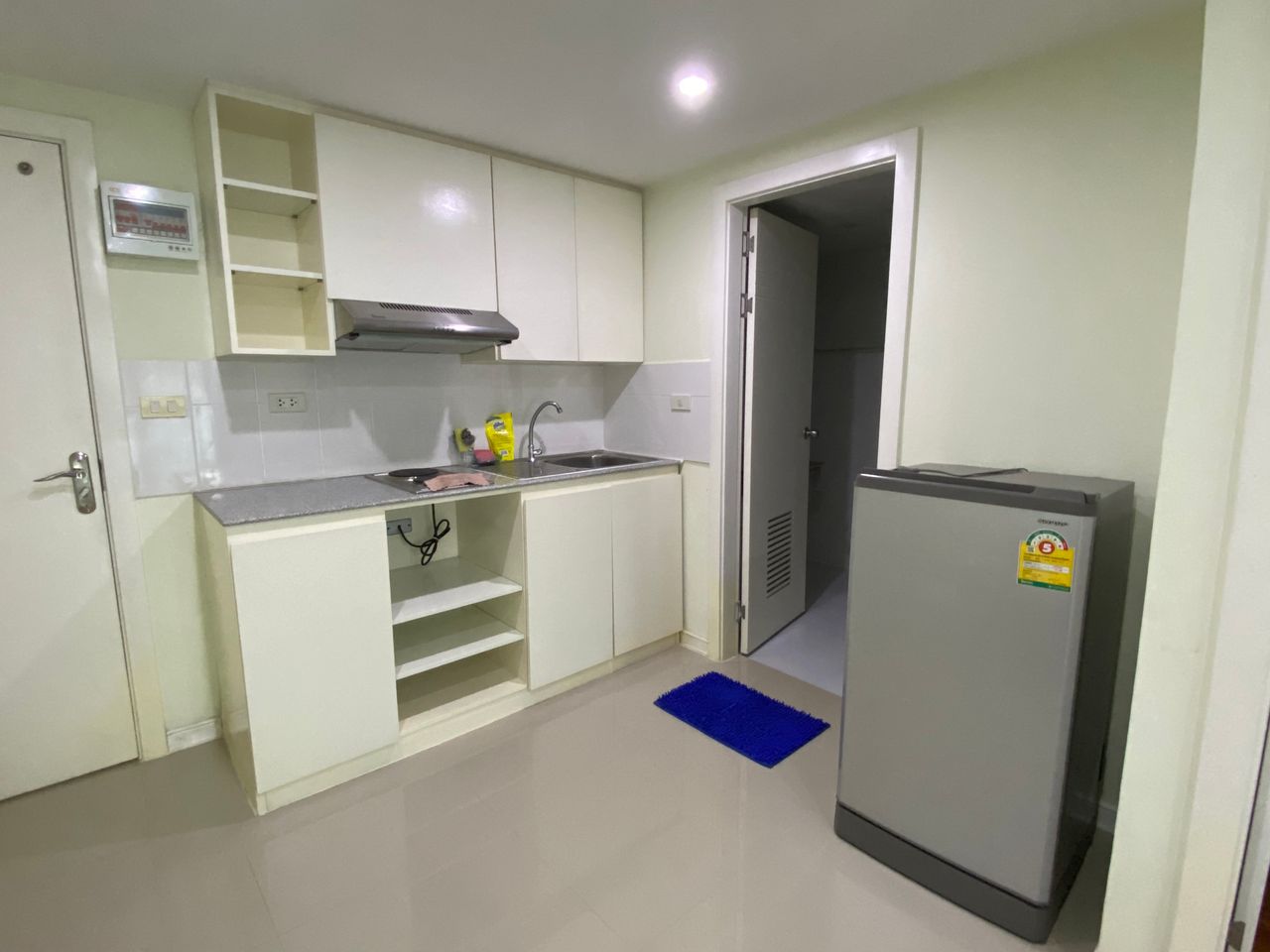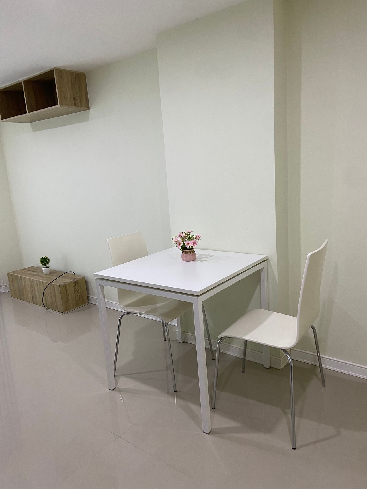 ห้องนั่งเล่น/ห้องครัว : โซฟาเบด ชุดโต๊ะรับประทานอาหาร 2 ที่นั่ง ตู้เย็น ซิ้งค์ล้างจาน เตาไฟฟ้า เครื่องดูดควัน ตู้เก็บจาน