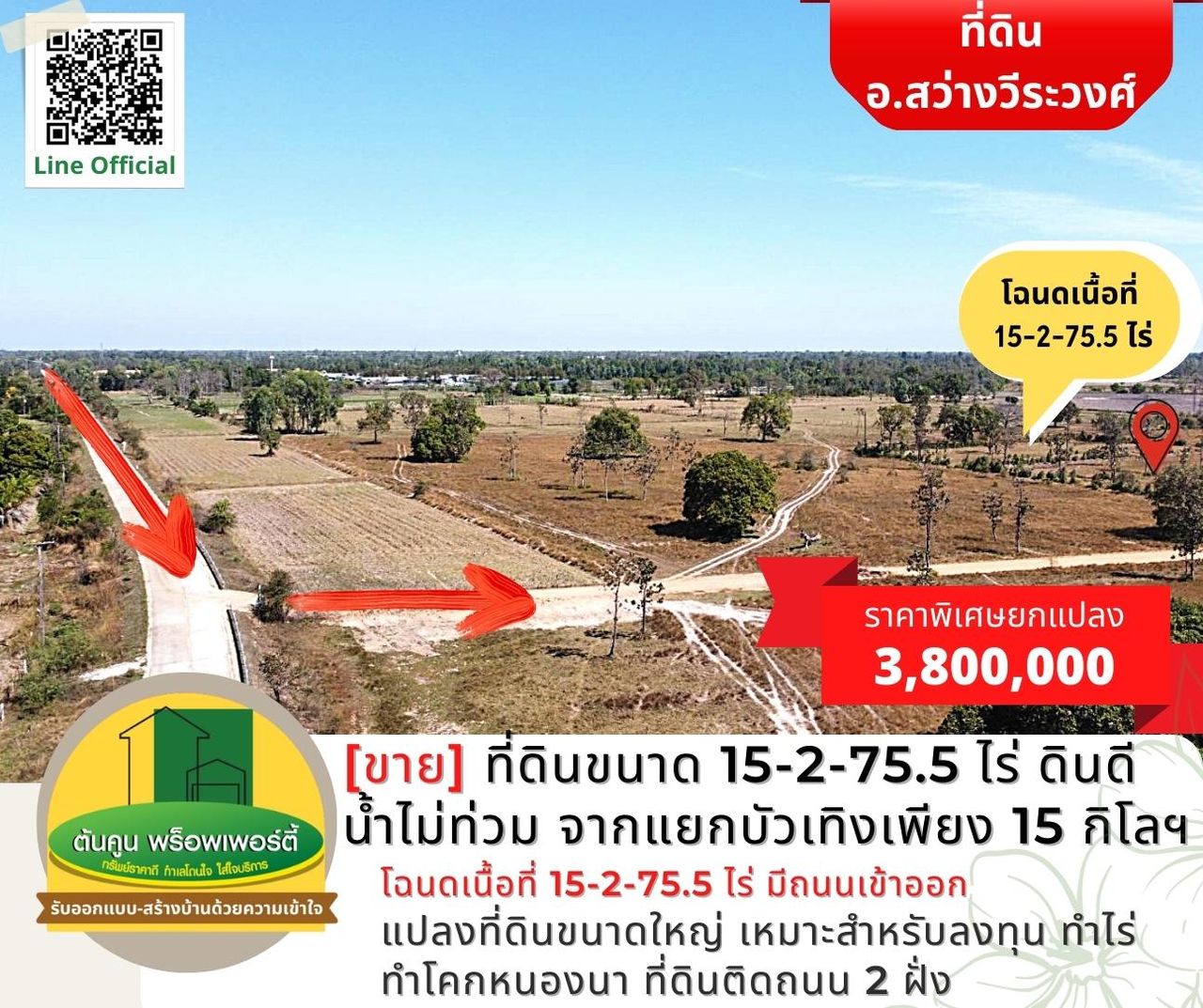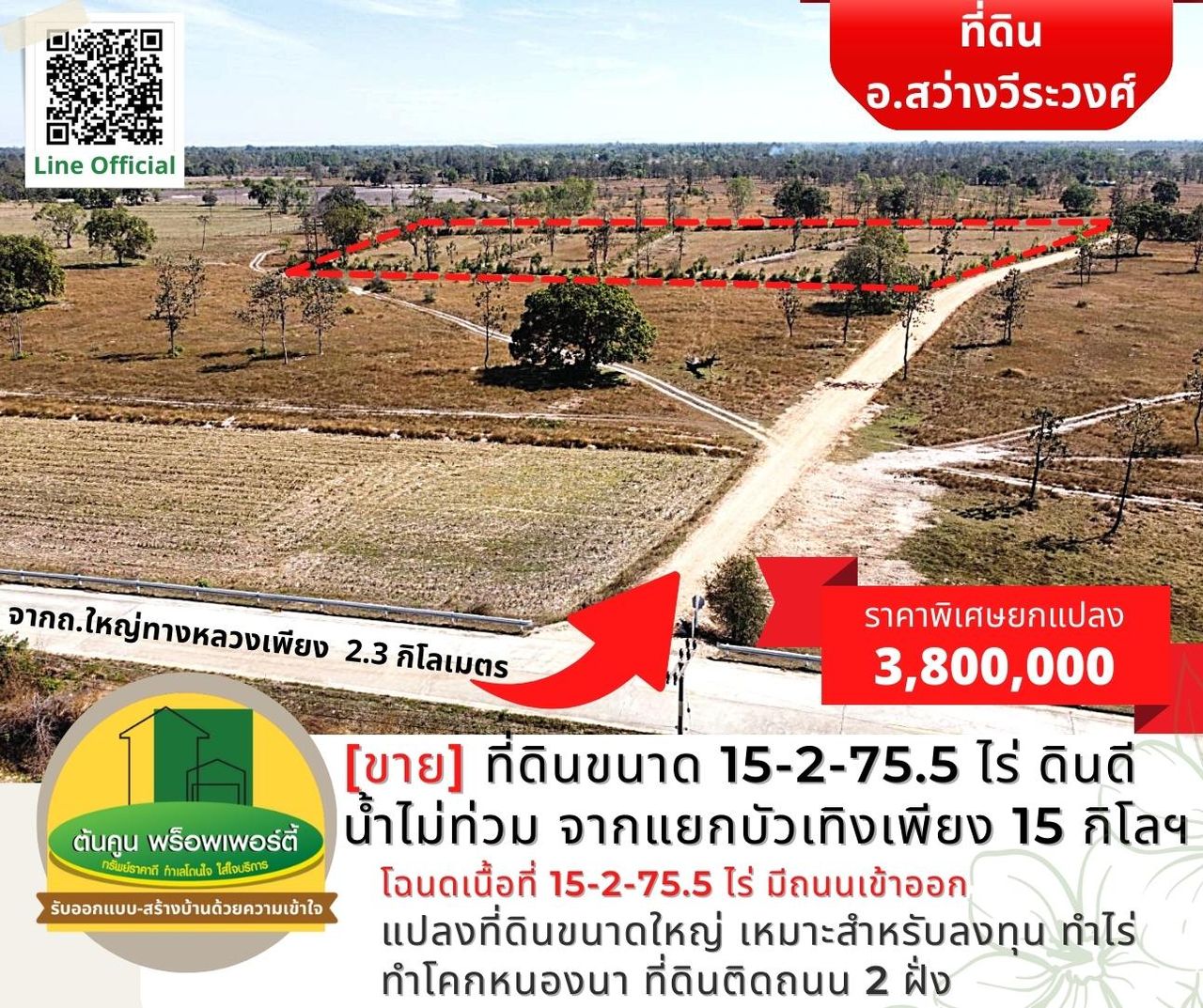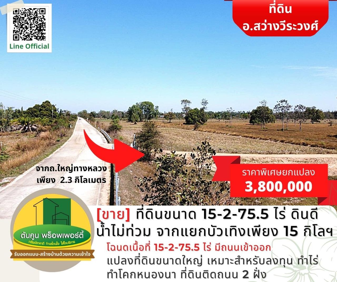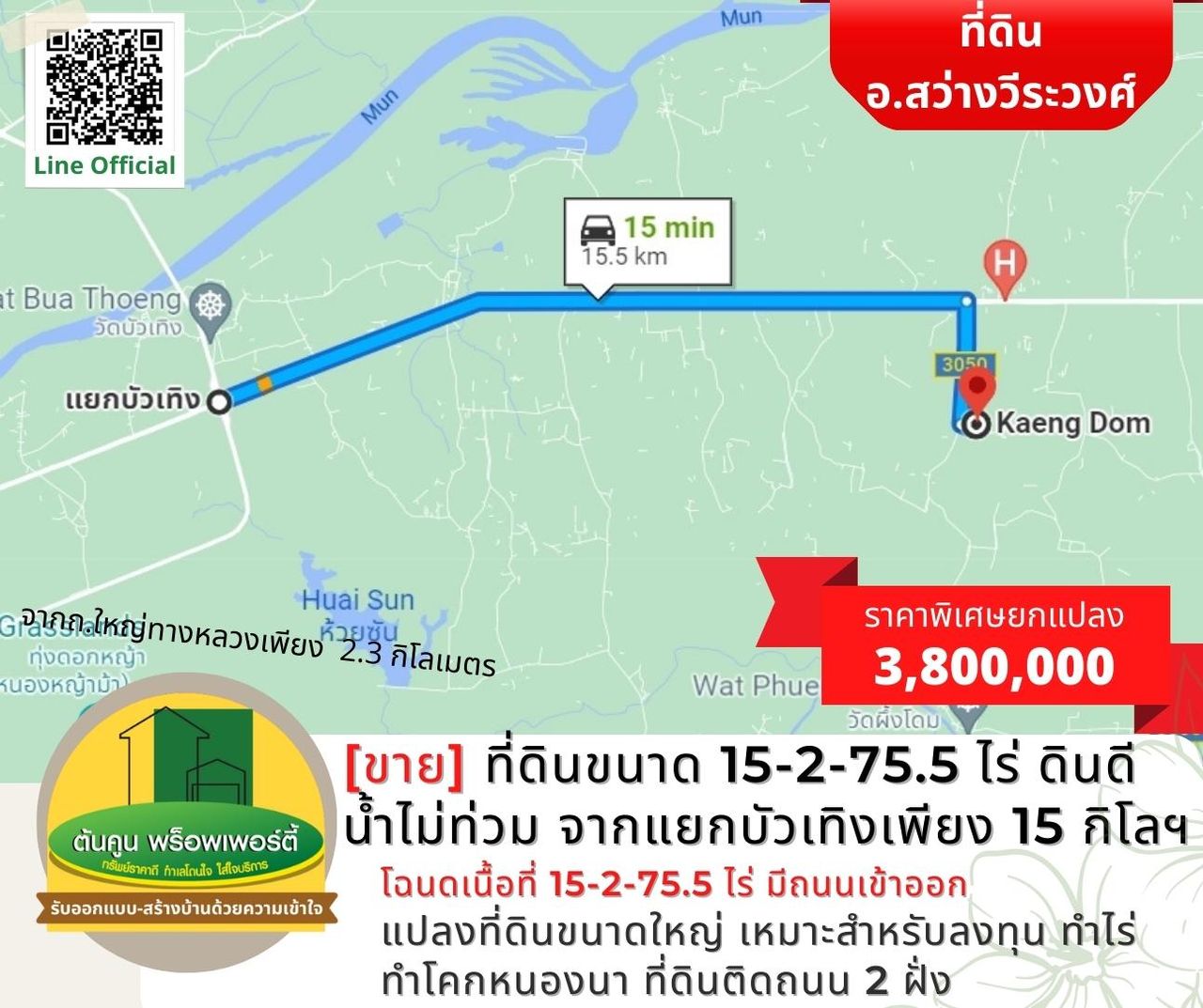 [ขาย] ที่ดินขนาด 15-2-75.5 ไร่ ดินดี น้ำไม่ท่วม ห่างจากแยกบัวเทิงประมาณ 15 กิโลฯ สว่างวีระวงศ์ - แก่งโดม
