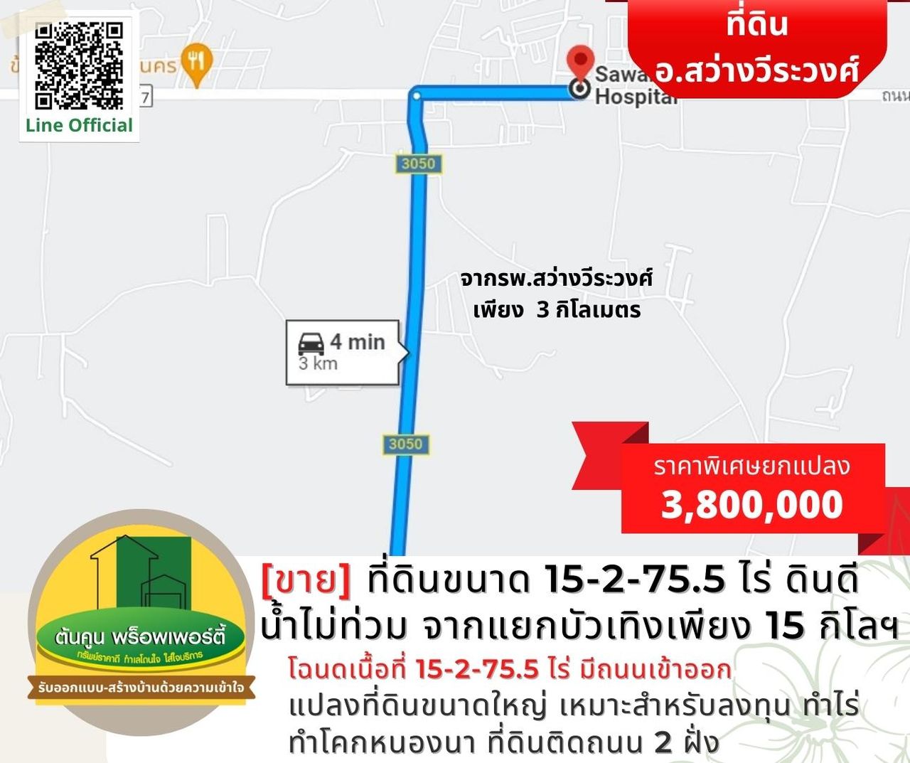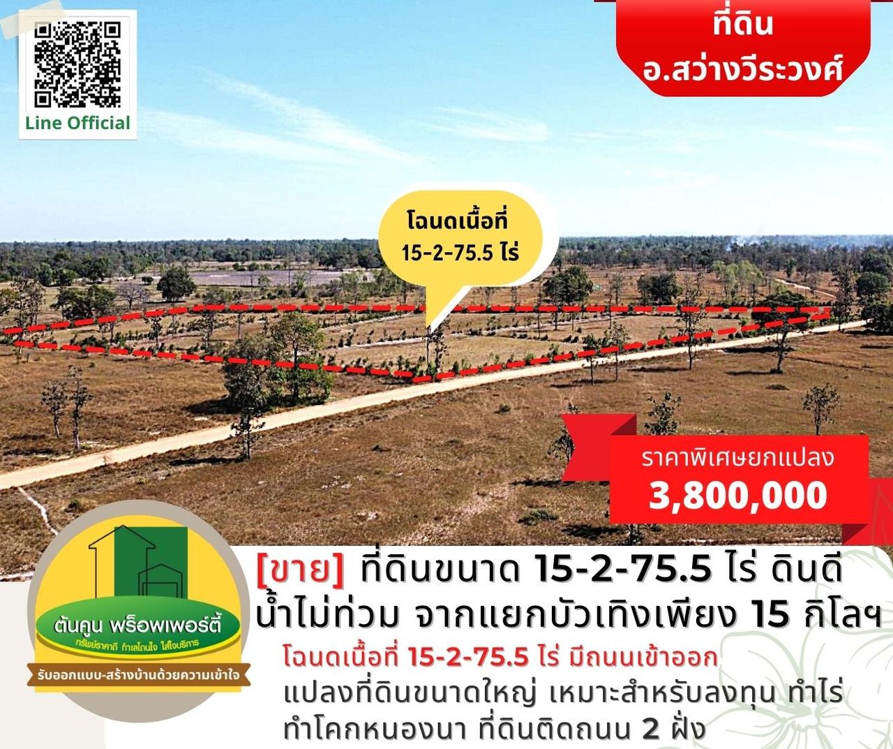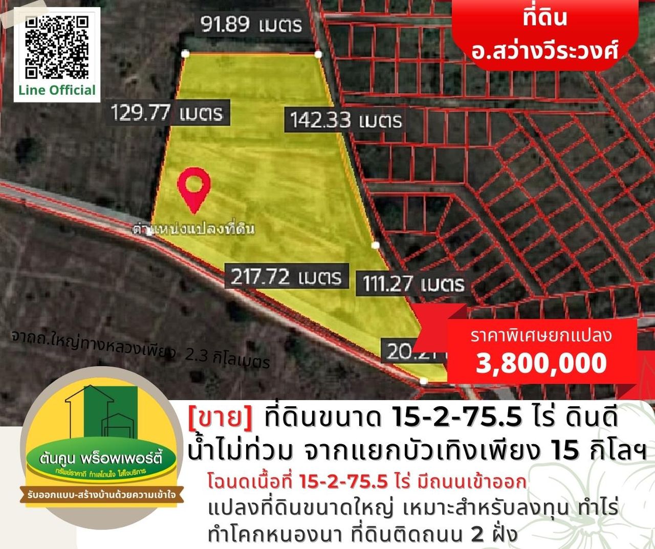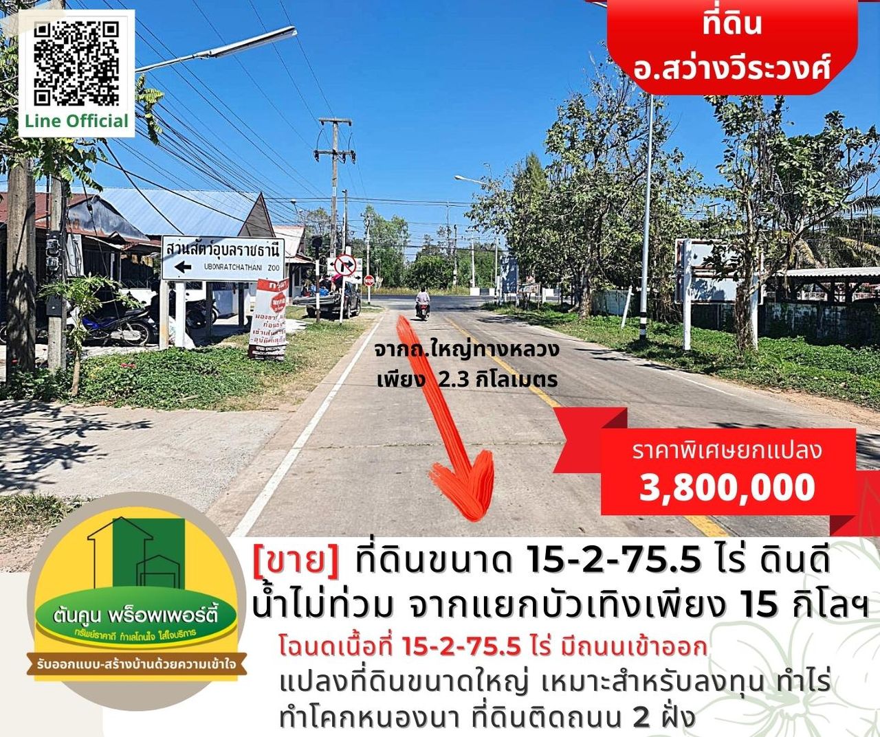 [ขาย] ที่ดินขนาด 15-2-75.5 ไร่ ดินดี น้ำไม่ท่วม ห่างจากแยกบัวเทิงประมาณ 15 กิโลฯ สว่างวีระวงศ์ - แก่งโดม
