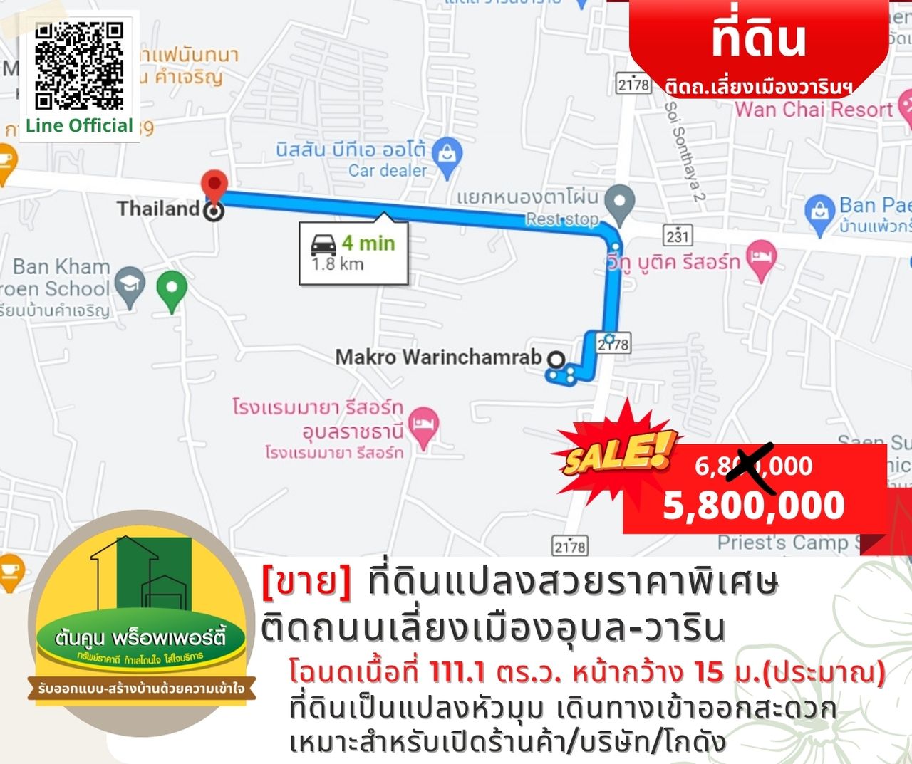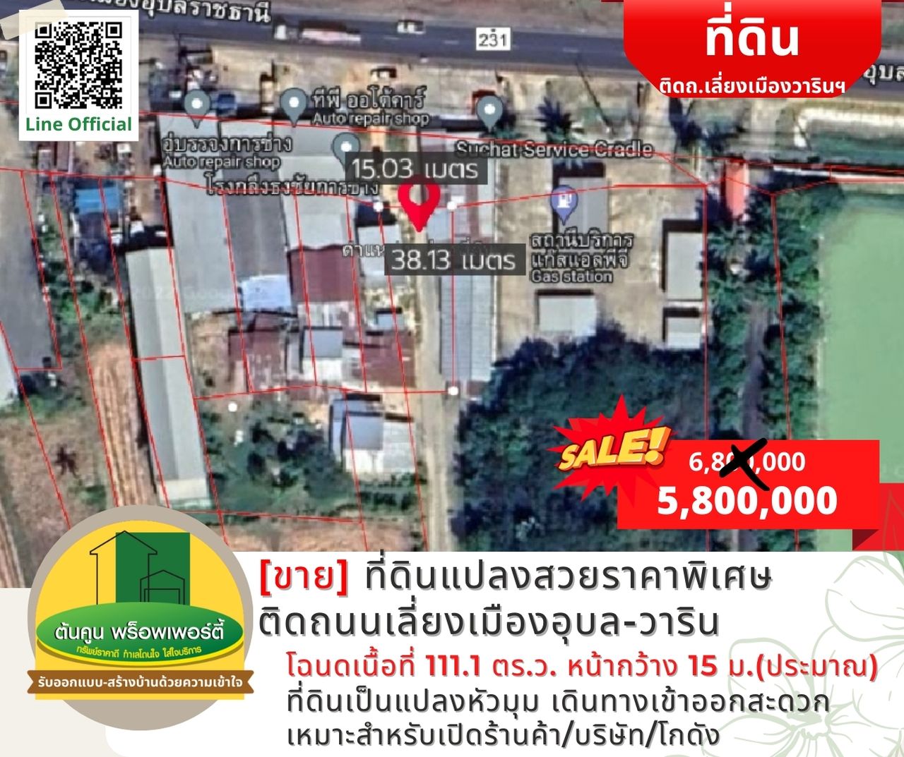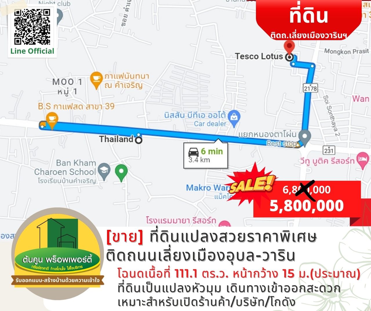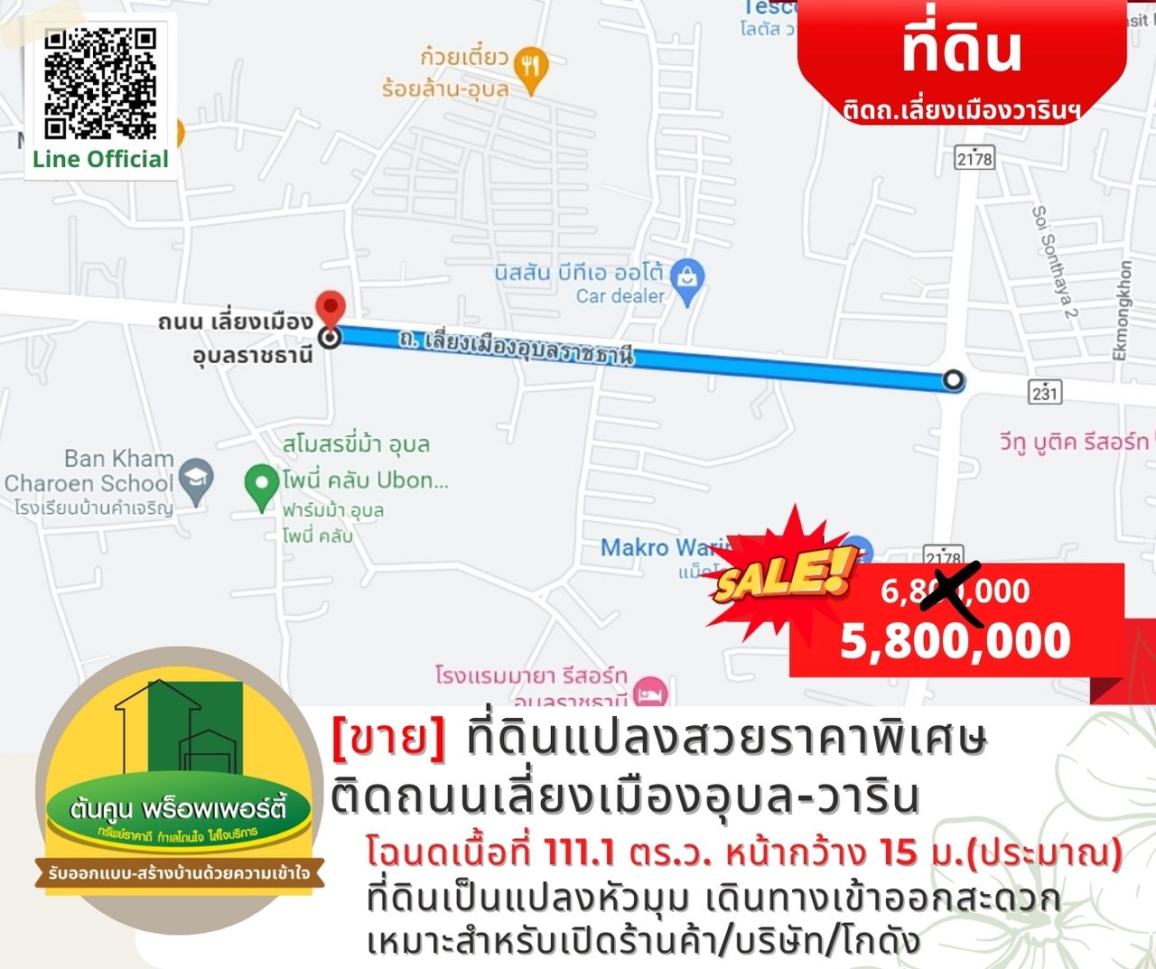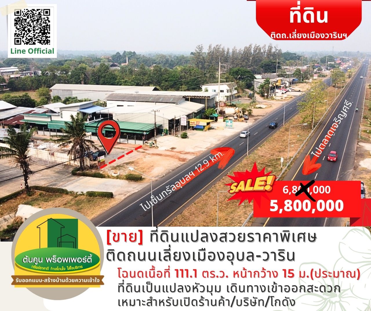 [ขาย] ที่ดินแปลงสวย #ราคาพิเศษ ติดถนนเลี่ยงเมืองอุบล-วาริน ขนาด 111.1 ตร.ว. ทำเลดี เมืองวารินฯ