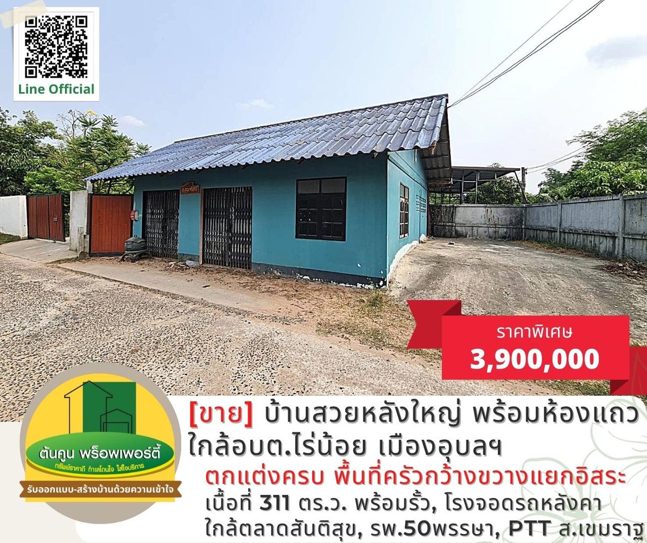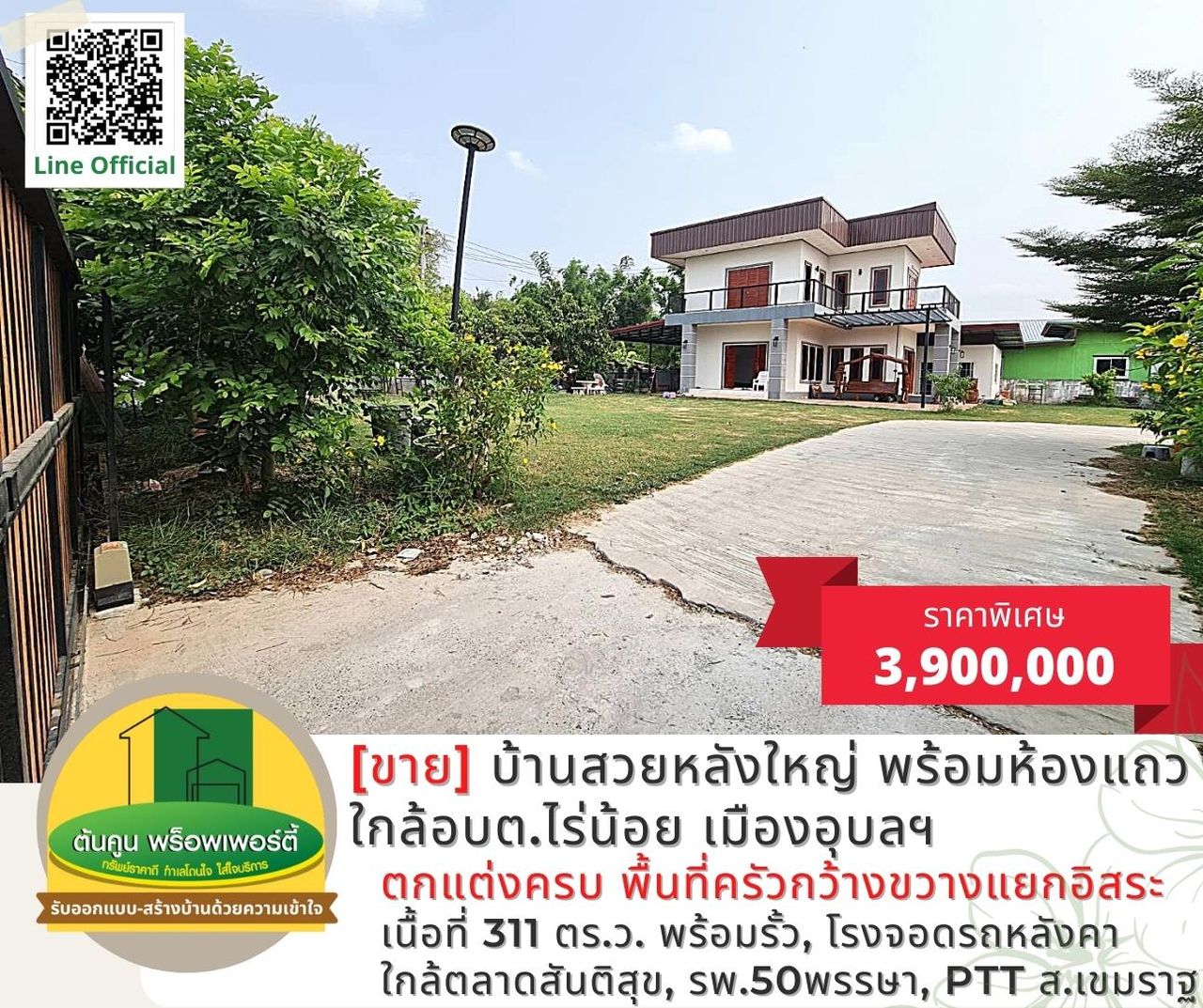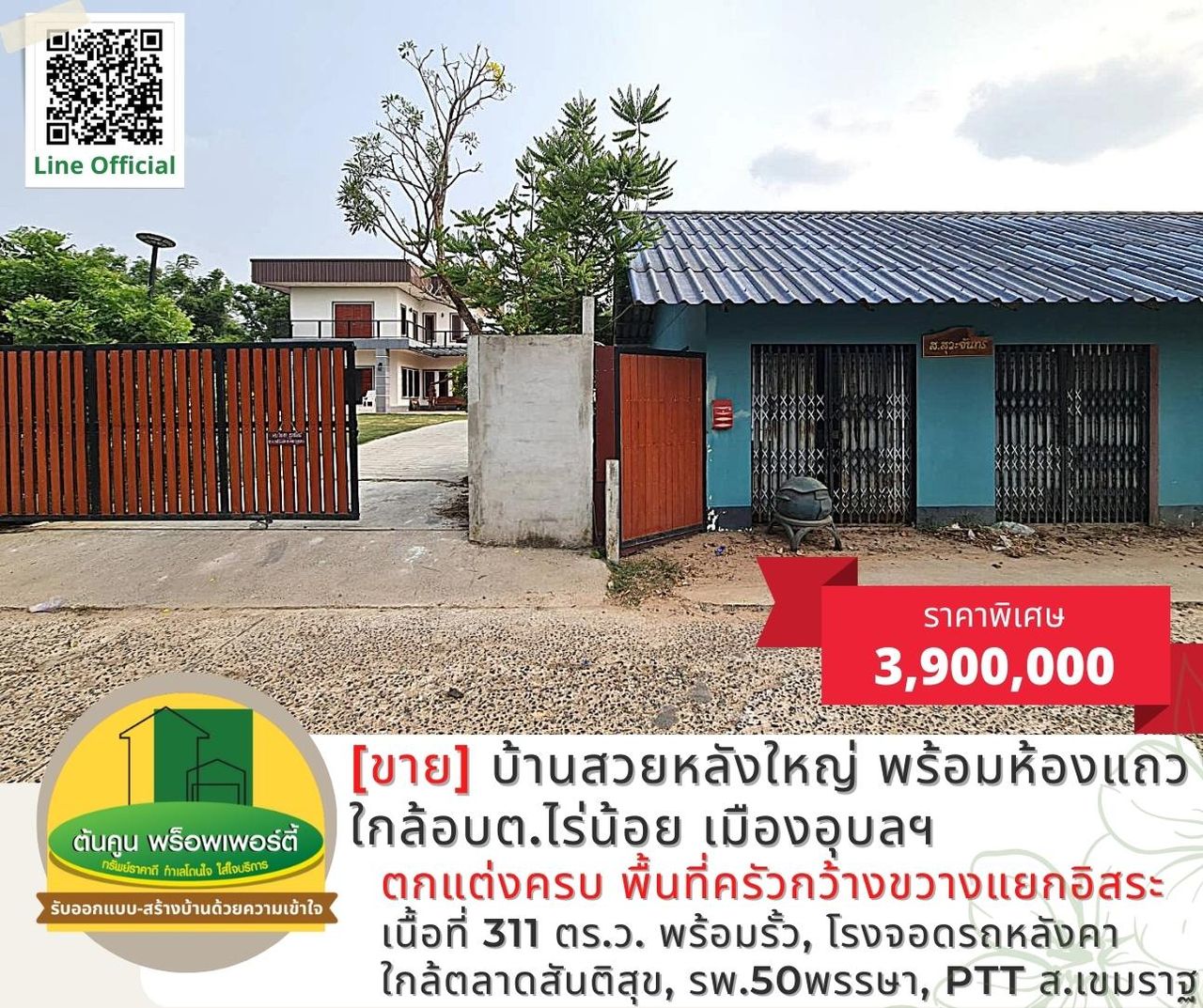 [ขาย] บ้านสวยหลังใหญ่ พร้อมห้องแถว บนโฉนดเนื้อที่ 311 ตรว. ติดถนนคอนกรีต เส้นอุบล-ตระการ เมืองอุบลฯ