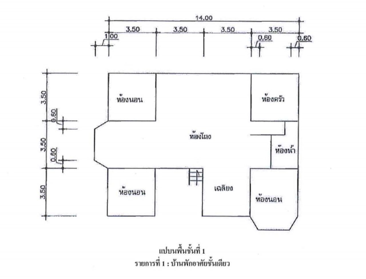 บ้านเดี่ยวชั้นเดียว ขนาด 10.5*15 ม. พื้นที่ใช้สอย 140.55 ตร.ม. ประกอบด้วย 3 ห้องนอน 1 ห้องน้ำ 1 ห้องครัว และโรงจอดรถ