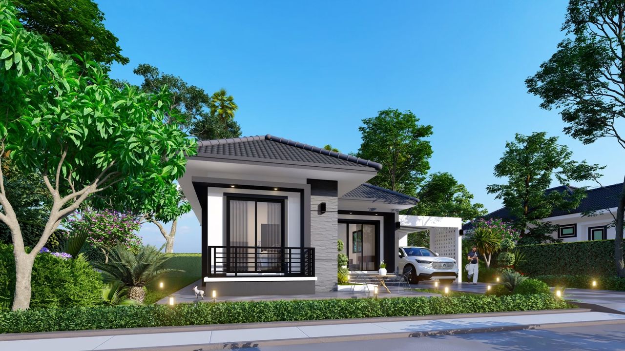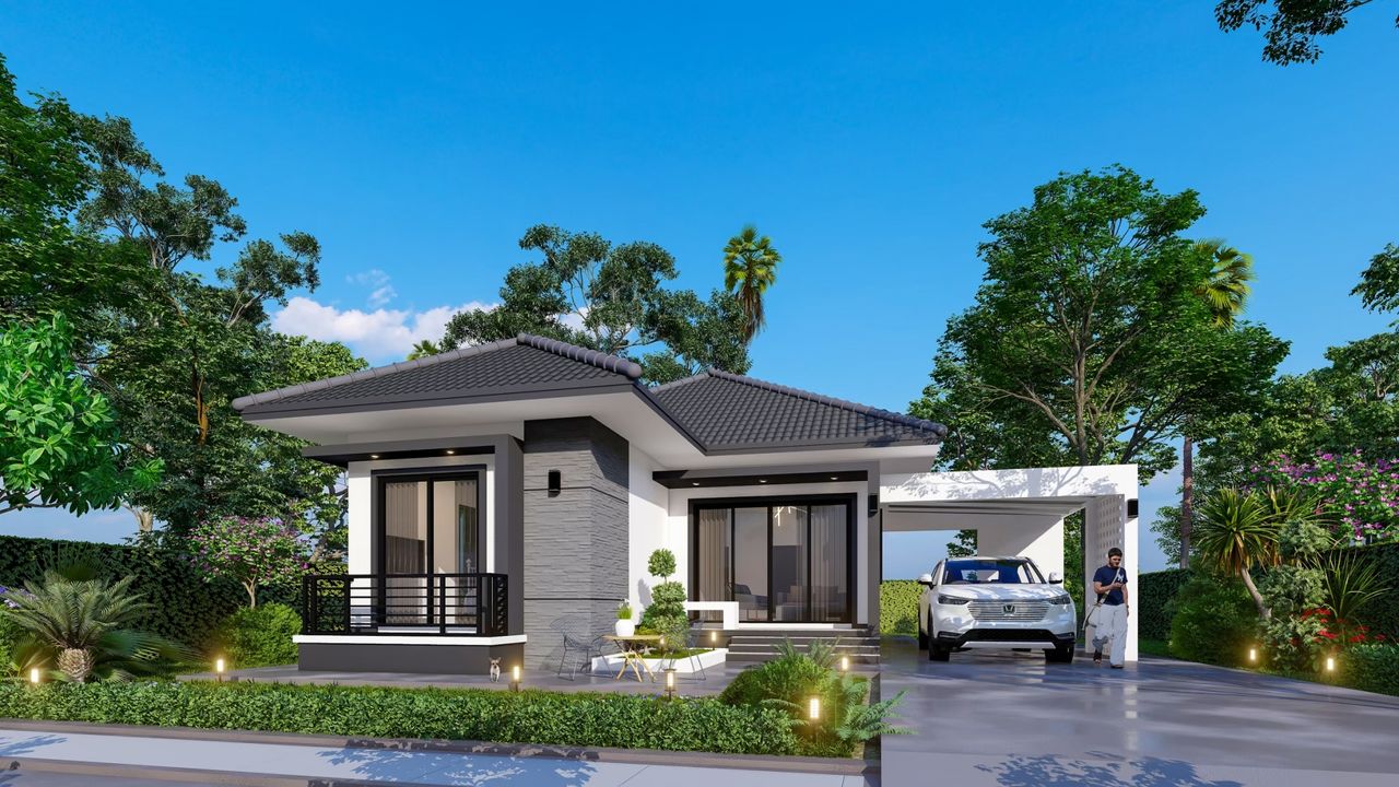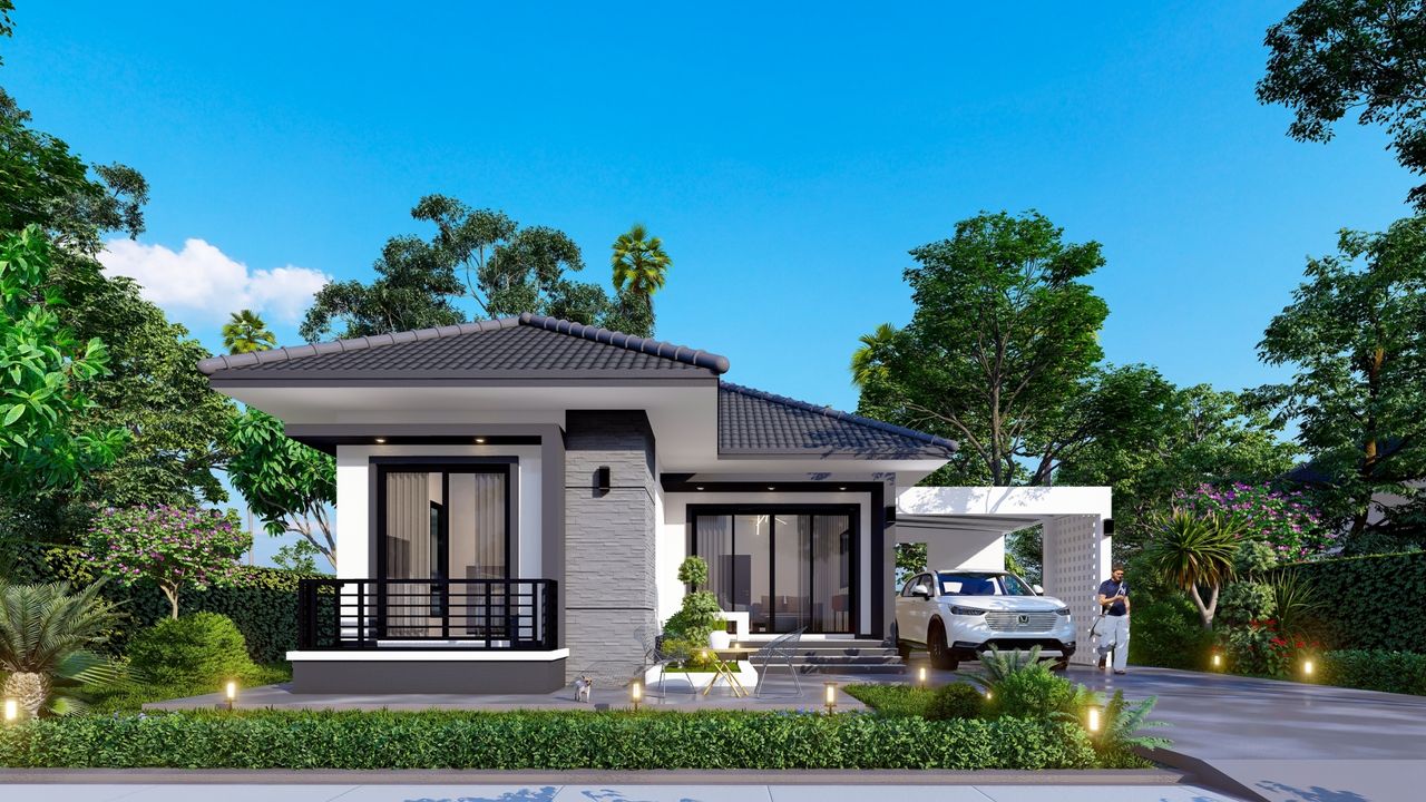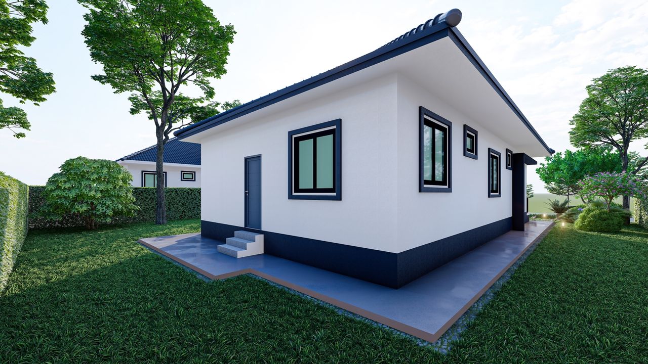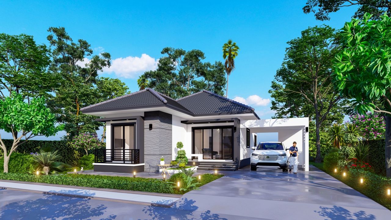 บ้านทรงปั้นหยา การตกแต่งคุมโทนด้วยสีเทา ขาว ดำ มีระเบื้องห้องสำหรับลูกค้าที่ชอบช่องแสงแบบจัดเต็ม