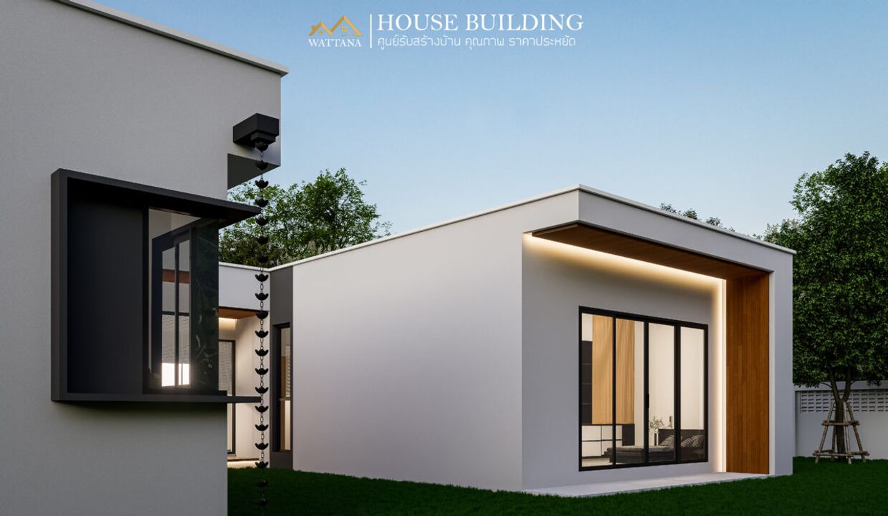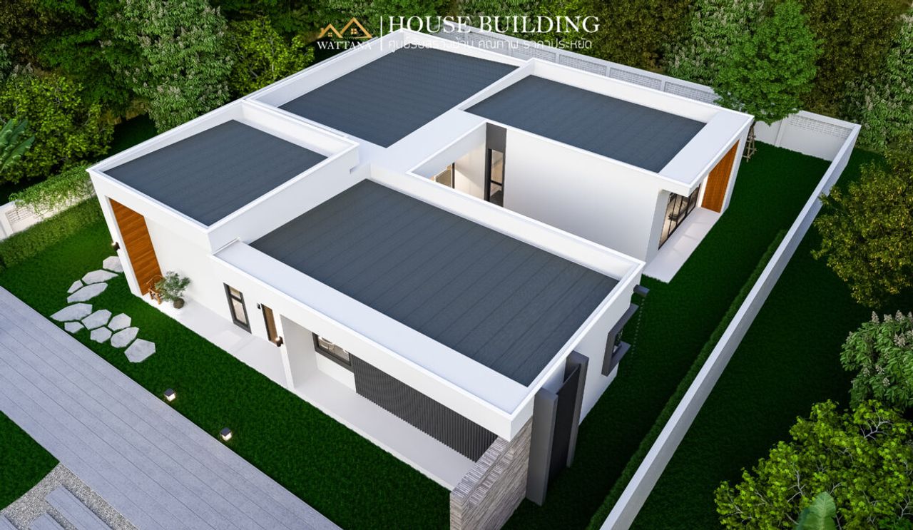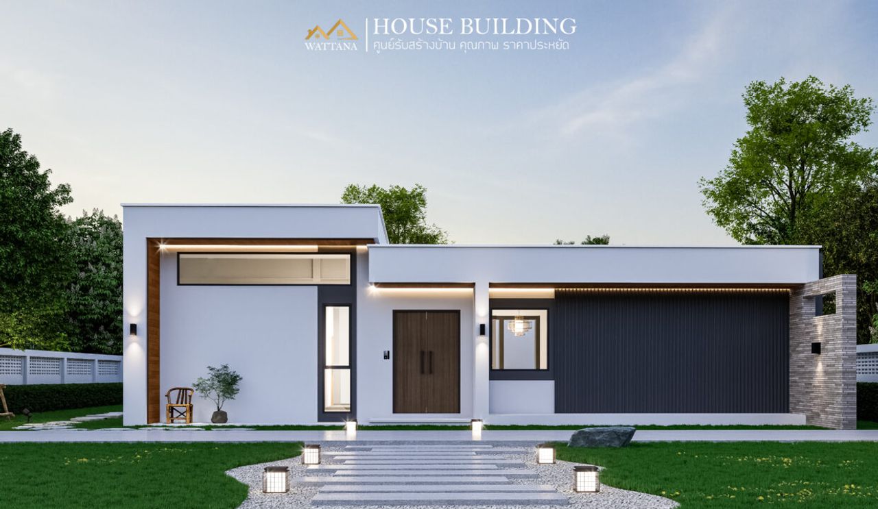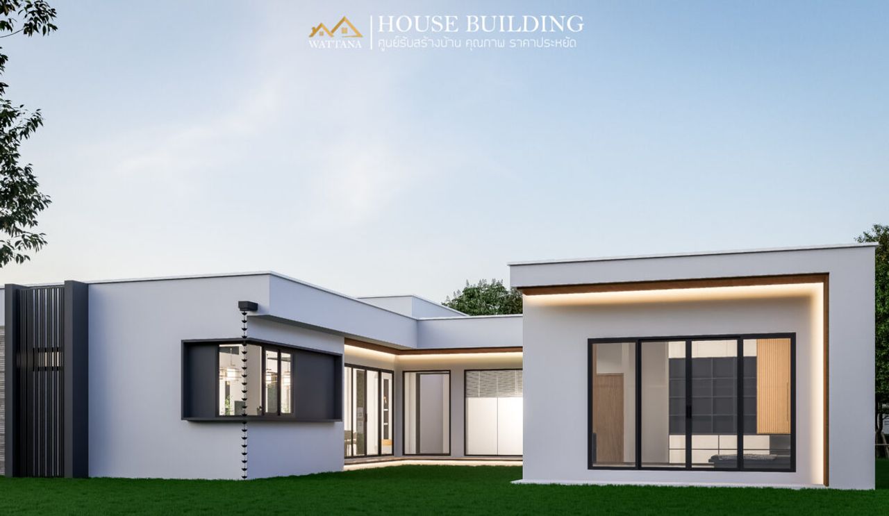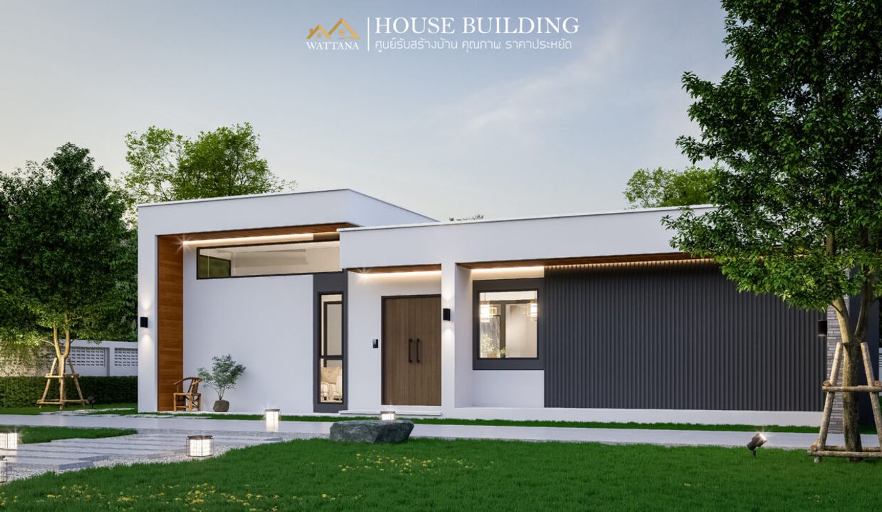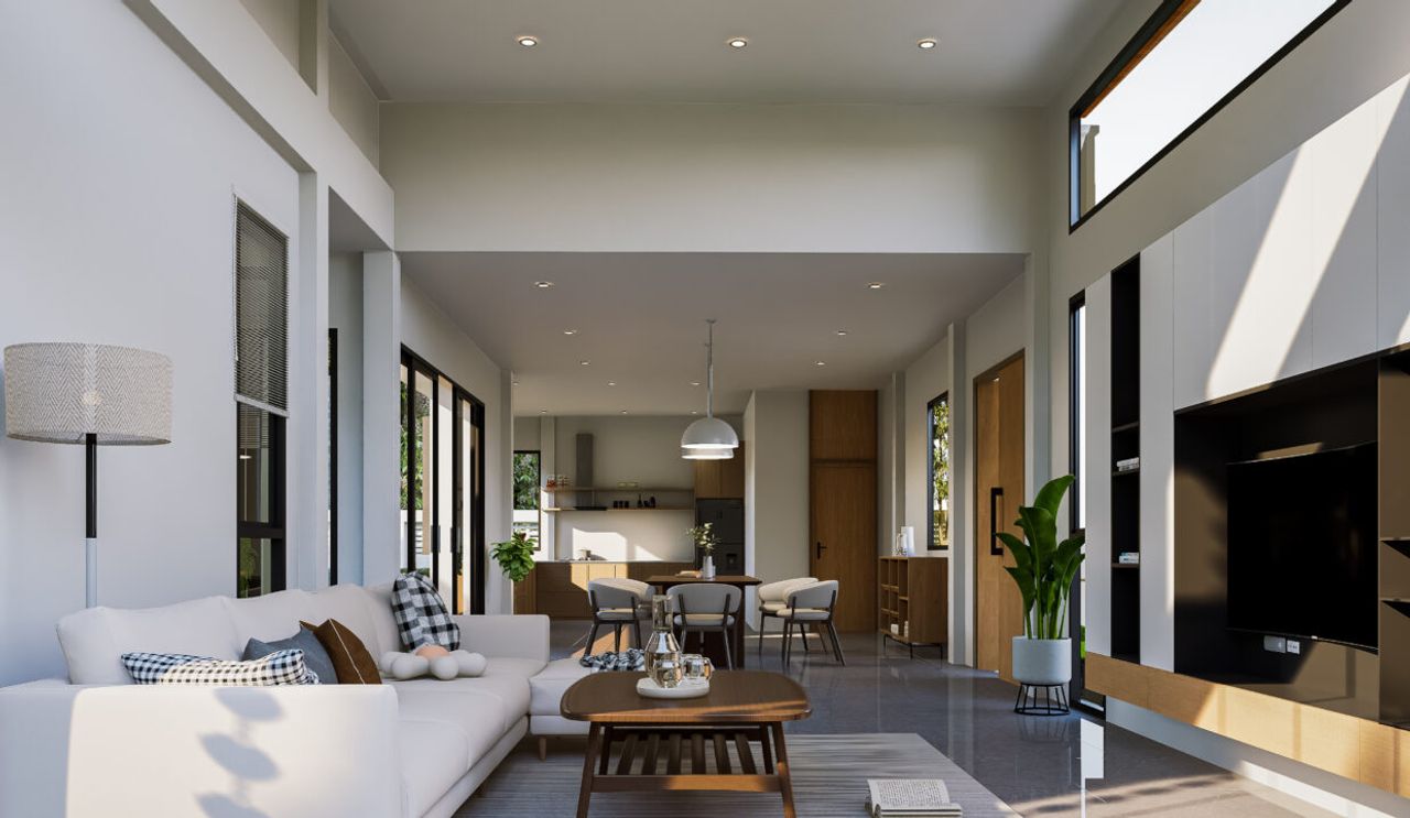 บ้านสไตล์โมเดิร์น (Modern) โดยมีส่วนกลางบ้านที่เป็นโซนนั่งเล่นที่เพดานยกสูง ต่อด้วยโซนรับประทานอาหาร เเละโซนครัวที่เป็นปัจจัยหลักที่สมาชิกในครอบครัวจะอาศัยอยู่ร่วมกันมากที่สุด ทางเจ้าของบ้านจึงต้องการขนาดใหญ่เป็นพิเศษ จึงเป็นสไตล์ที่ตอบโจทย์ต่อการใช้งานที่ต้องการความรู้สึกโปร่งโล่ง สบายและช่วยระบายความร้อนจากสภาพอากาศได้ดี เนื่องจากเป็นสไตล์ที่สวยที่เรียบง่าย และแฝงไปด้วยความทันสมัย บ้านหลังนี้มาด้วยตัวอาคารสีขาวเทาไม้ ตัดกับระเเนงไม้ลอนโค้งเพื่อเพิ่มความโดดเด่นให้กับตัวบ้าน เป็นแบบบ้านที่ผสานความเรียบง่ายเน้นการใช้งานได้จริง