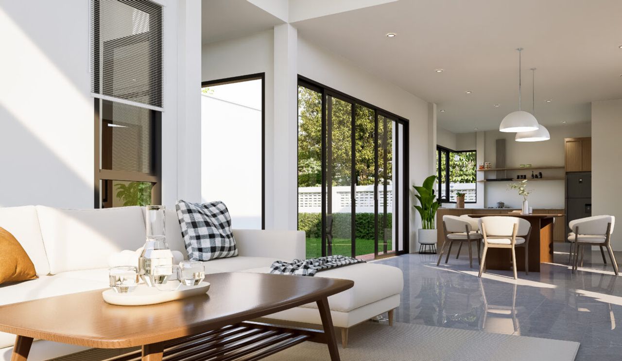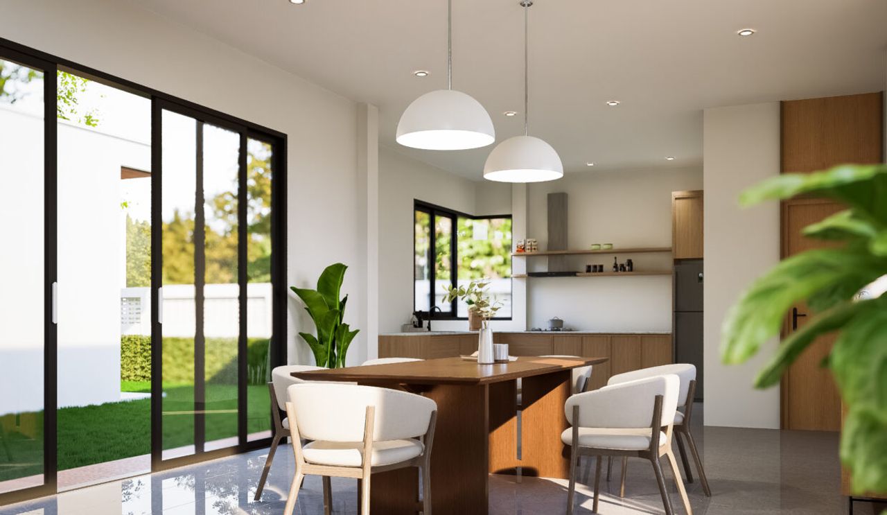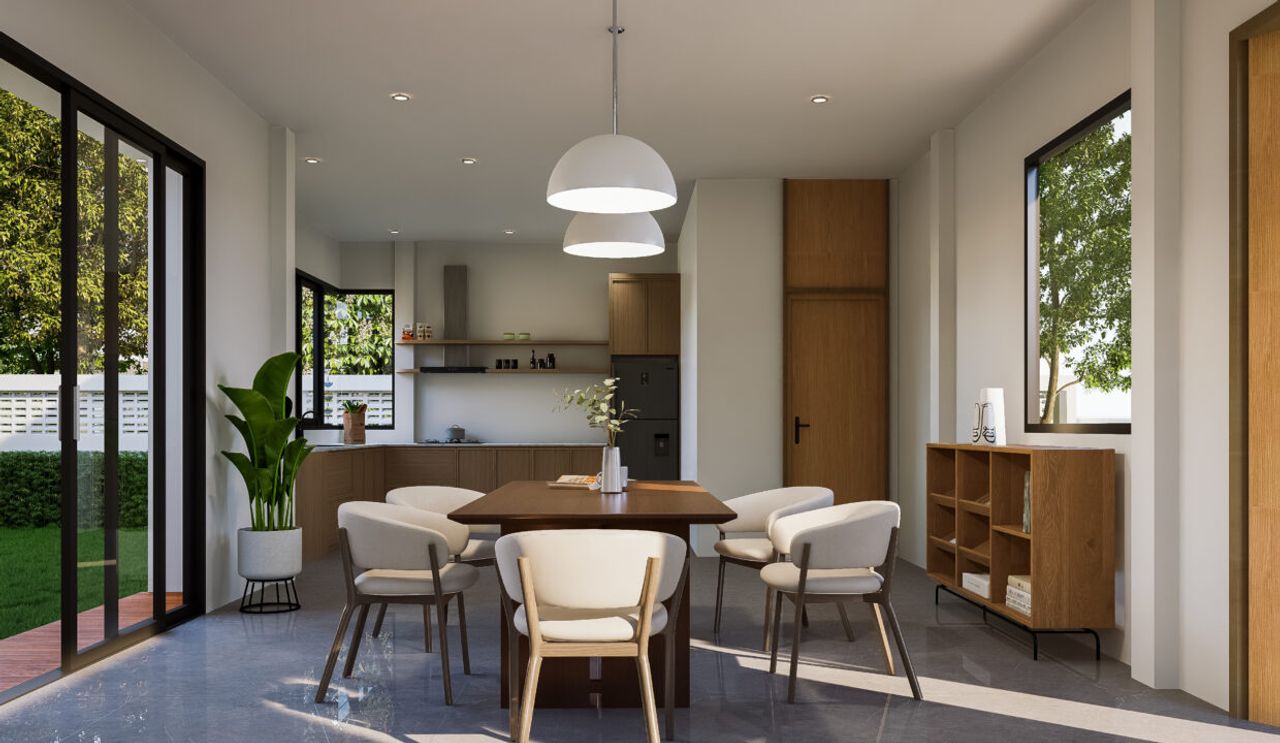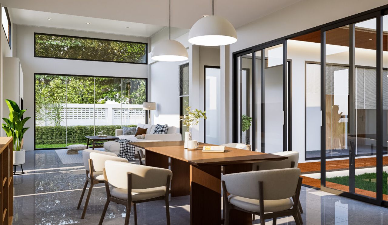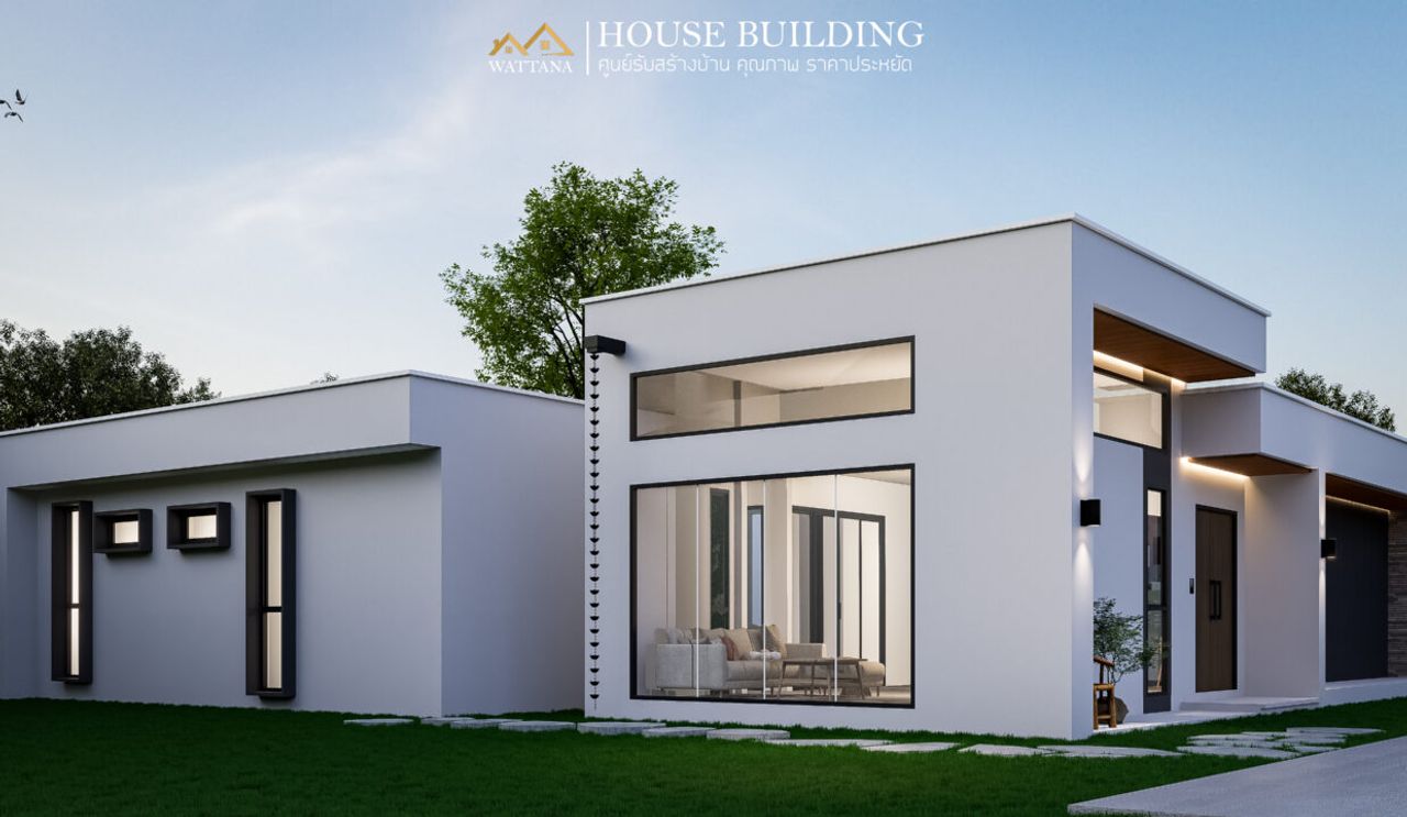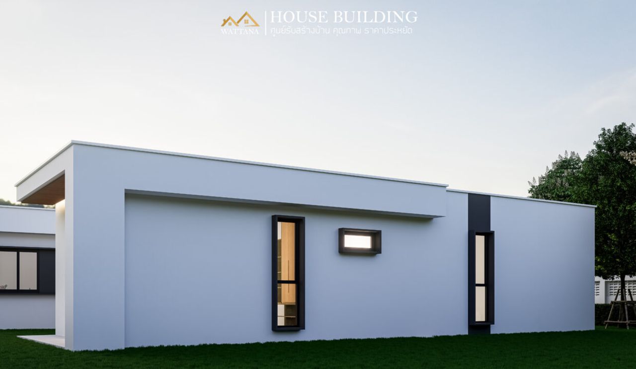 บ้านสไตล์โมเดิร์น (Modern) โดยมีส่วนกลางบ้านที่เป็นโซนนั่งเล่นที่เพดานยกสูง ต่อด้วยโซนรับประทานอาหาร เเละโซนครัวที่เป็นปัจจัยหลักที่สมาชิกในครอบครัวจะอาศัยอยู่ร่วมกันมากที่สุด ทางเจ้าของบ้านจึงต้องการขนาดใหญ่เป็นพิเศษ จึงเป็นสไตล์ที่ตอบโจทย์ต่อการใช้งานที่ต้องการความรู้สึกโปร่งโล่ง สบายและช่วยระบายความร้อนจากสภาพอากาศได้ดี เนื่องจากเป็นสไตล์ที่สวยที่เรียบง่าย และแฝงไปด้วยความทันสมัย บ้านหลังนี้มาด้วยตัวอาคารสีขาวเทาไม้ ตัดกับระเเนงไม้ลอนโค้งเพื่อเพิ่มความโดดเด่นให้กับตัวบ้าน เป็นแบบบ้านที่ผสานความเรียบง่ายเน้นการใช้งานได้จริง