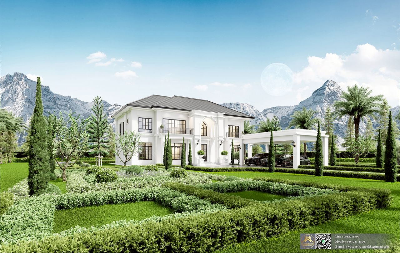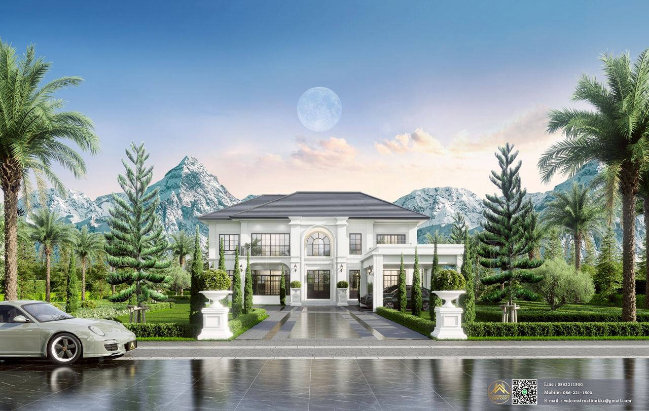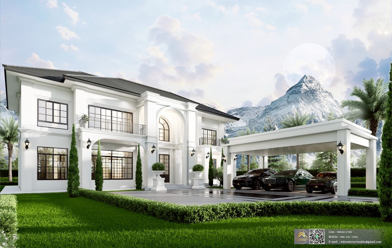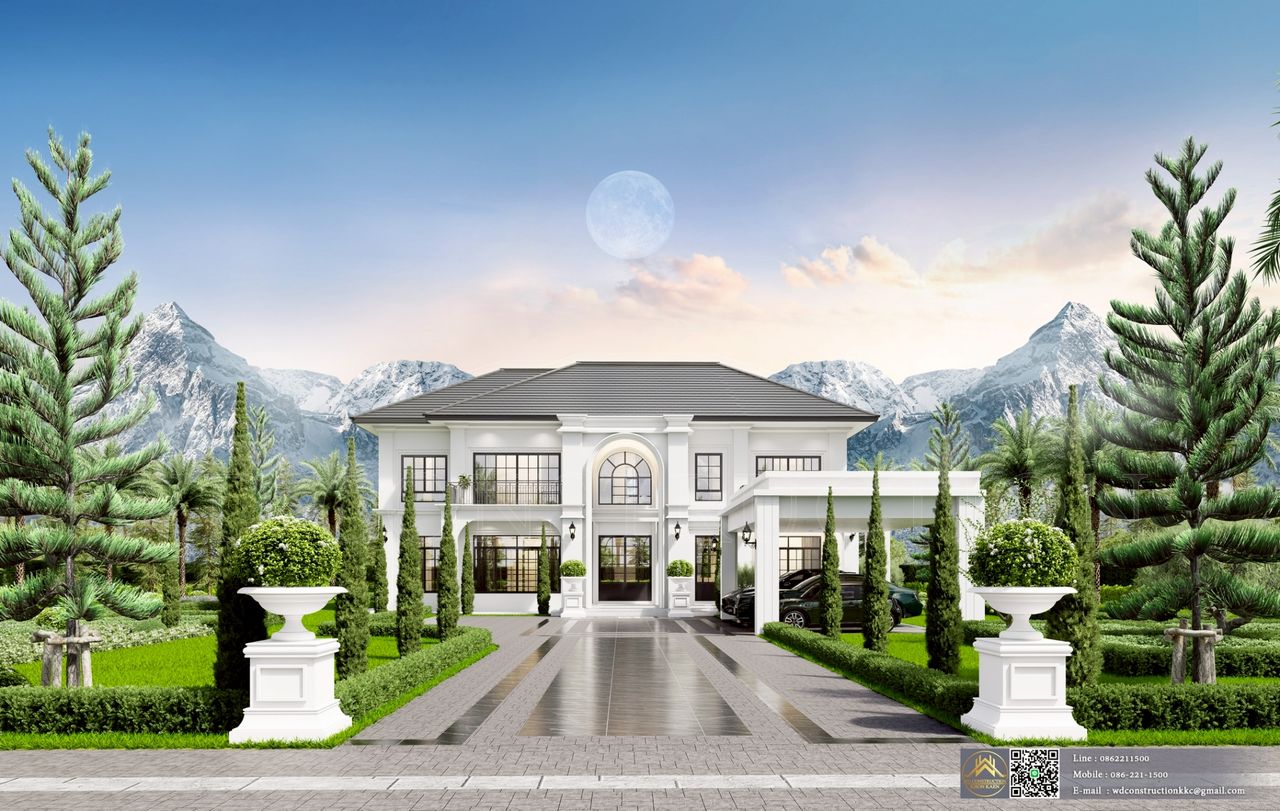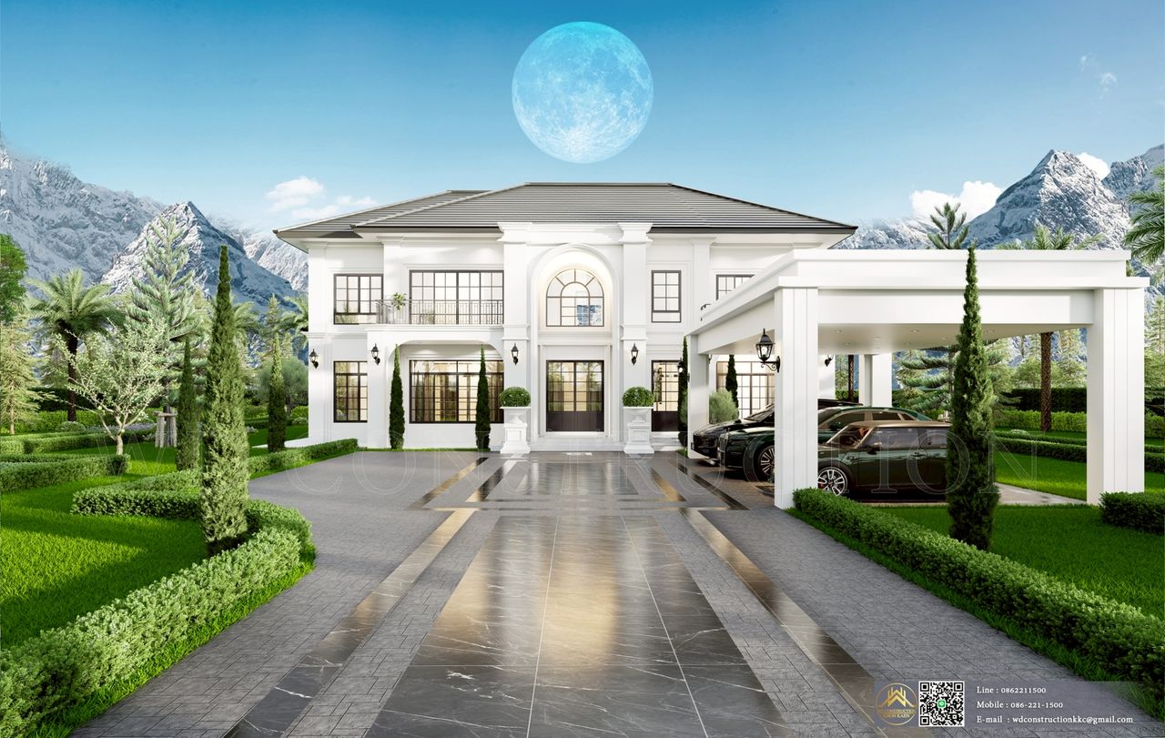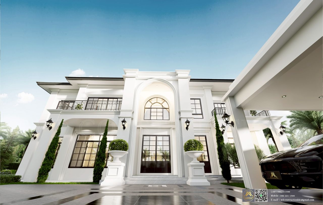 • ฟาซาดคฤหาสน์โมเดิร์นคลาสสิก เสาสูงทรงพลัง องค์ประกอบใหญ่ อลังการทุกมุมมอง
