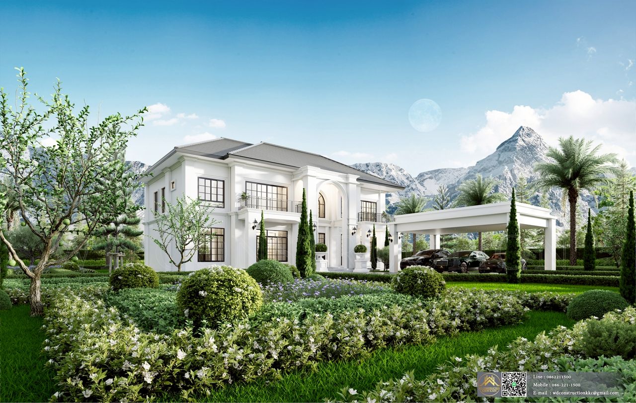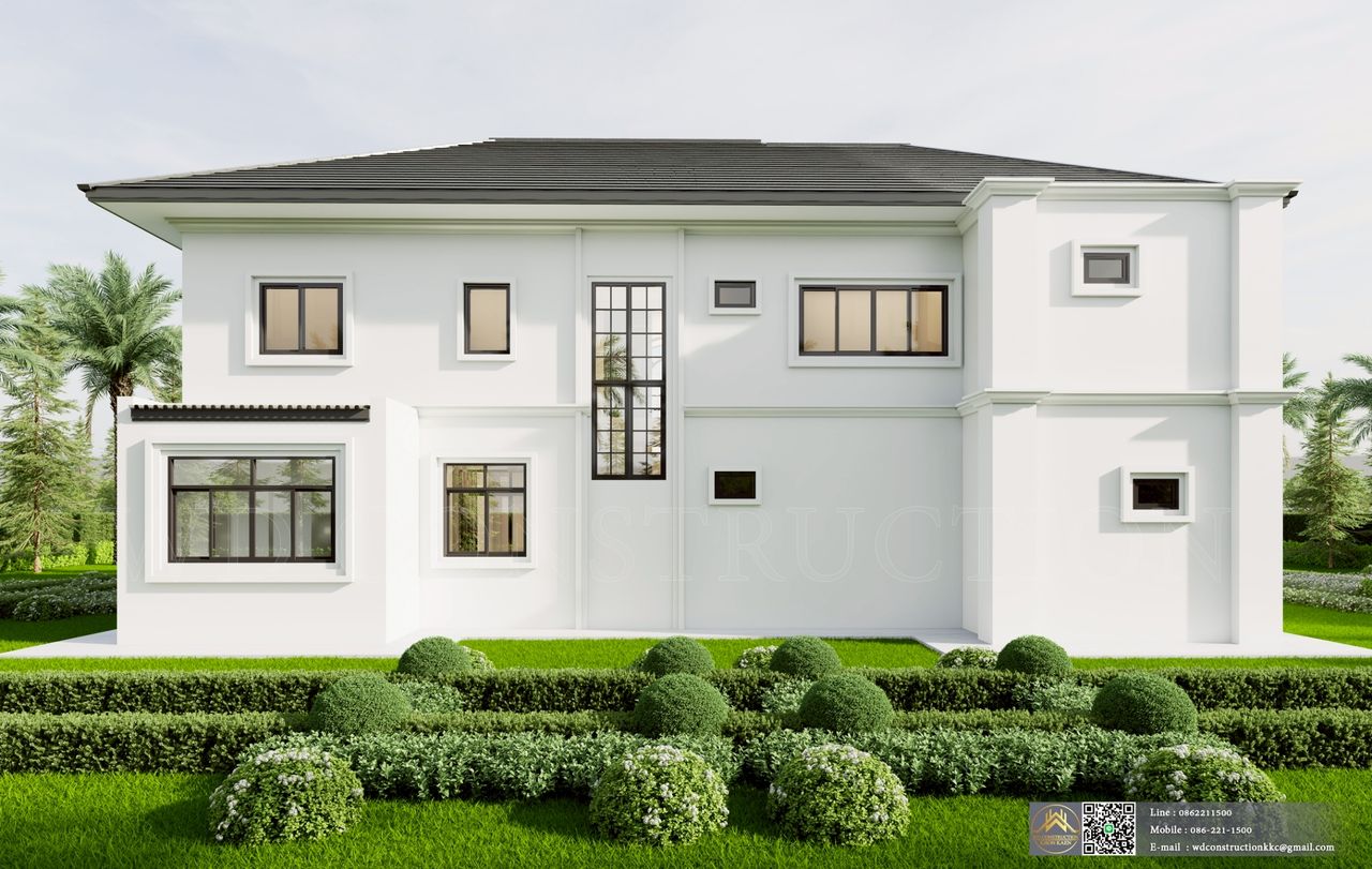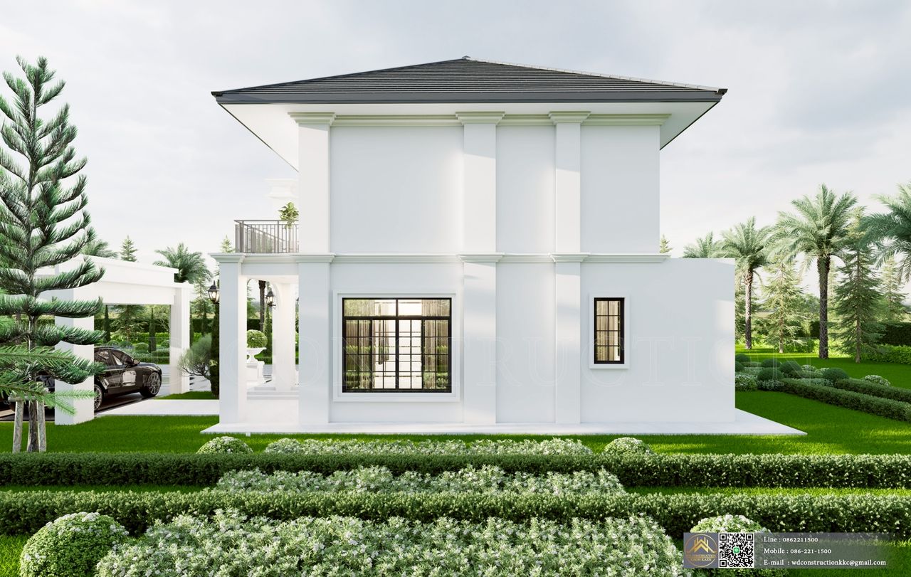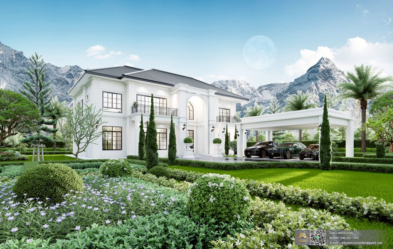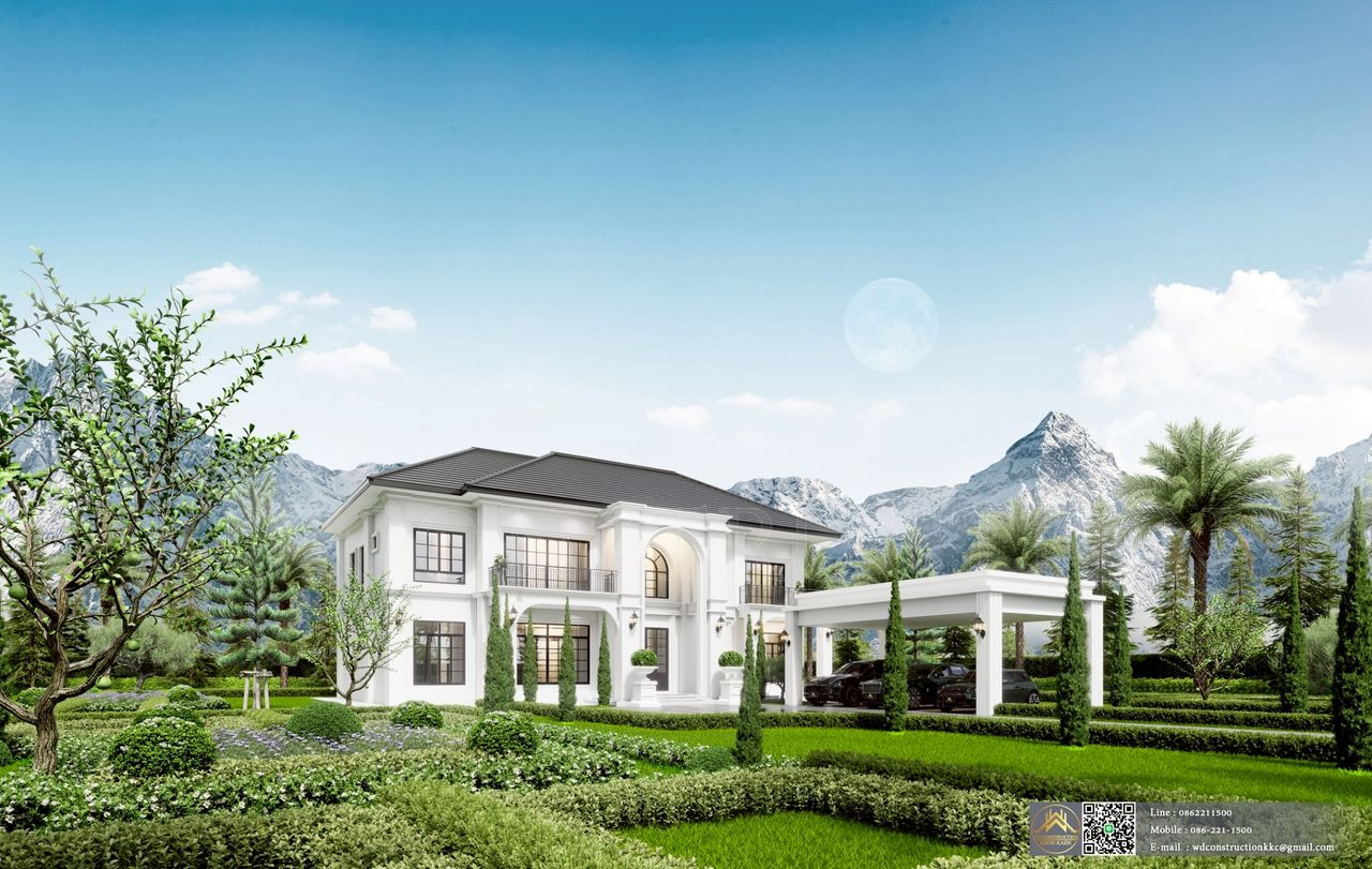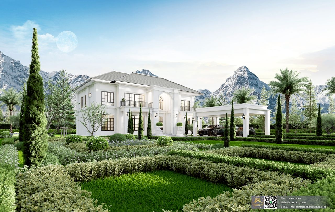 • ฟาซาดคฤหาสน์โมเดิร์นคลาสสิก เสาสูงทรงพลัง องค์ประกอบใหญ่ อลังการทุกมุมมอง