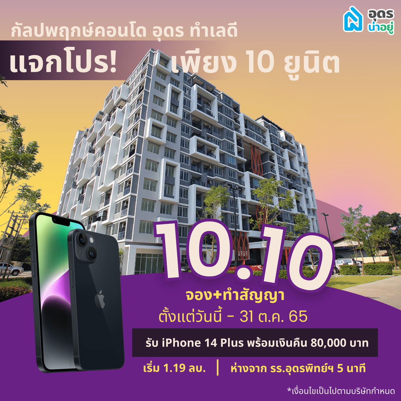 คอนโดอุดร ใจกลางเมือง ใกล้แหล่งอำนวยความสะดวกทุกสิ่ง ใกล้อุดรพิทย์ ราชินู เพียง 5 นาที เหมาะสำหรับผู้ปกครองที่กำลังหาคอนโดทำเลดี ผ่อนถูกกว่าเช่า